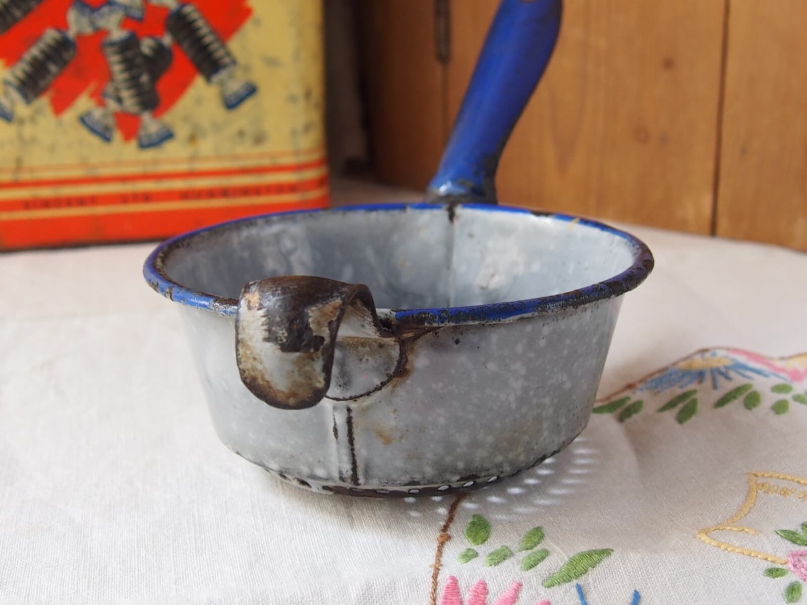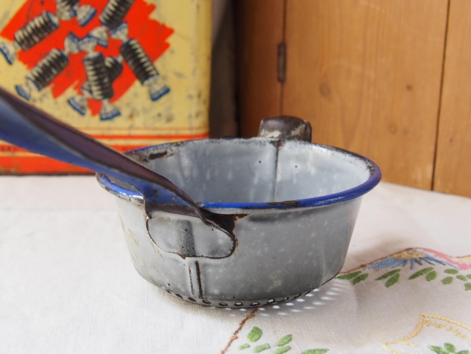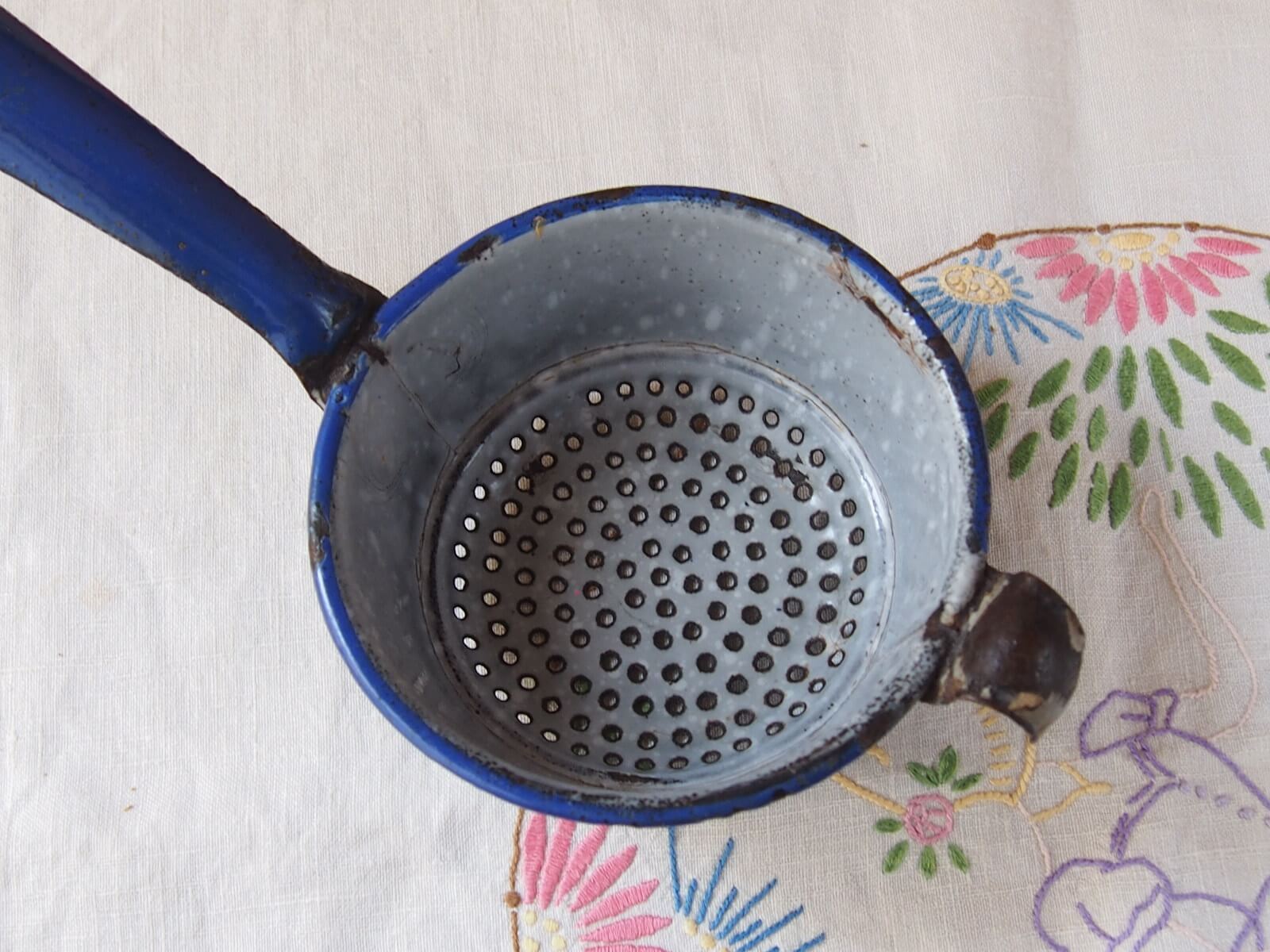 ホーロー製の片手こし器。サイズは小ぶりなタイプです。持ち手の反対側に付いているフックは、ボウルやカップの縁に引っかけるためのものです。ホーローの色合いや艶・質感など、渋く良い雰囲気がでています。キッチンディスプレイに如何でしょうか。。年代からくる汚れやホーロー欠け・サビ・キズなどは見られます。