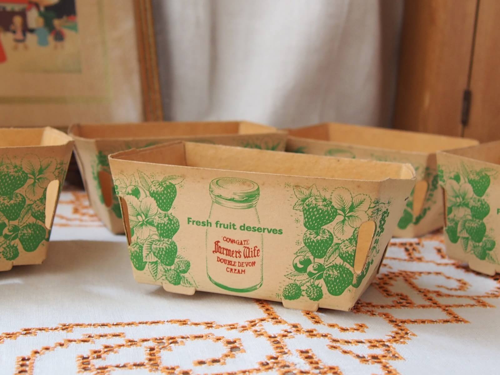推定1950~60年代・イギリス。Cow&Gate double devon cream bottleの絵柄が入った広告ペーパートレイ5個セット。古い紙ものならではの味わい深さを感じることが出来ます。テーブルやデスクに置くだけで、可愛らしいアクセントになること間違いなし!五つとも状態は同程度です。年代からくる汚れや変色・シミなどは見られますが、目立ったダメージはありません。