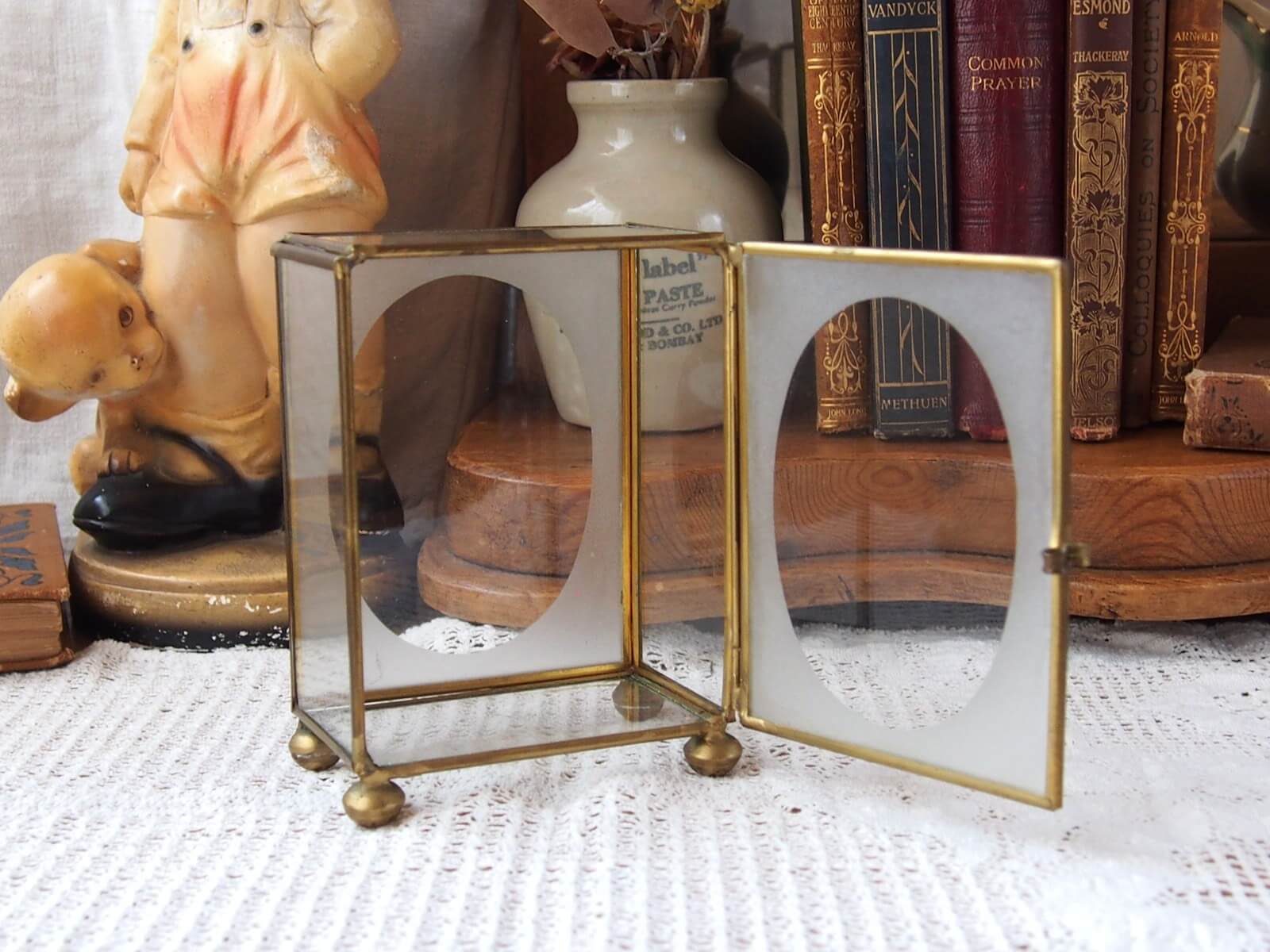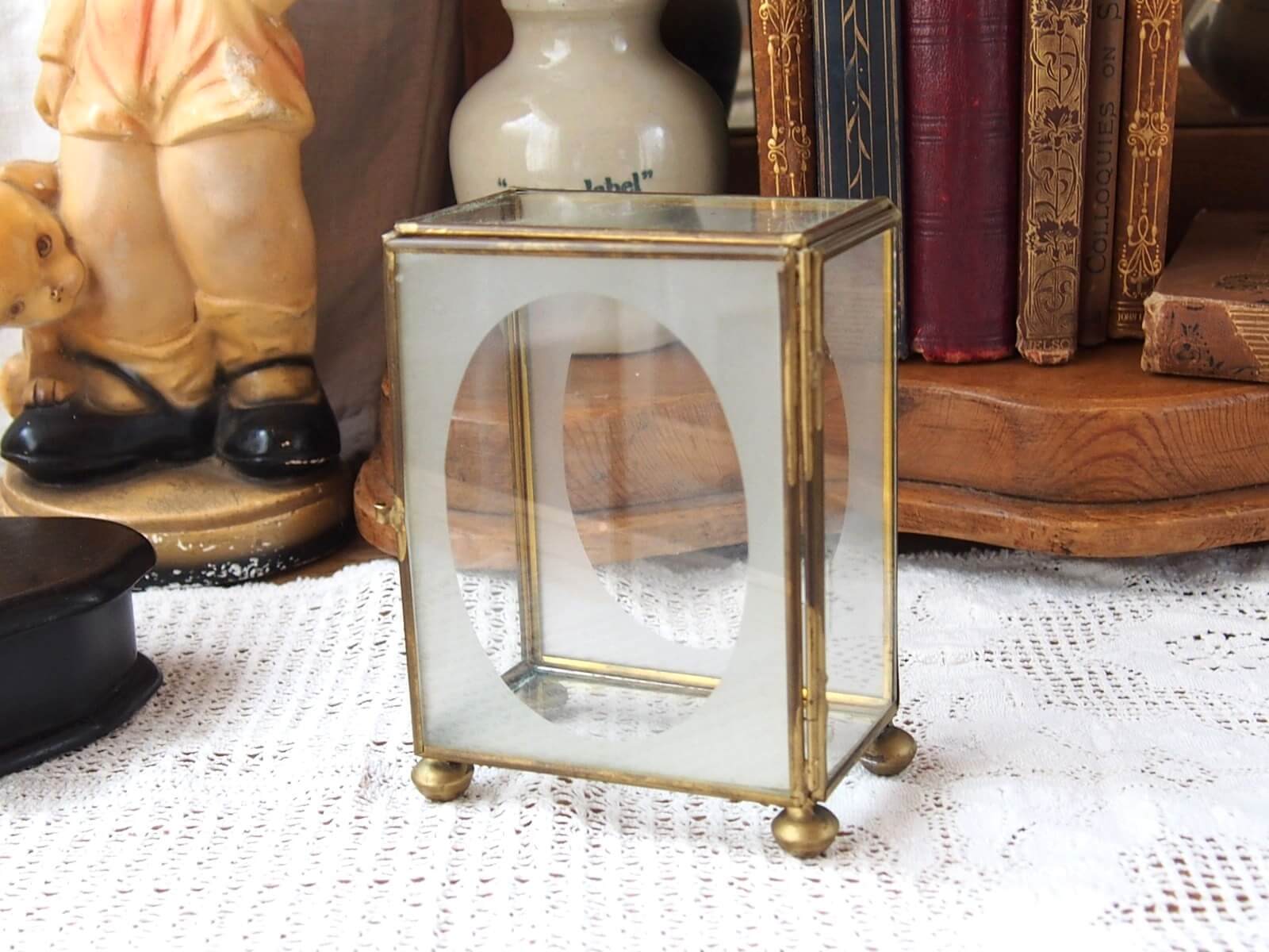 真鍮フレームとガラスが美しく調和した小型のディスプレイケースです。ミニチュアフィギュアやコレクターズアイテムの展示に最適です。シンプルなデザインながら、クラシックで優雅な印象を与え、スタイリッシュなアクセントを加えます。年代からくる汚れや細かいキズ・変色などは見られますが、大きなダメージはありません。