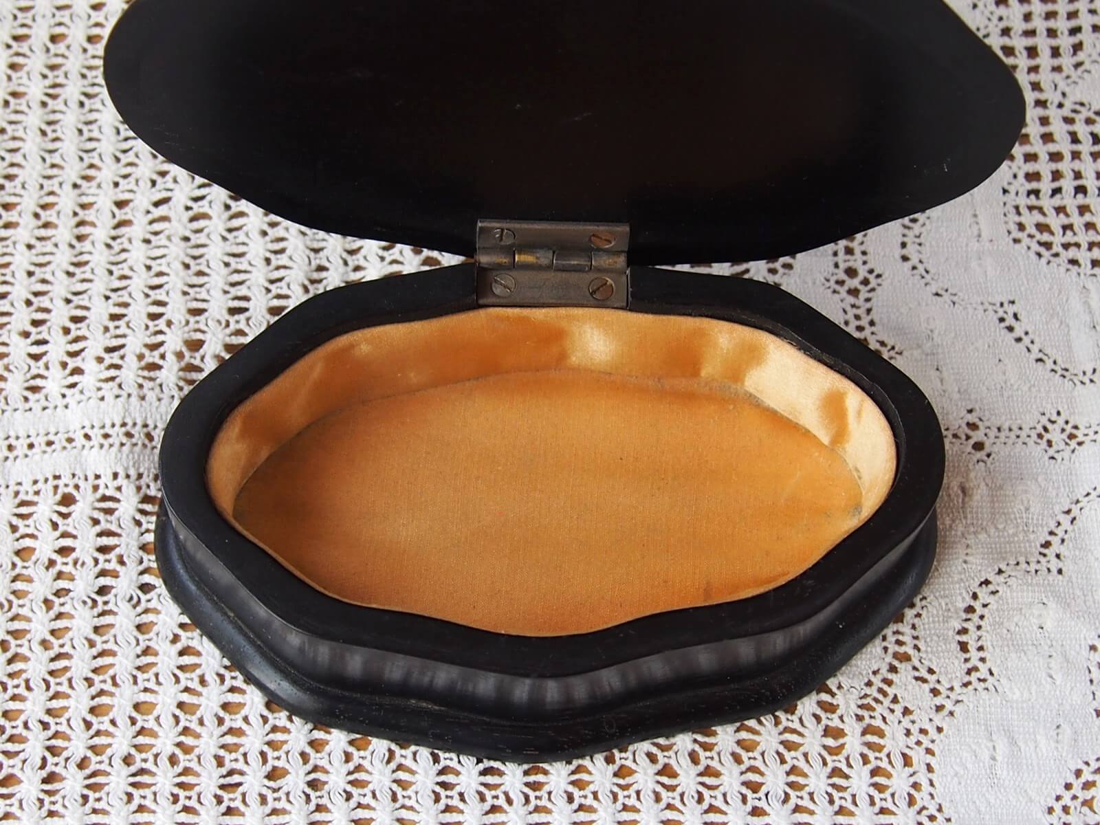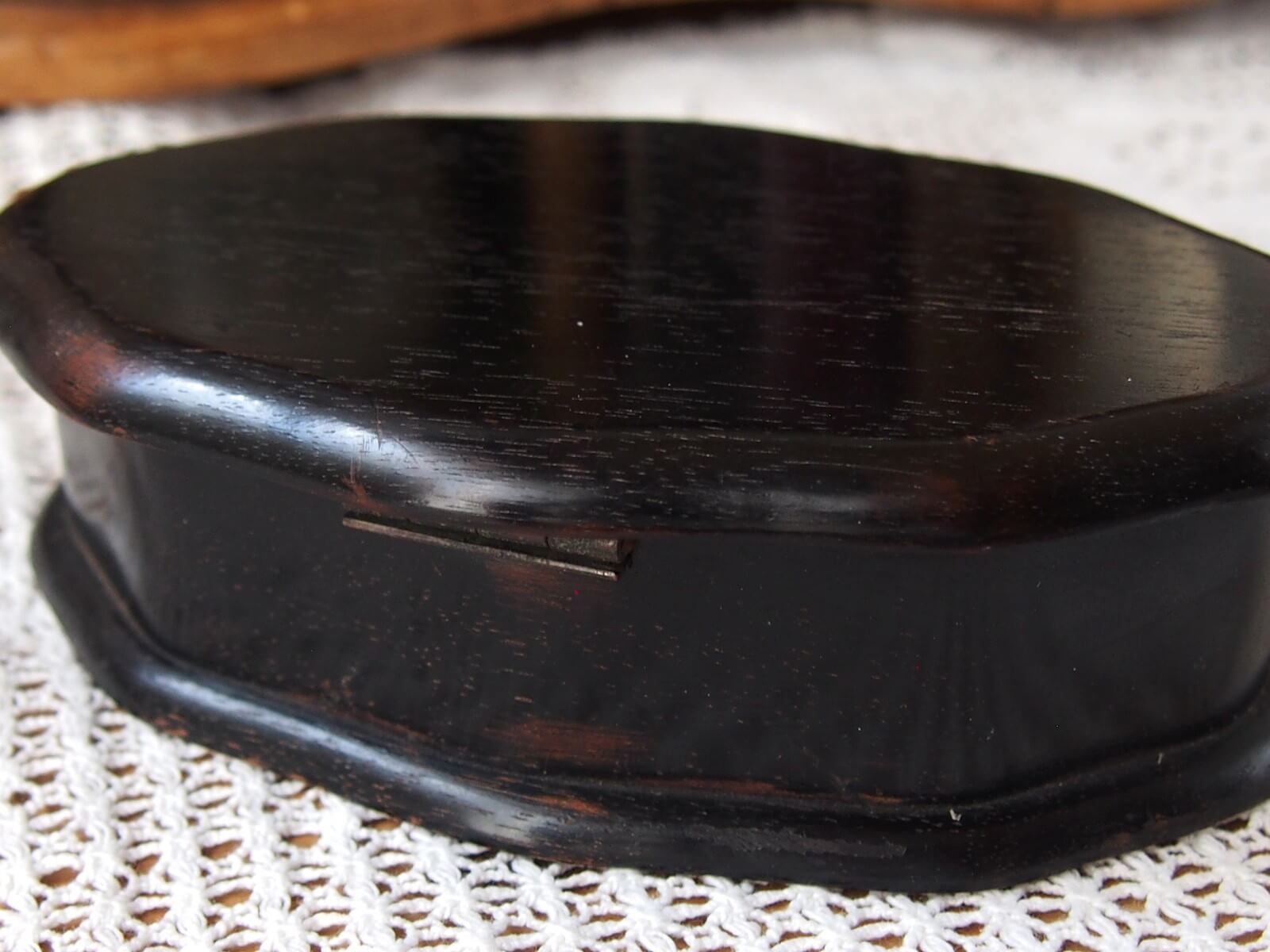 推定1900~20年代・イギリス。スタイリッシュな小型の木製ジュエリーボックス。おそらく材質は黒檀で、深い黒色に光沢もややあり高級感と優雅さを醸し出しています。内側のシルク生地もきれいに残っています。指輪やイヤリングなどの小さな装身具の収納に最適だと思います。蓋と本体はヒンジで連結されています。年代からくる汚れやキズなどは見られますが、大きなダメージはありません。
