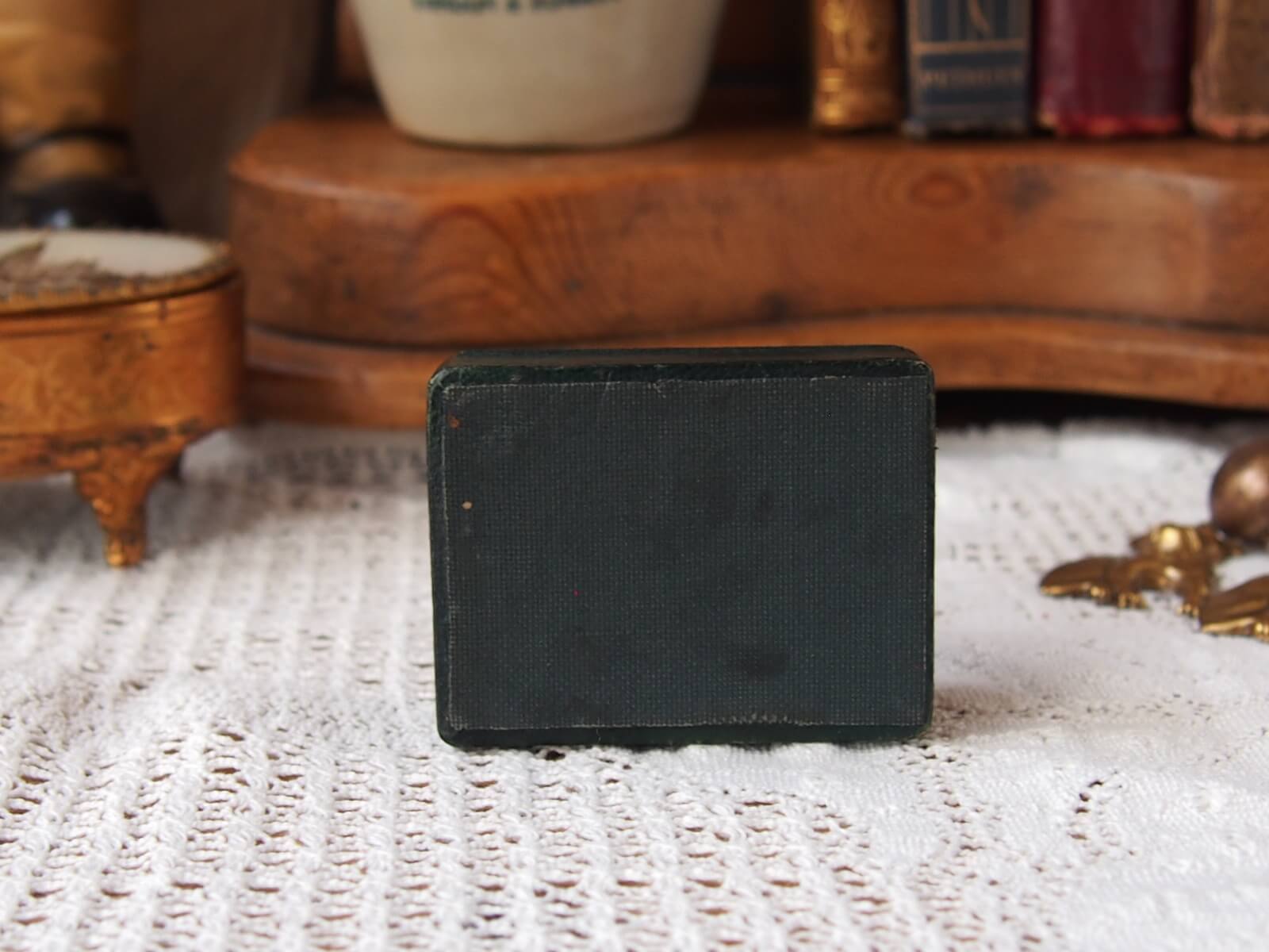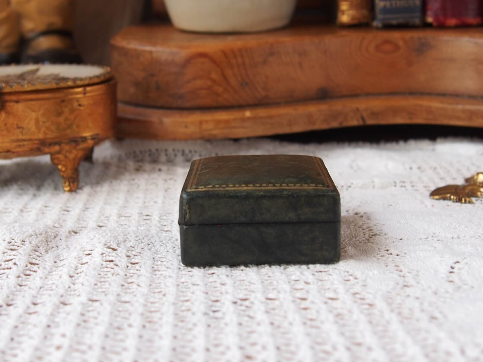 イギリス。この美しいジュエリーボックスは、落ち着きあるグリーンが特徴で気品漂う小箱です。シンプルながらも上品な雰囲気で、指輪やピアスなどの小さな装身具の収納にお使い頂けると思います。小さいながらも存在感のある佇まいです。年代からくる汚れやキズ・シミなどは見られますが、目立ったダメージはありません。