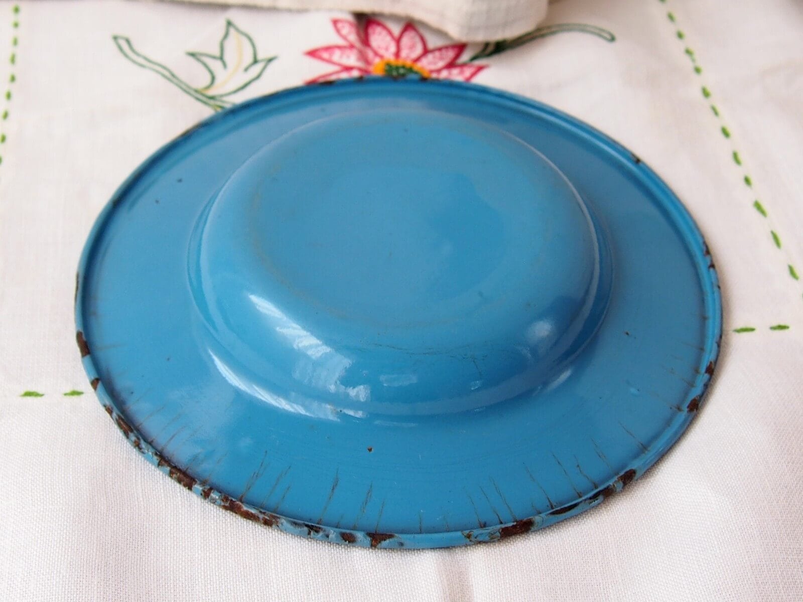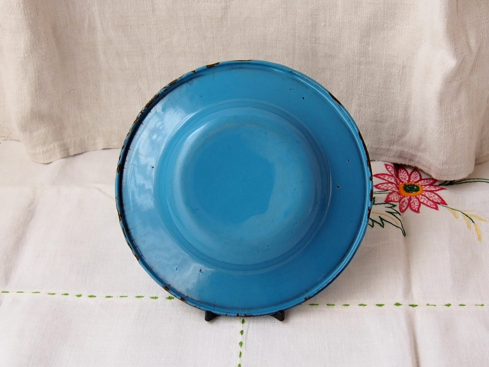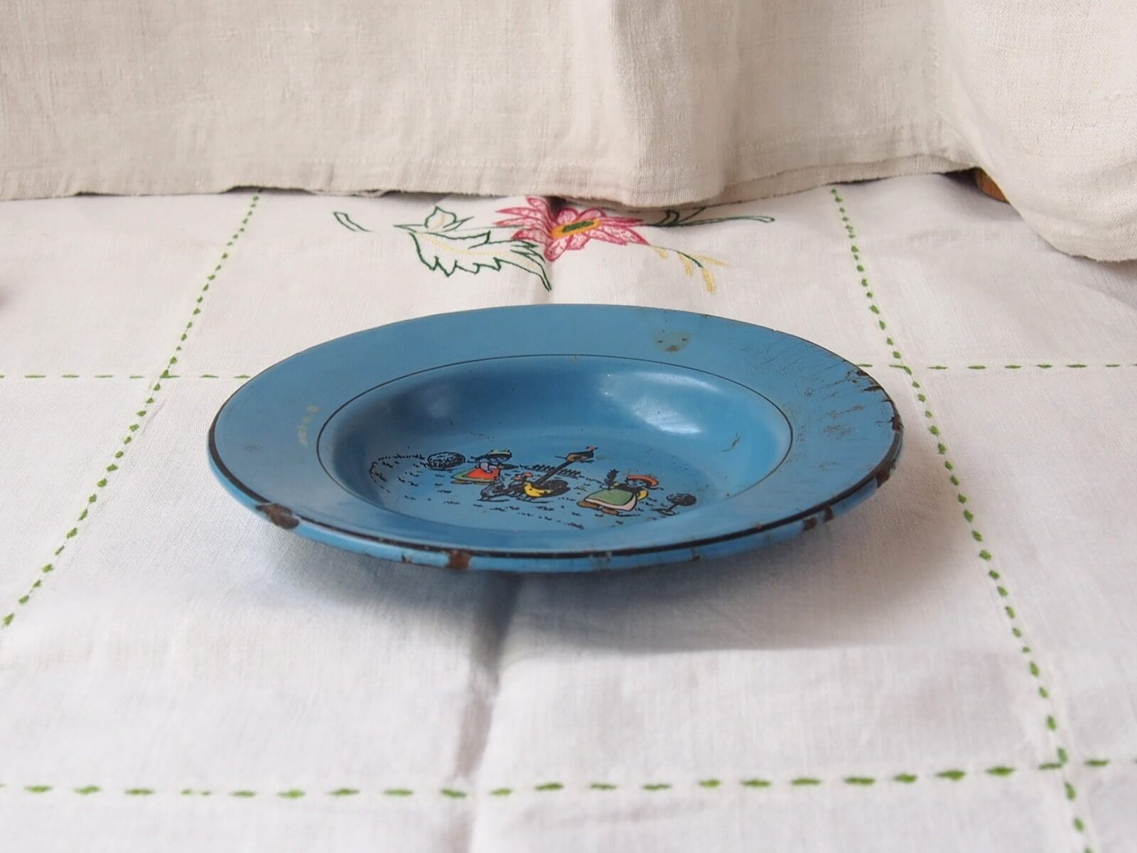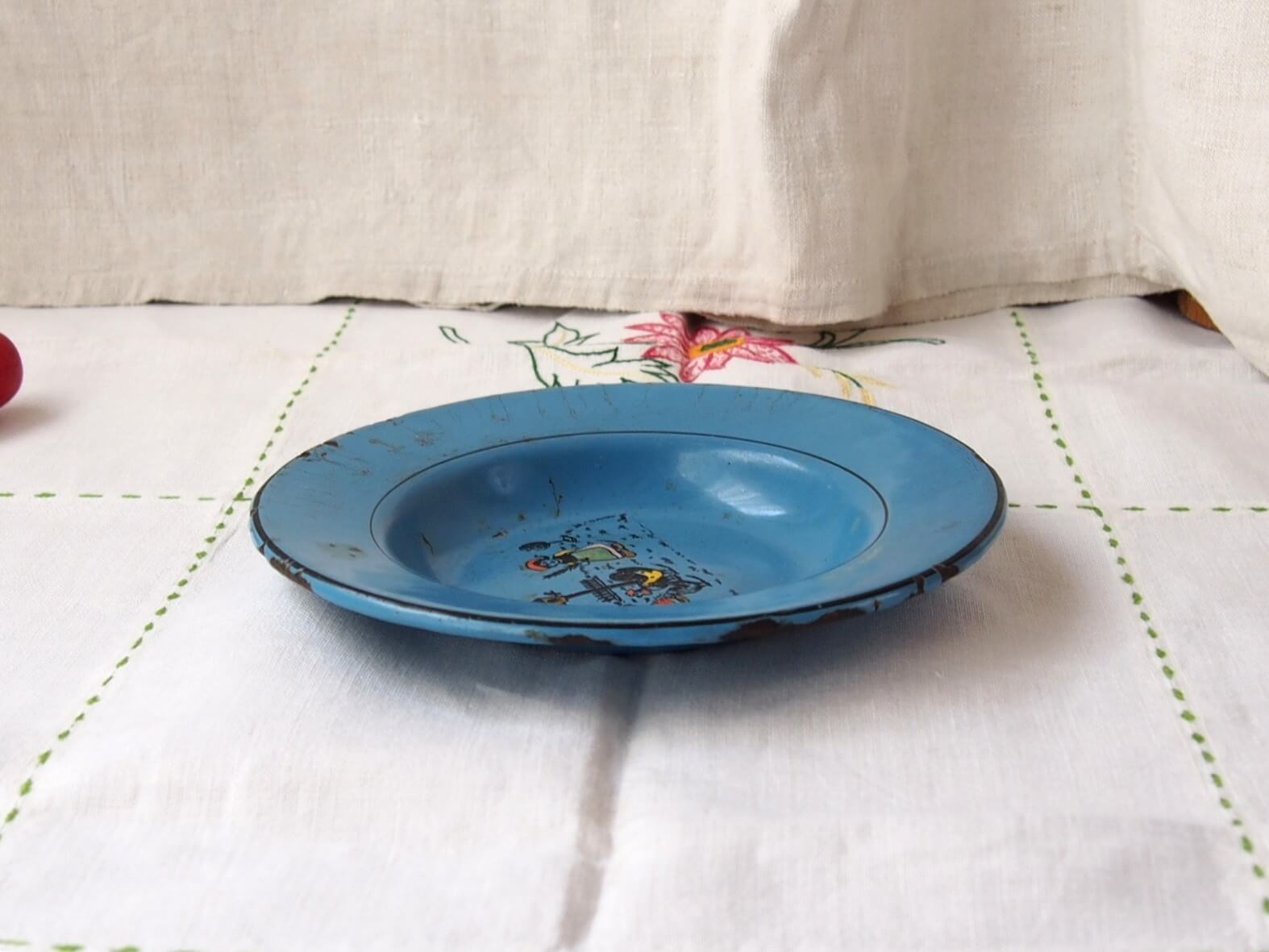 推定1930~50年代・生産国不明。子供用のエナメルプレート/ボウル。愛らしいデザインで、レトロな雰囲気が特徴的です。小ぶりでやや深さのあるお皿です。刻印はありませんが、ドイツ製かもしれません。年代からくる汚れやキズ・シミ・ホーローの欠けなどは見られます。