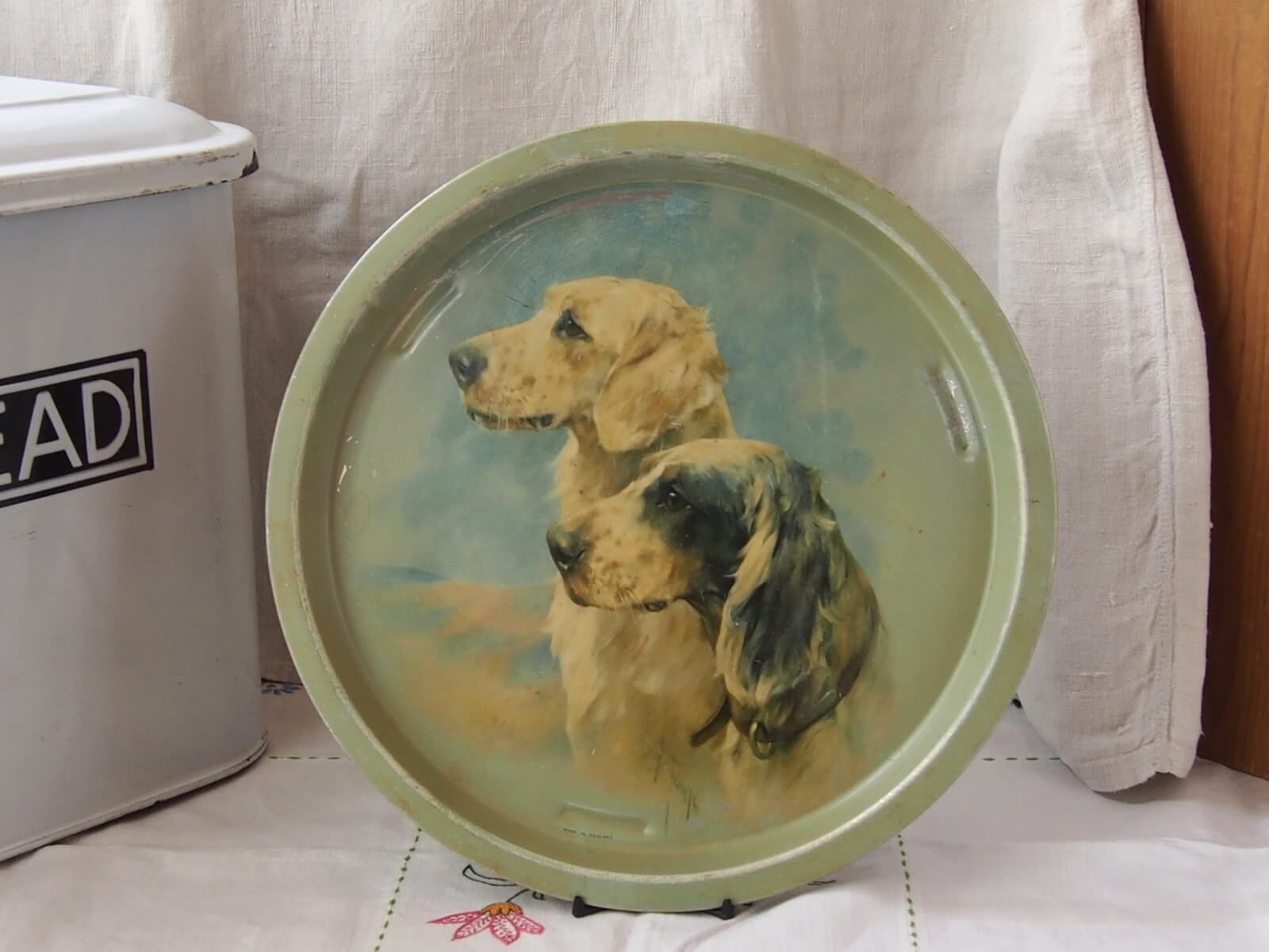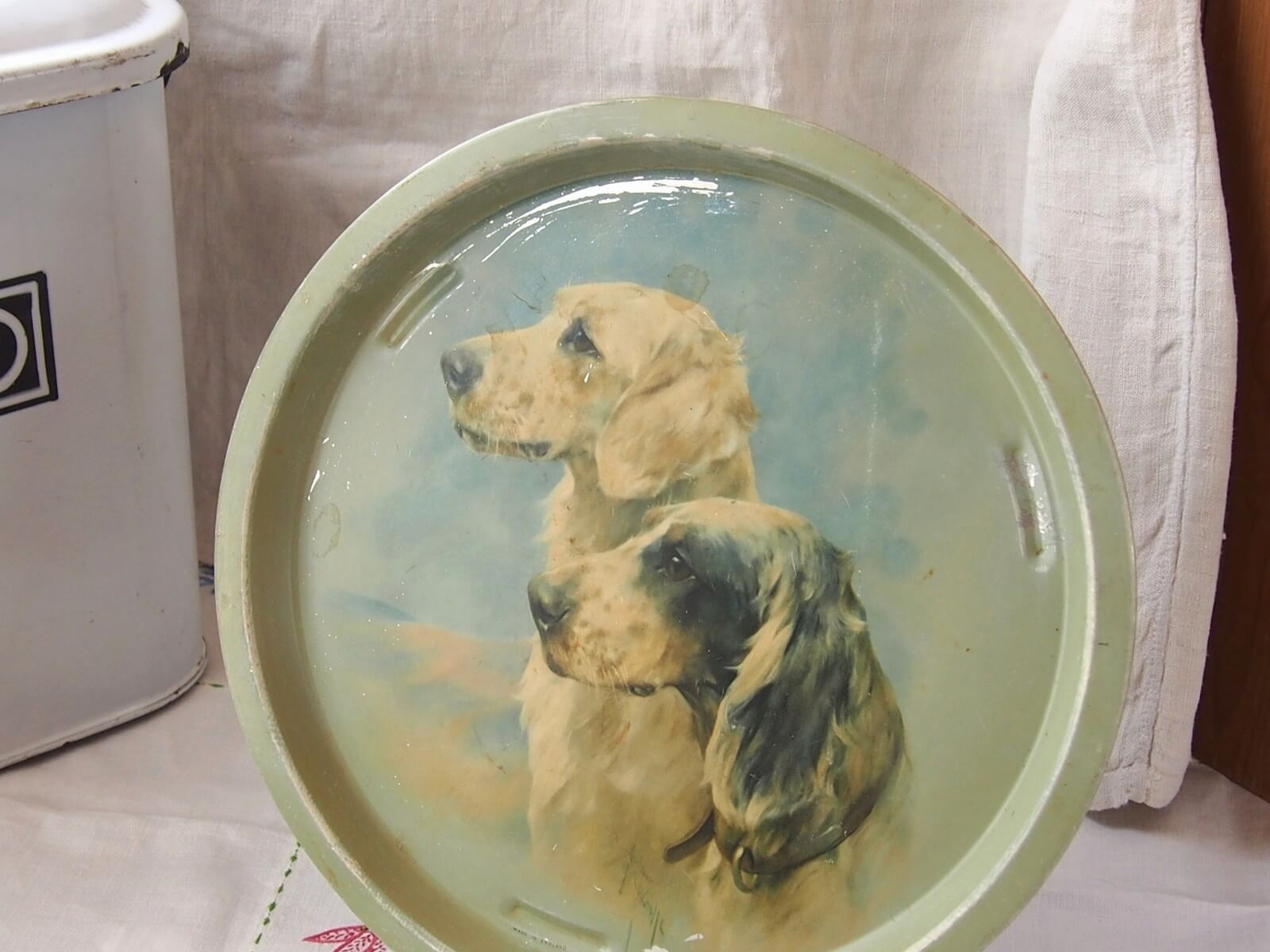推定1940~60年代・MADE IN ENGLAND。美しい犬の絵画が印刷された丸型ティントレイ。独特な色合いでレトロな雰囲気たっぷりです。軽くて使いやすいのも便利です。年代からくる汚れや細かいキズ・ペイントの剥がれなどは見られますが、雰囲気を損なわず大きなダメージではないと思います。