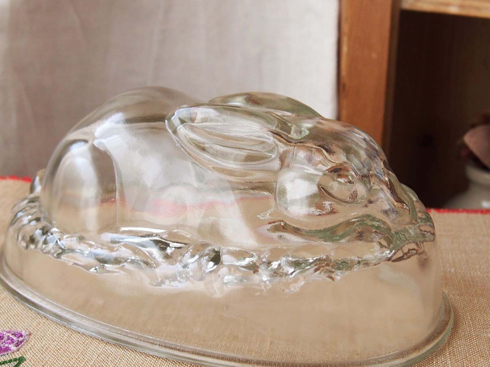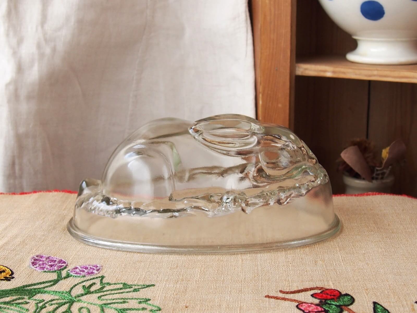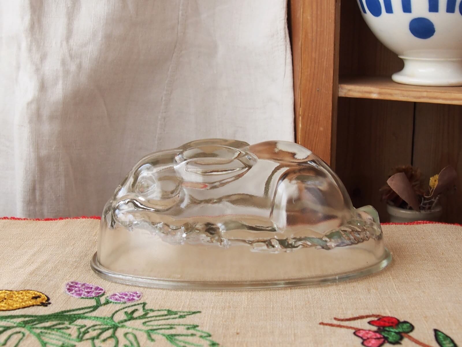 推定1940~50年代・イギリス。とっても可愛いうさぎのゼリーモールドです。出来上がったゼリーを想像しただけでも楽しいですね♪ 逆さにしても倒れないようになっています。この魅力的なゼリーモールドは、飾るだけでもその存在感を発揮します。。細かいキズや極小チップなどは見られますが、気になるダメージはなく良い状態です。
