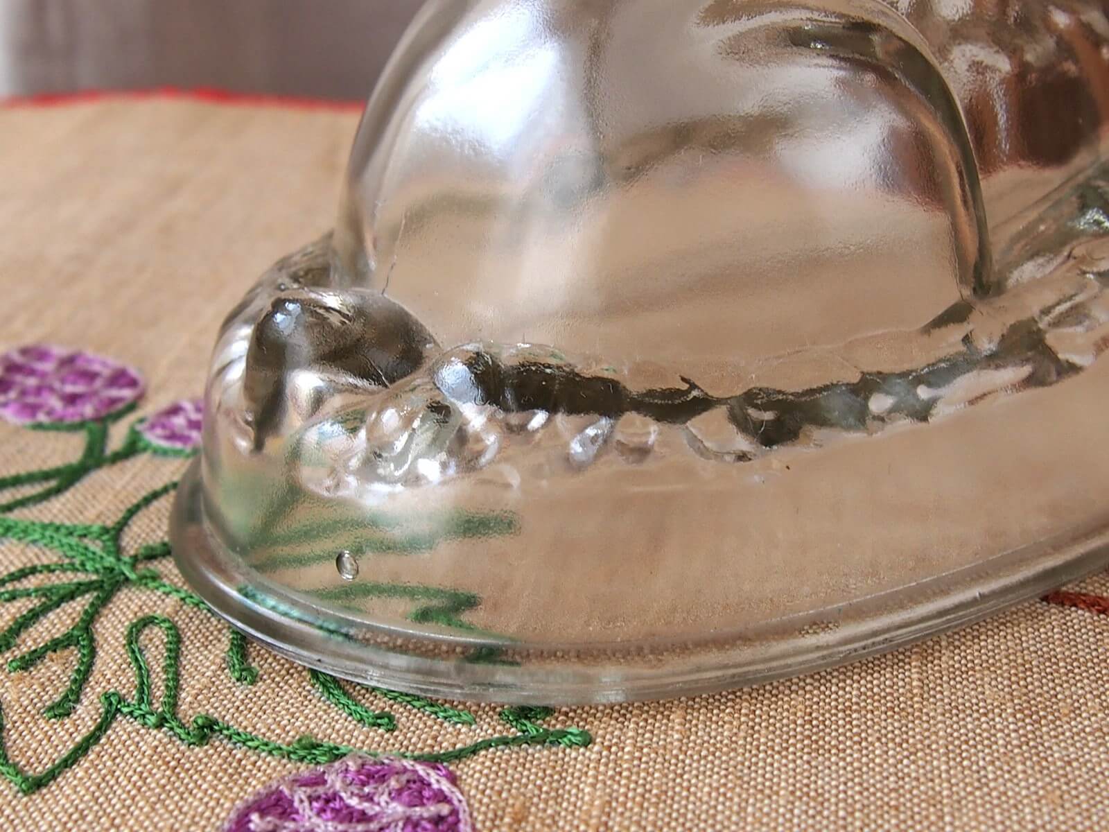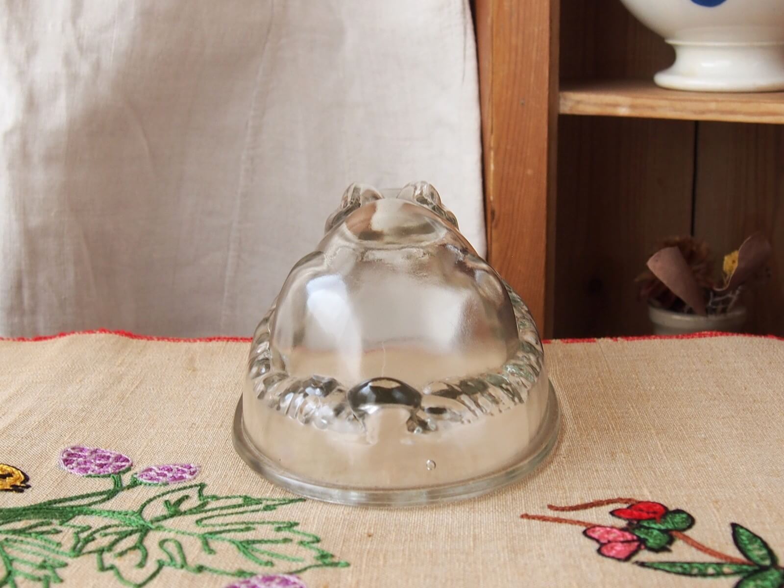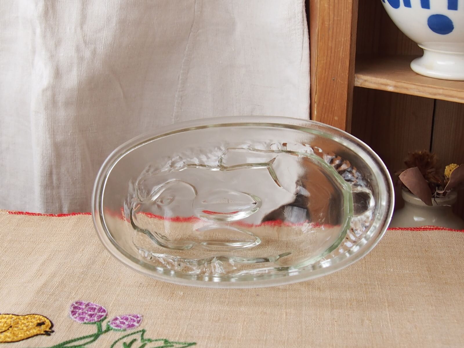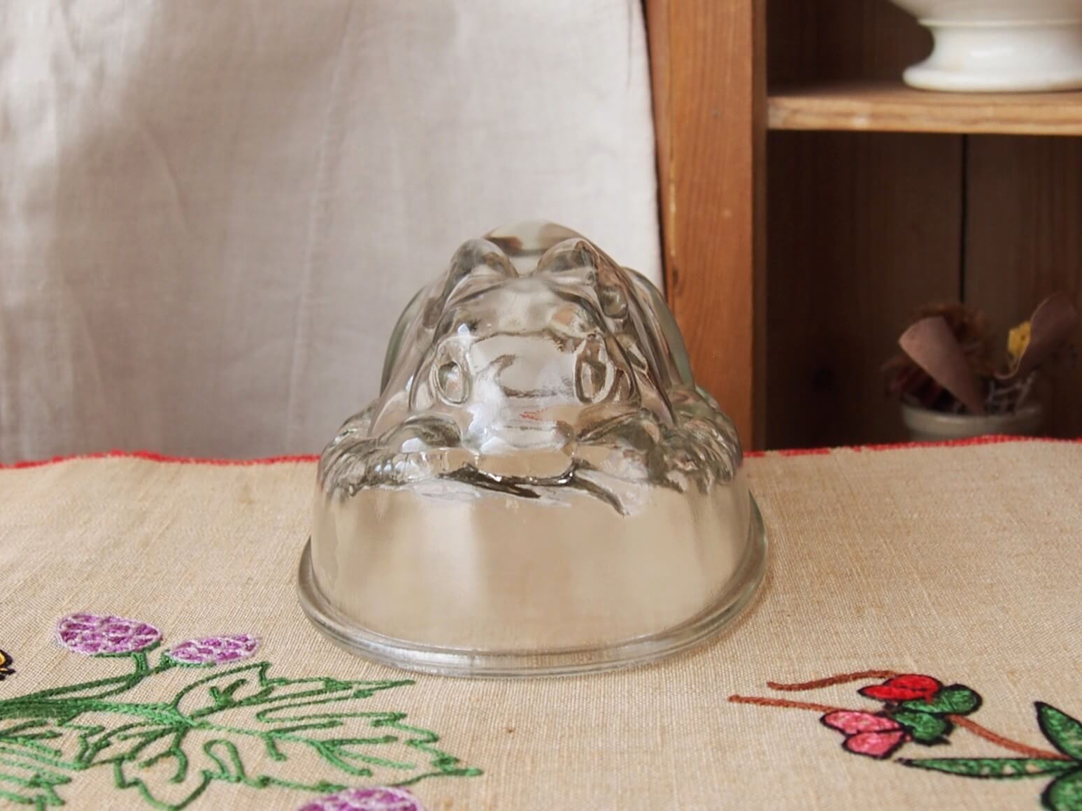 推定1940~50年代・イギリス。とっても可愛いうさぎのゼリーモールドです。出来上がったゼリーを想像しただけでも楽しいですね♪ 逆さにしても倒れないようになっています。この魅力的なゼリーモールドは、飾るだけでもその存在感を発揮します。。細かいキズや極小チップなどは見られますが、気になるダメージはなく良い状態です。