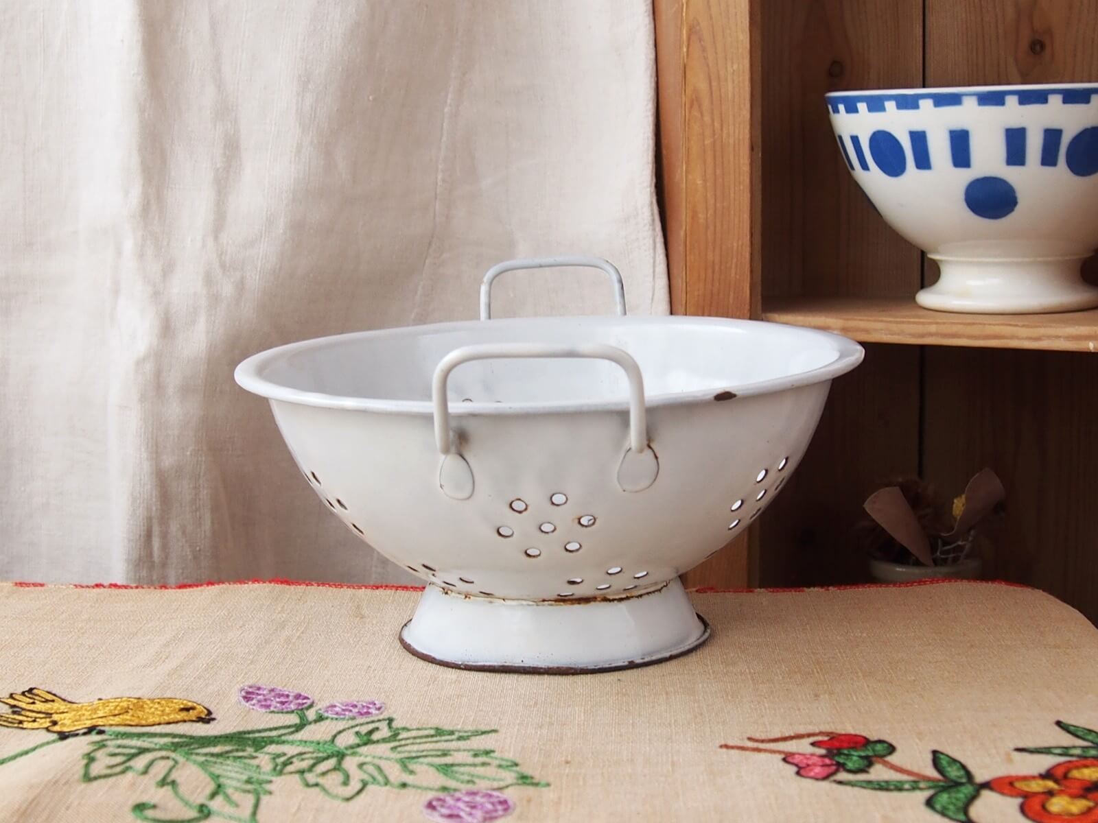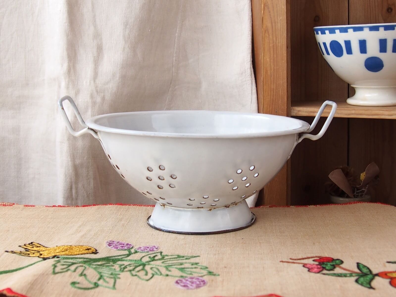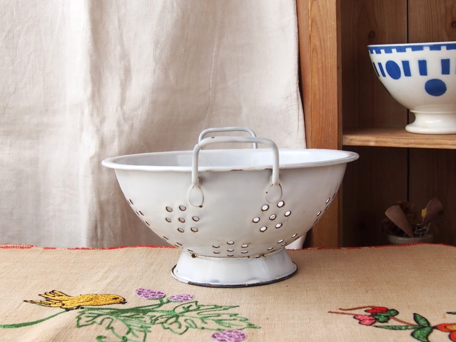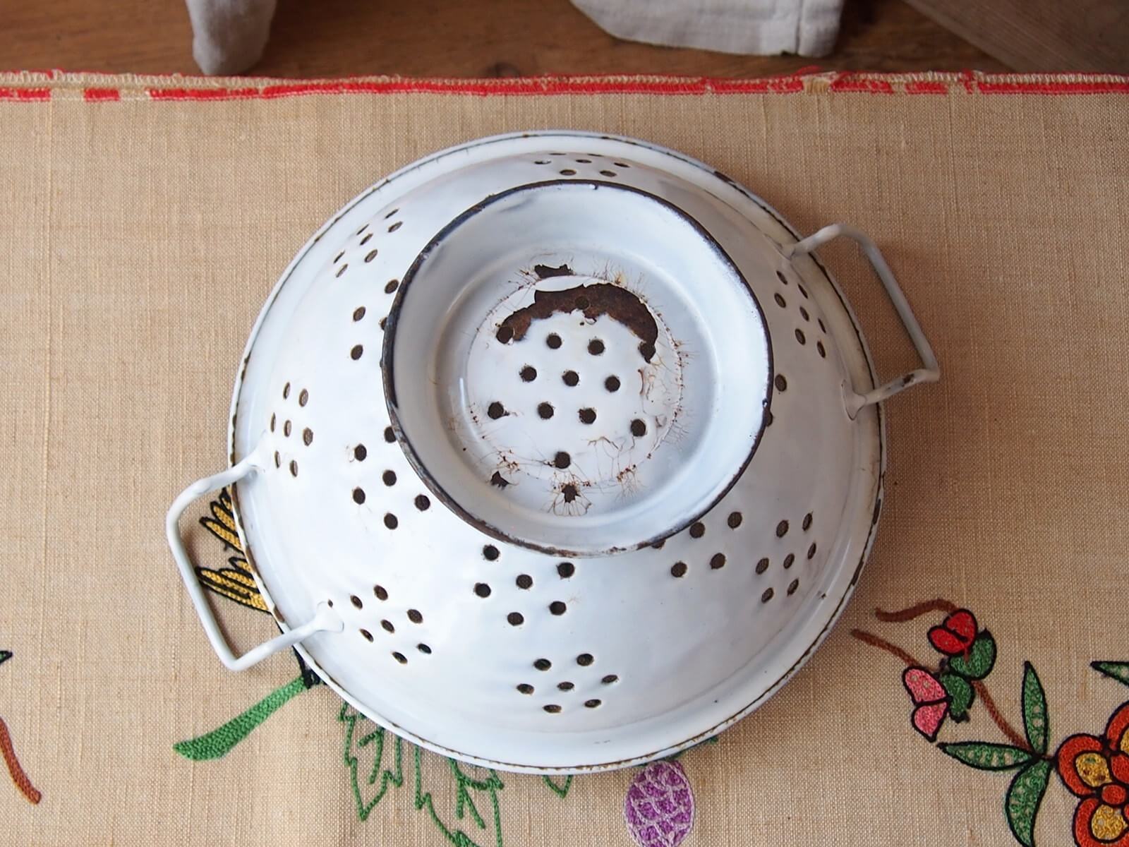 推定1930~50年代・イギリス。野菜の水切りなどに使われていた道具、ボウルには水切り穴があります。ボウル部分が土台に、左右非対称(斜め)に取り付けられていて時代を感じます。ナチュラルで素敵なキッチン空間を作ってくれそうです♪ お花を飾ったりフルーツバスケットにしたりと、いろいろな使い方が出来そうです。年代からくる汚れやキズ・ホーローの欠け・さびなどは見られますが、大きなダメージはありません。