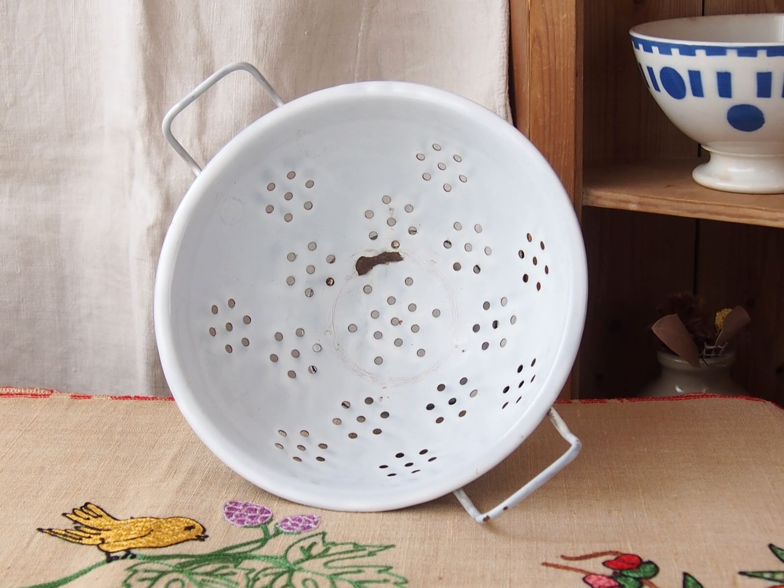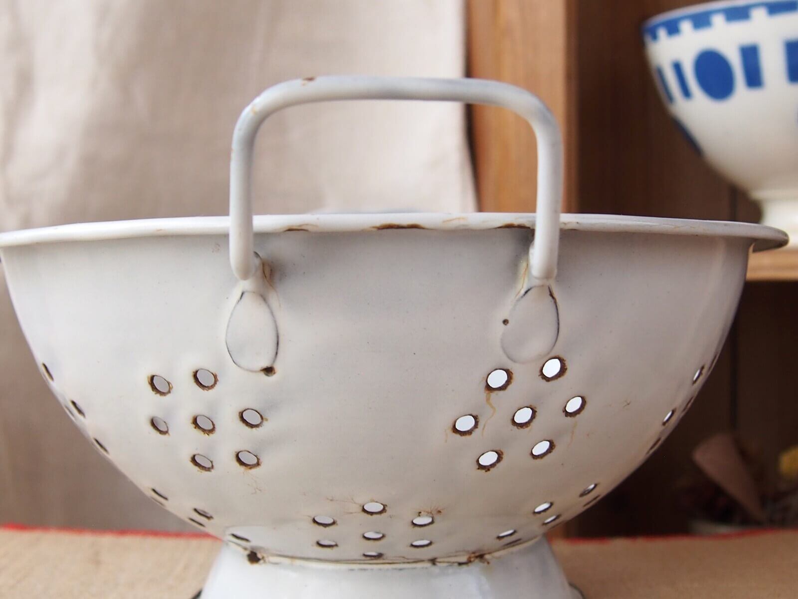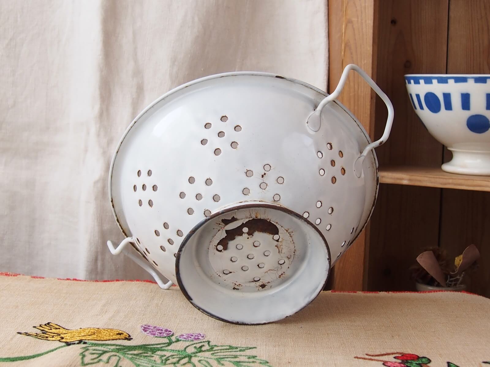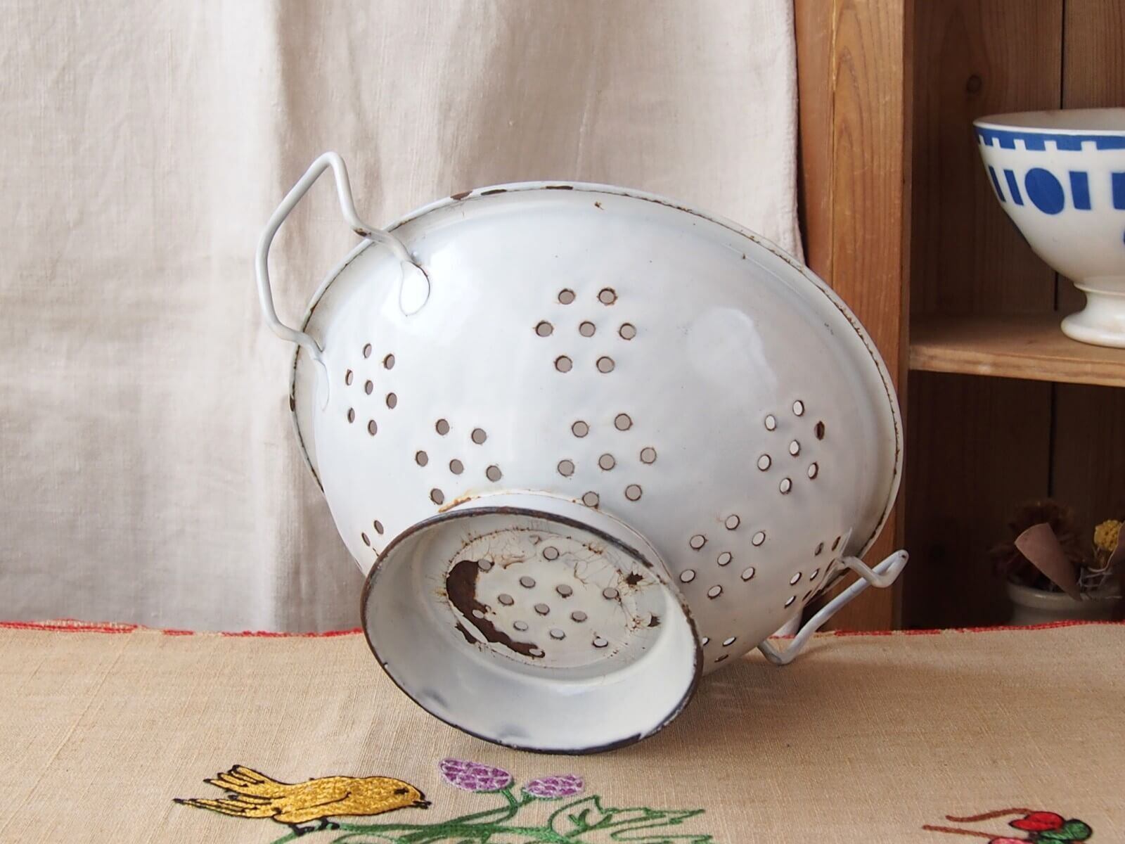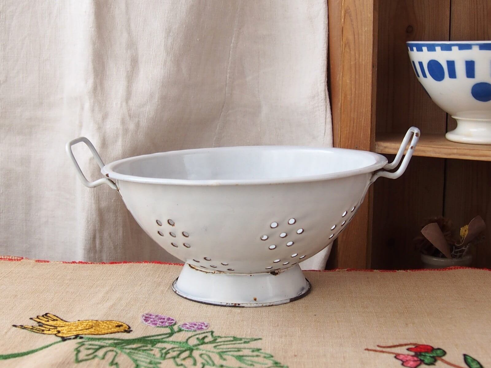 推定1930~50年代・イギリス。野菜の水切りなどに使われていた道具、ボウルには水切り穴があります。ボウル部分が土台に、左右非対称(斜め)に取り付けられていて時代を感じます。ナチュラルで素敵なキッチン空間を作ってくれそうです♪ お花を飾ったりフルーツバスケットにしたりと、いろいろな使い方が出来そうです。年代からくる汚れやキズ・ホーローの欠け・さびなどは見られますが、大きなダメージはありません。