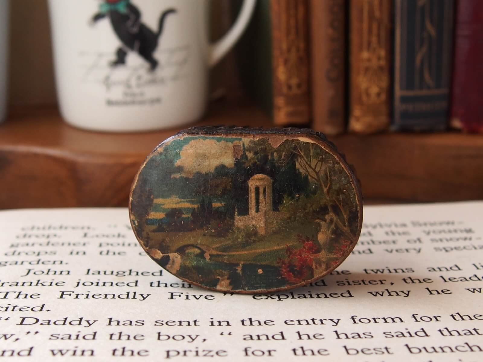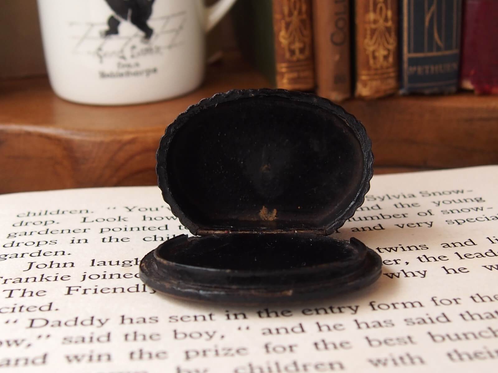 19世紀・イギリス。蓋に素敵な絵柄が入ったこちらの小箱は、嗅ぎタバコを入れるスナッフボックス。パピエマシェで巧みに作られています。ポケットに収まるサイズ感と美しいデザインが特徴で、独特の存在感を放つお品です。年代からくる汚れやキズ・さび・欠けなどが見られますが、目立ったダメージはありません。蓋の開閉は問題ありません。