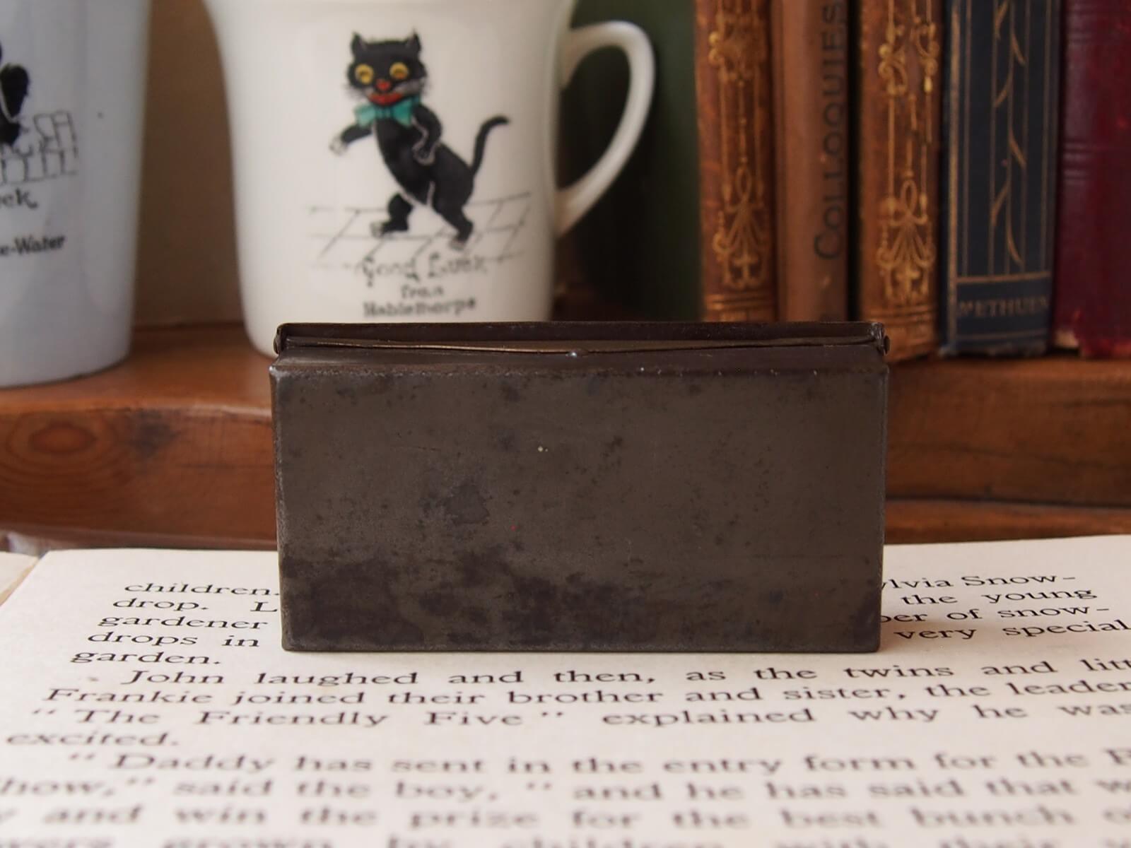 イギリスで出会ったこちらのメタル製の小箱は、切手を収納するための古いスタンプボックス。蓋にはバラと思われる花柄の装飾が施されています。切手を取りやすいように仕切りと傾斜がついています。内側のトレイ部分は真鍮製だと思います。指輪やピアスなどの小さな装身具の収納、書斎やデスクのアクセントとしても最適なアイテムです。渋い一品です!年代からくる汚れや細かいキズ・変色などは見られますが、目立ったダメージはありません。