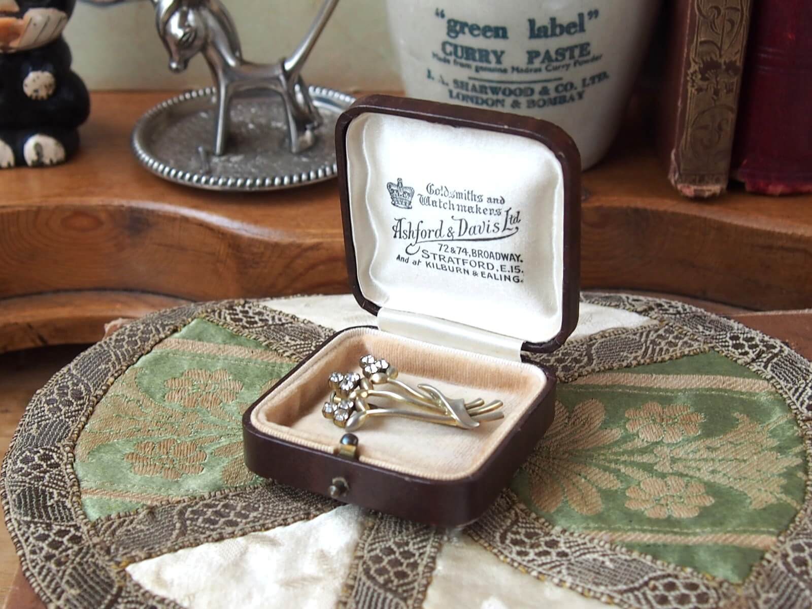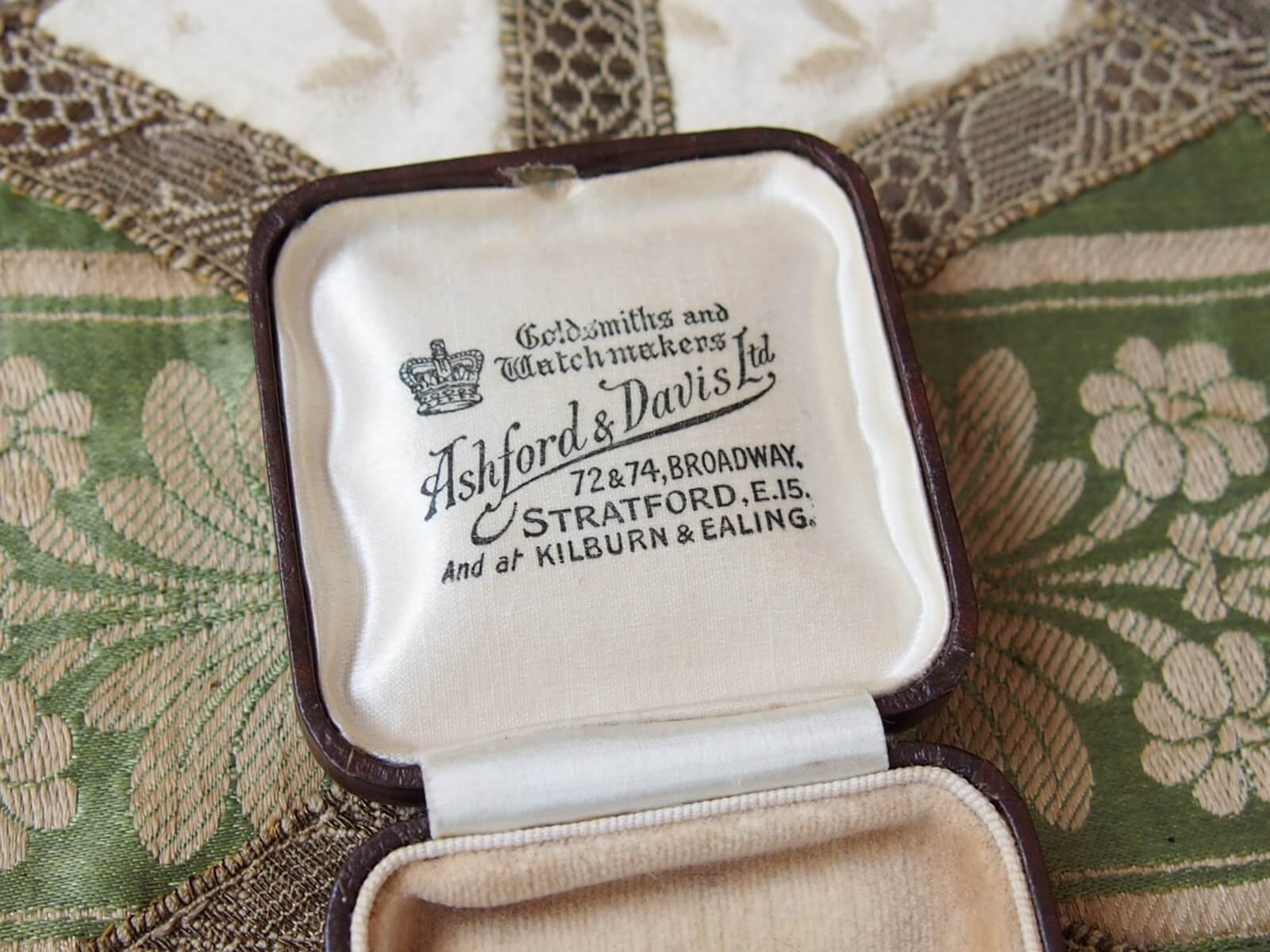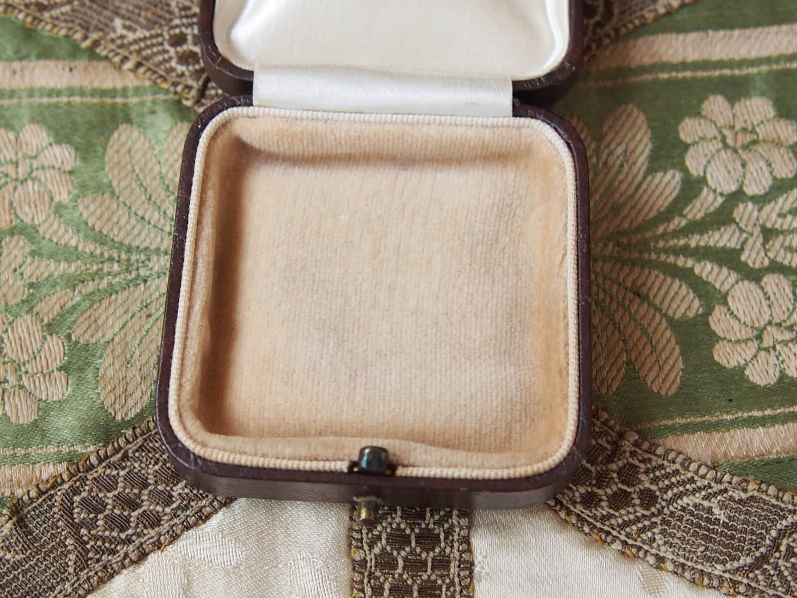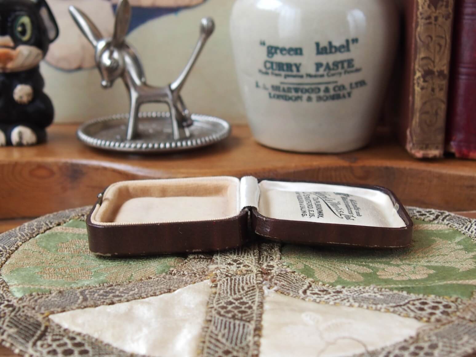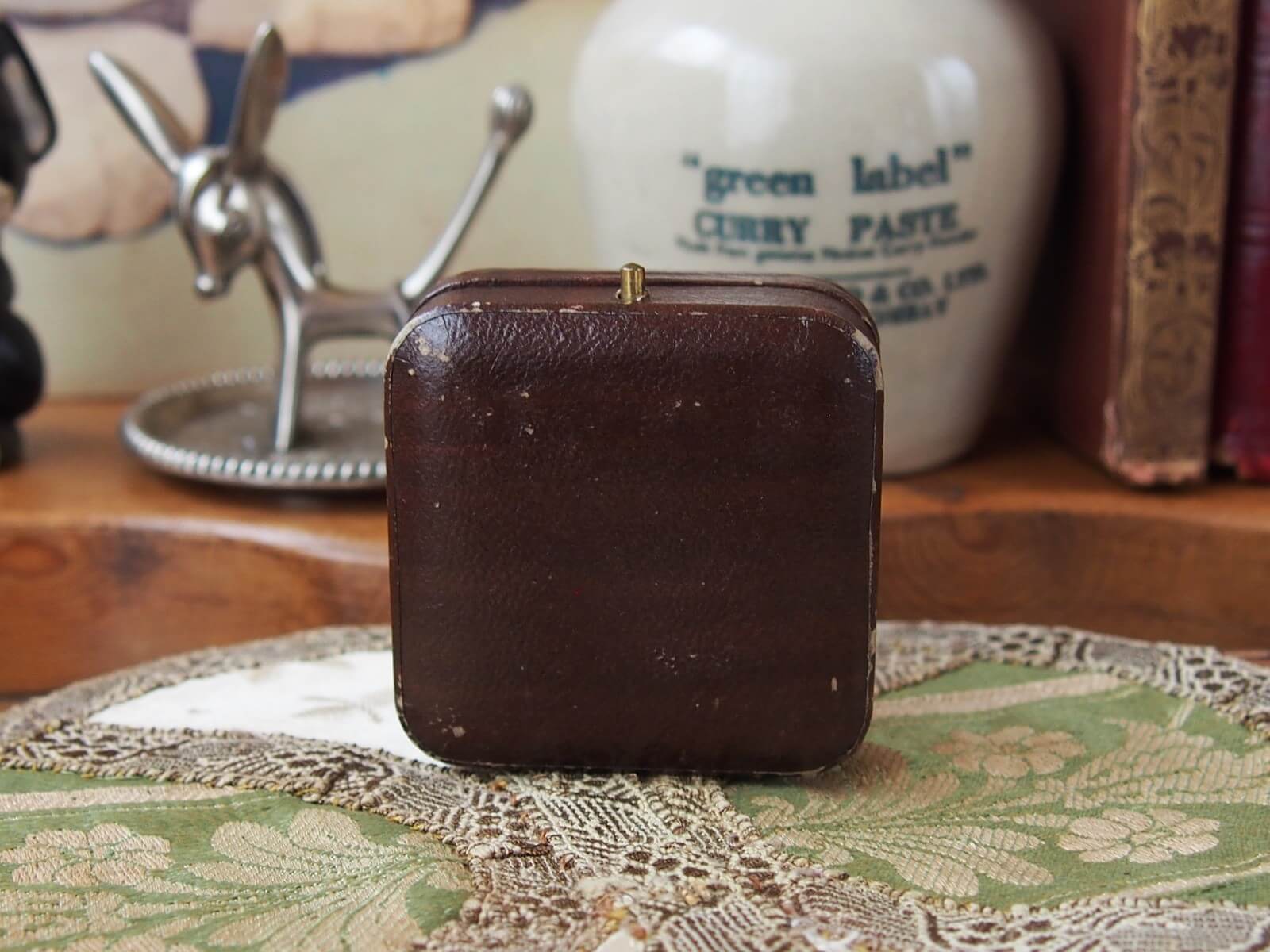 イギリスの蚤の市で出会った古いジュエリーボックス。開いた時に見えるお店のロゴがとっても素敵!また色合いや質感など、時を経たアンティークの良い雰囲気がでています。蓋の開閉も問題ありません。ジュエリーを収めるケースにこだわってみるのも素敵です♪ ディスプレイやフォトスタイリングのアイテムとしても最適です。年代からくる汚れや変色・擦れ・破れなどは見られますが、大きなダメージはありません。