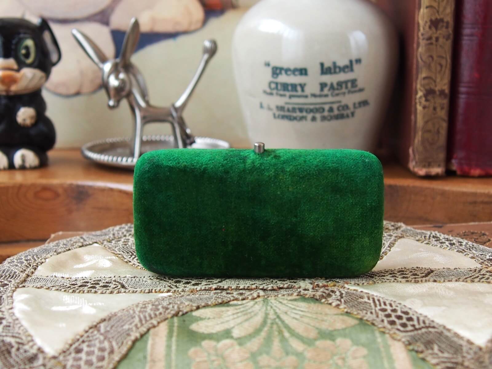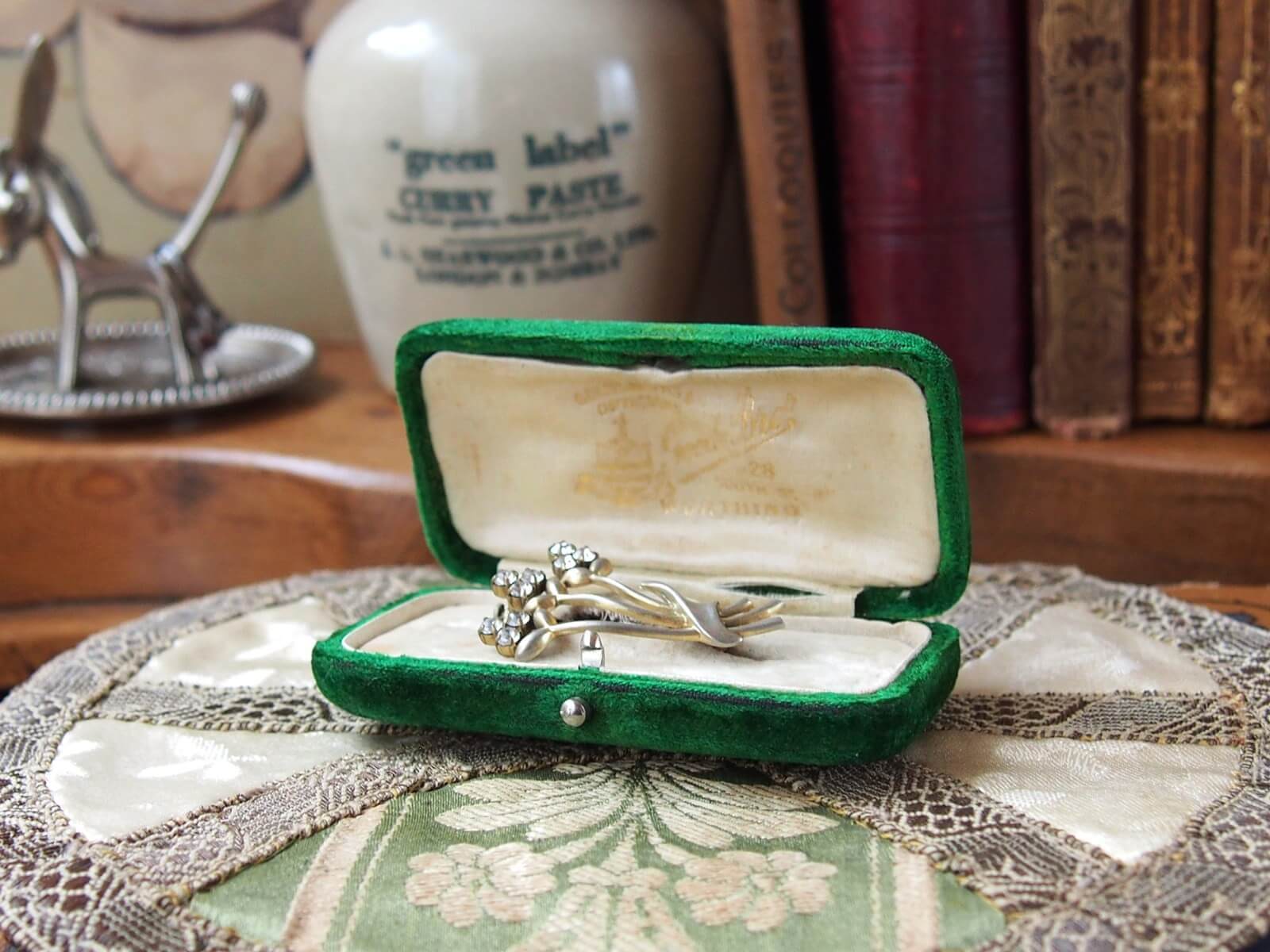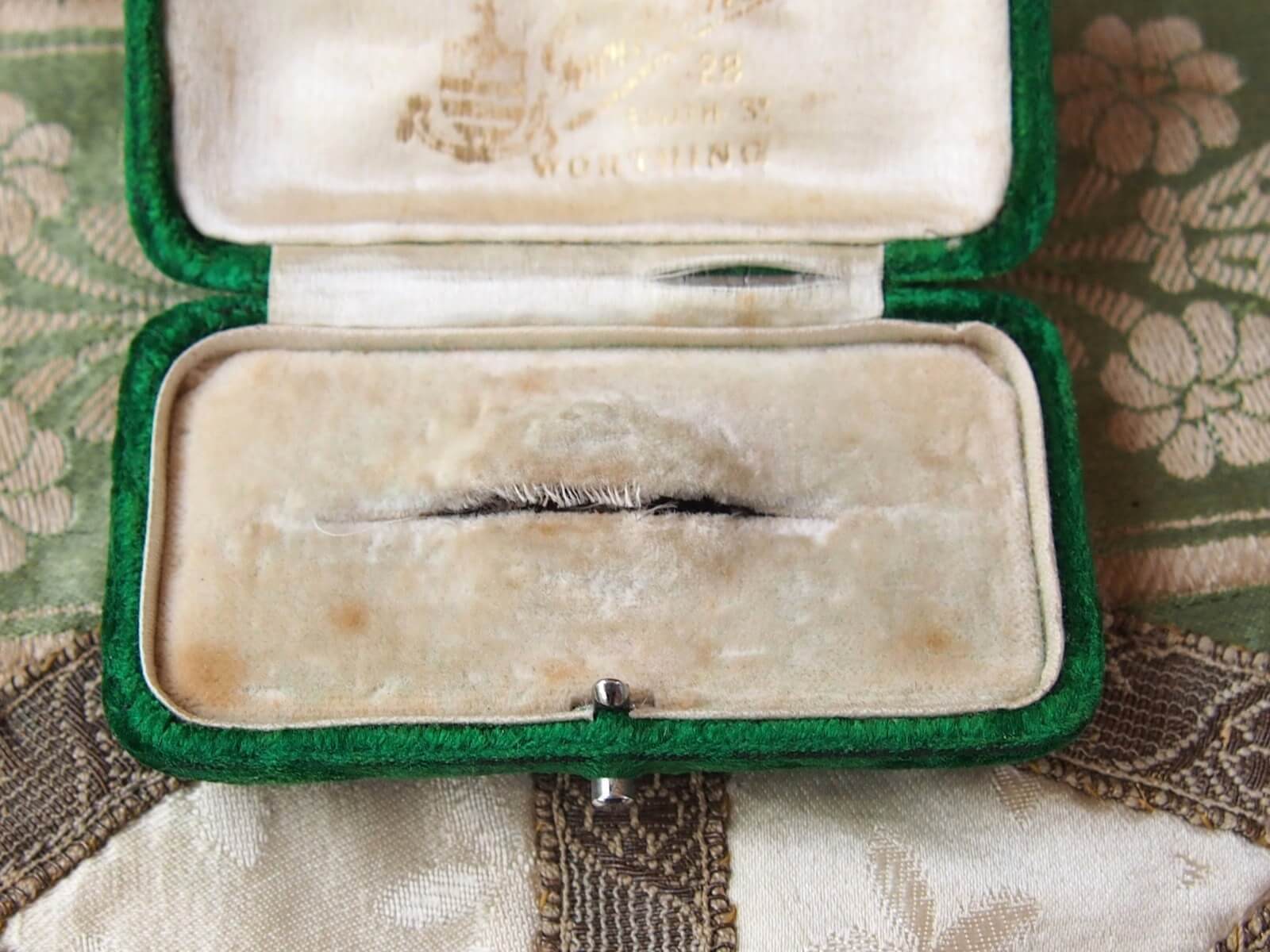 イギリスの蚤の市で出会った古いジュエリーボックス。開いた時に見えるお店のロゴがとっても素敵!また色合いや質感など、時を経たアンティークの良い雰囲気がでています。蓋の開閉も問題ありません。ジュエリーを収めるケースにこだわってみるのも素敵です♪ ディスプレイやフォトスタイリングのアイテムとしても最適です。年代からくる汚れや変色・擦れ・破れなどは見られますが、大きなダメージはありません。