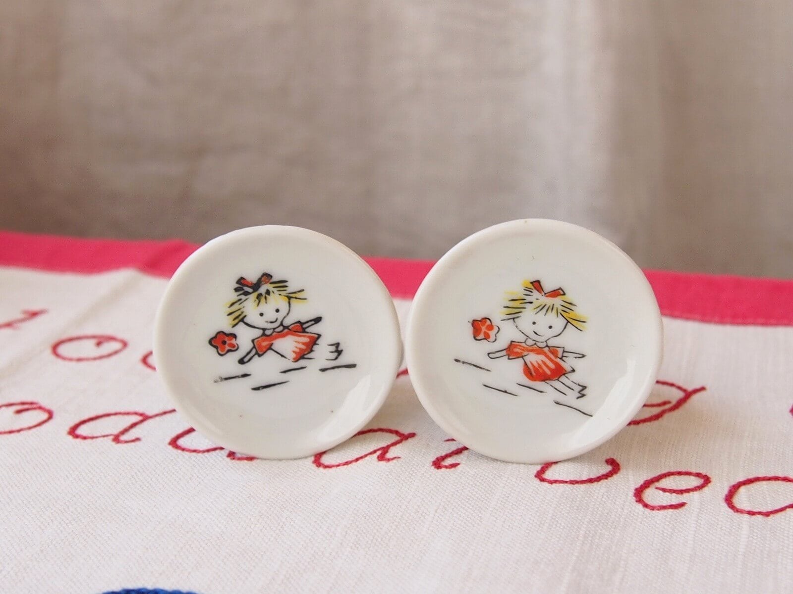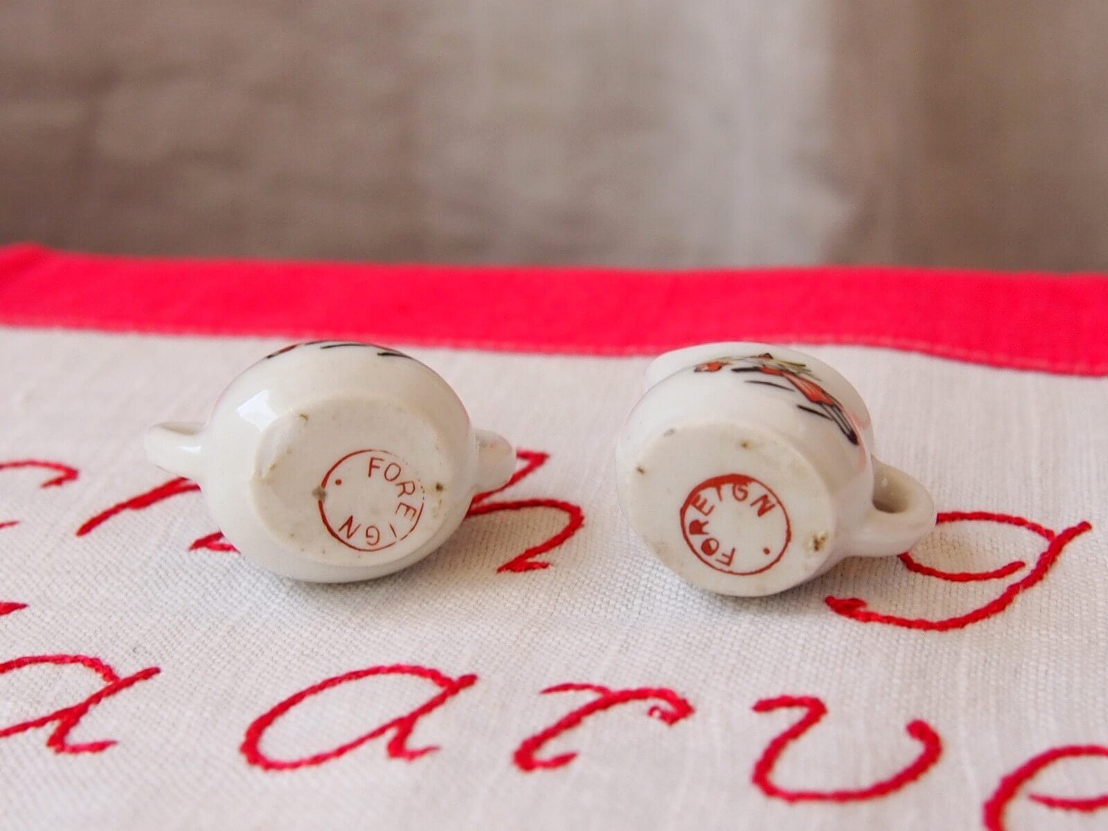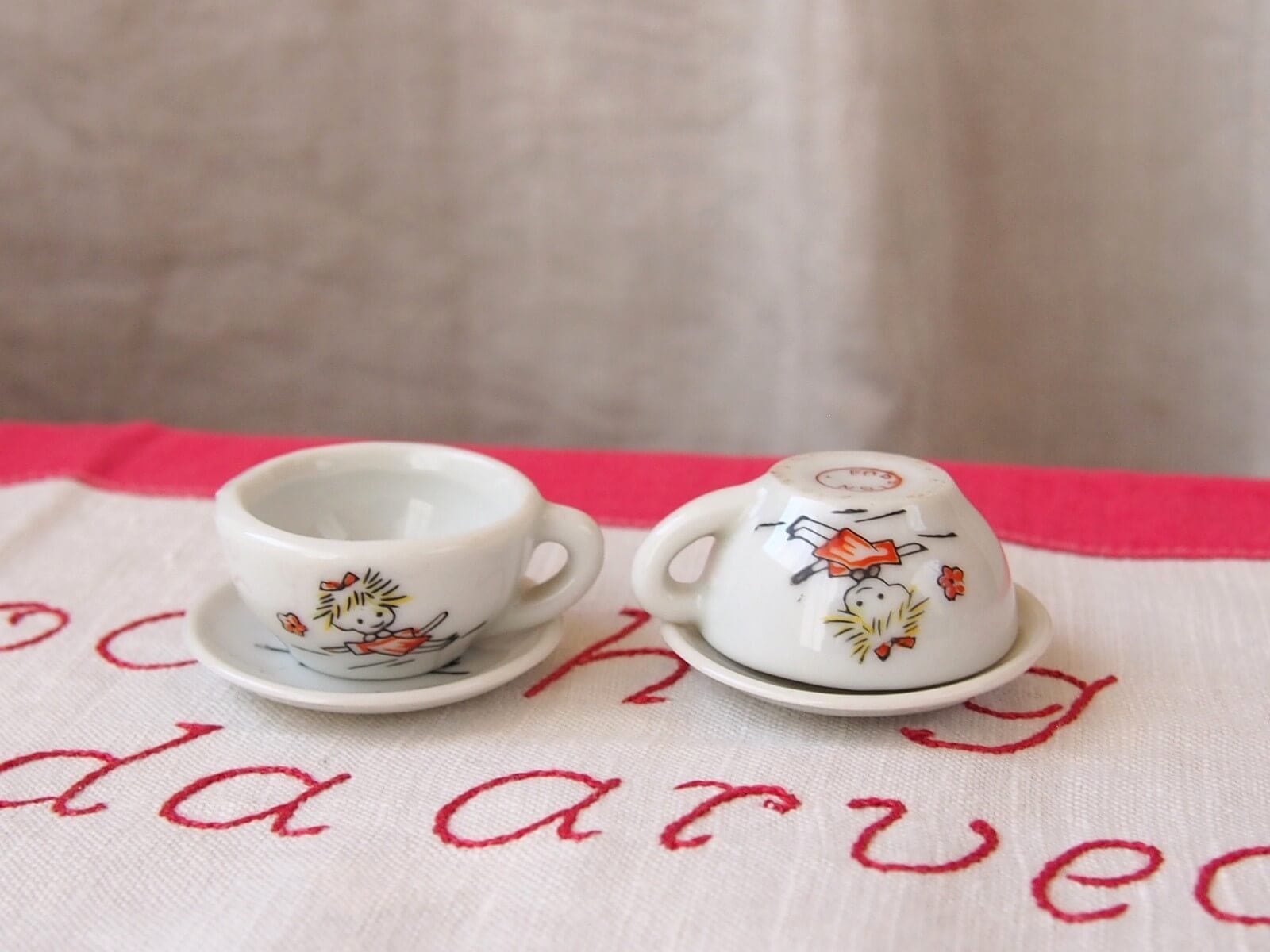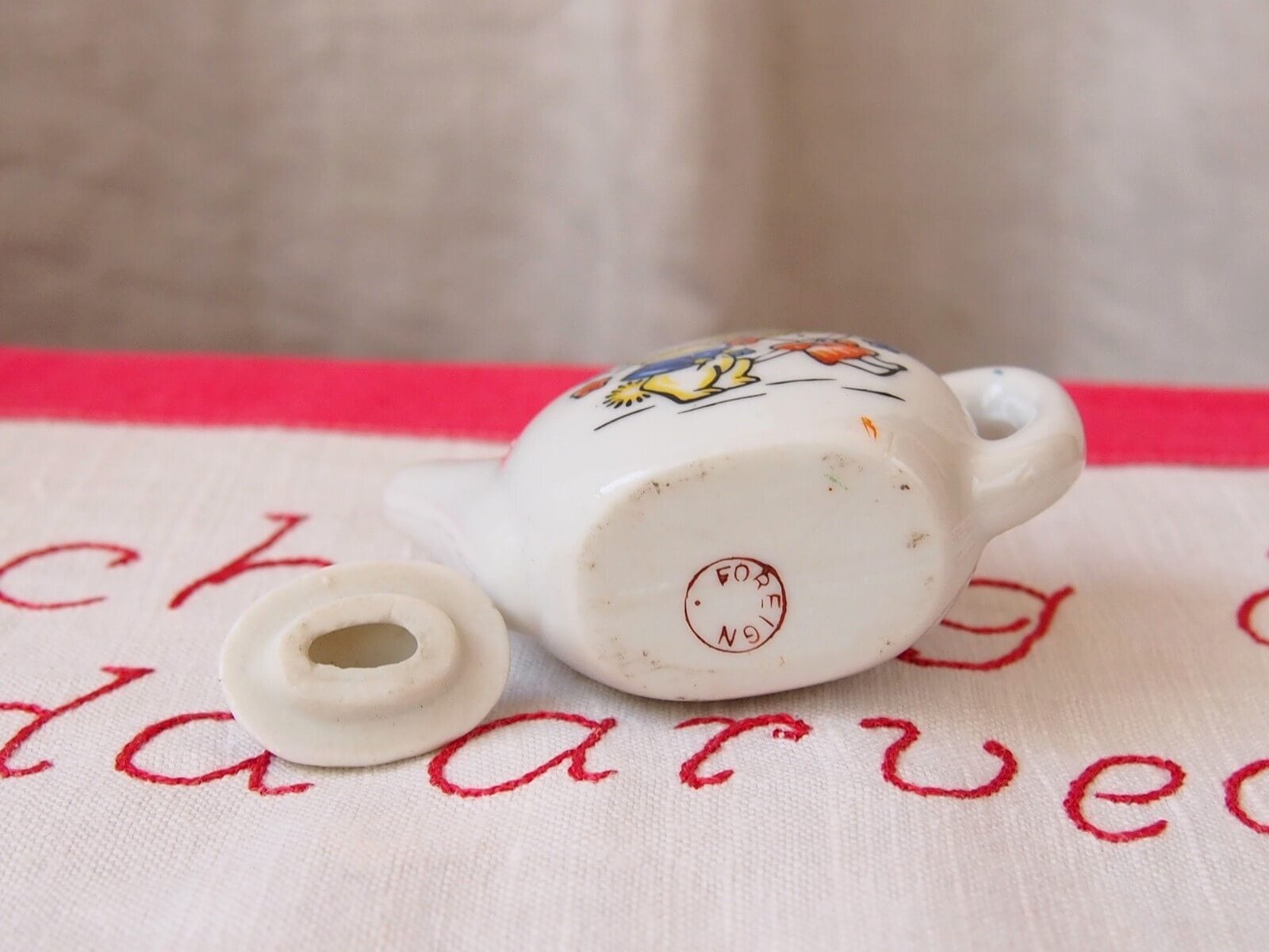 可愛らしいキャラクターが描かれたミニチュアの陶器製ティーセットです。レトロな雰囲気が魅力的で、ドールハウスのコレクションにぴったりです。レトロなおままごと用玩具として人気のあるアイテムです。ディスプレイやフォトスタイリングにも最適で、見る人を魅了すること間違いなしです。年代からくる汚れや細かいキズなどは見られますが、目立ったダメージはなく良い状態です。