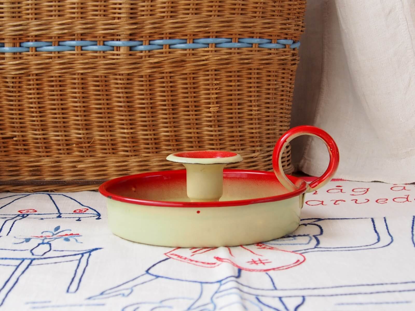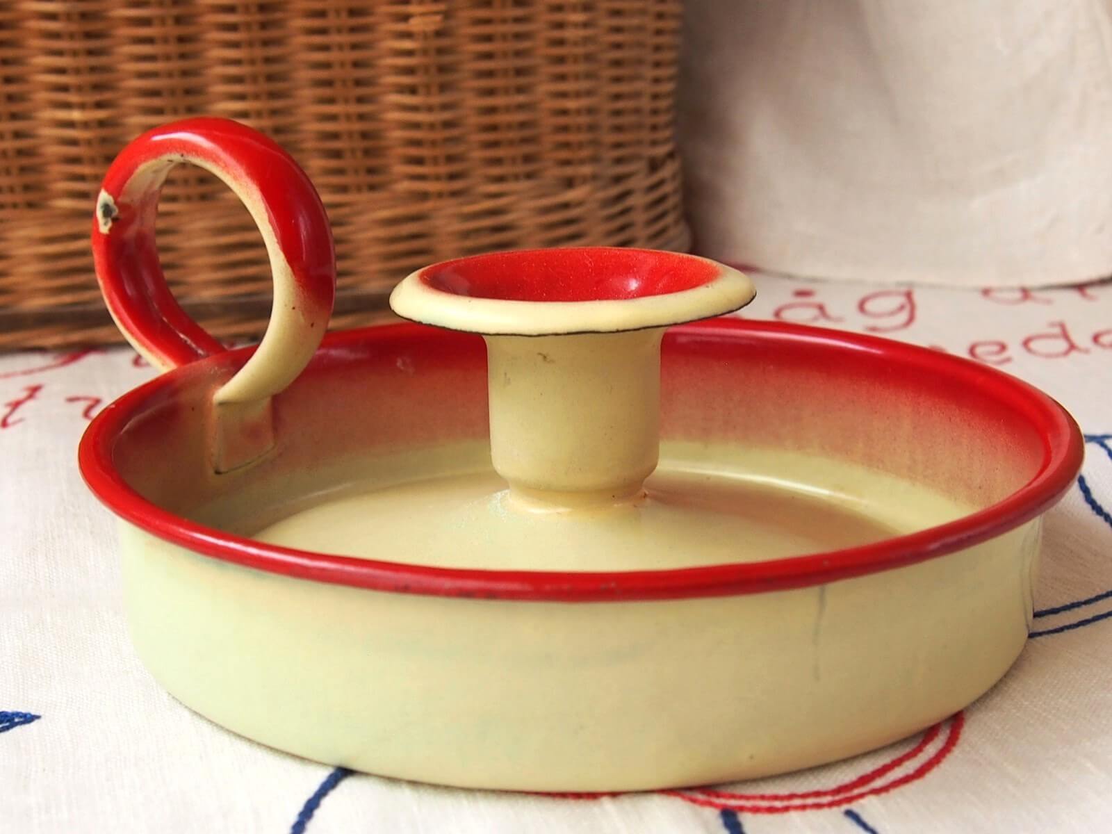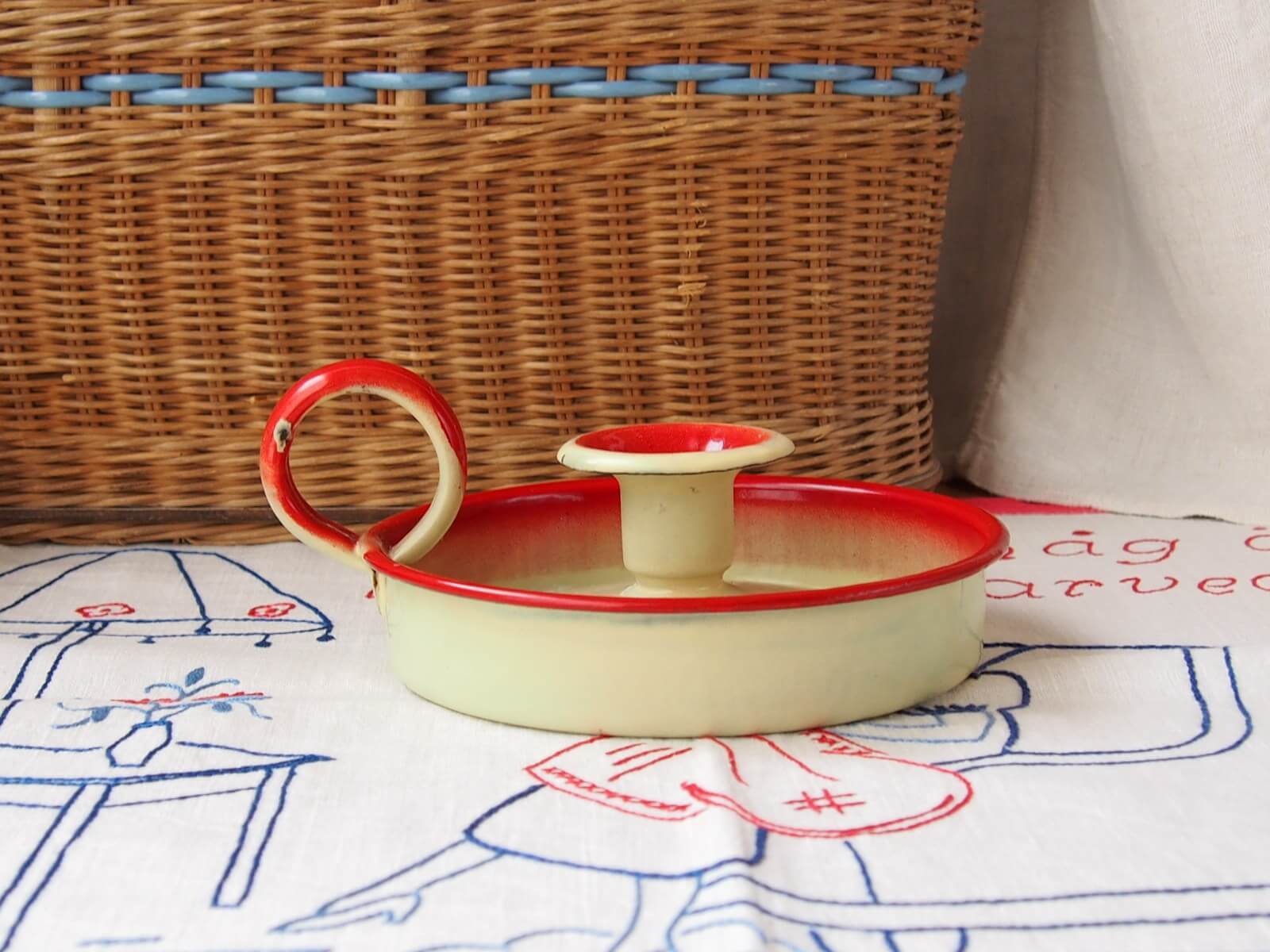 赤とレモンイエローのコントラストが特徴的なホーロー製キャンドルスタンドです。MADE IN ENGLANDのバックスタンプあり。レアカラーです!インテリアのアクセントとしてだけでなく、実際にキャンドルを灯して楽しむことも可能です。持ち運びに便利なように持ち手が付いています。年代からくる汚れや細かいキズなどは多少見られますが、目立ったダメージはなくとても良い状態です。