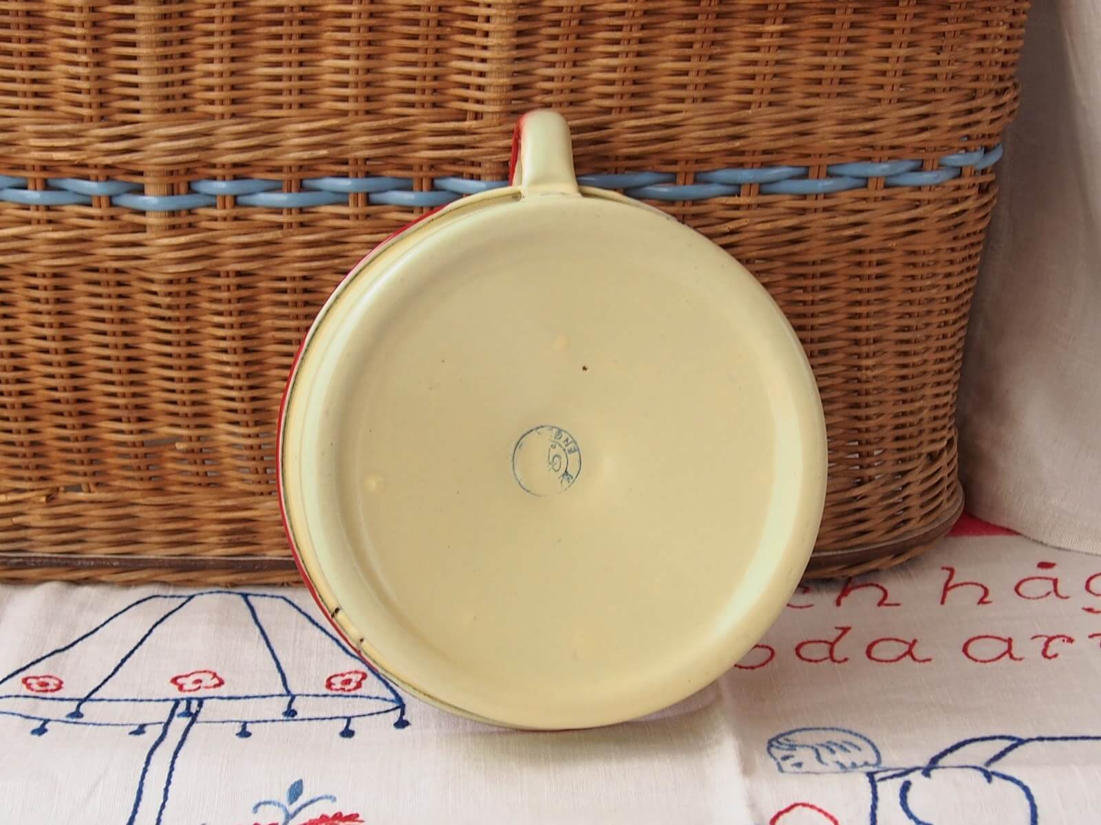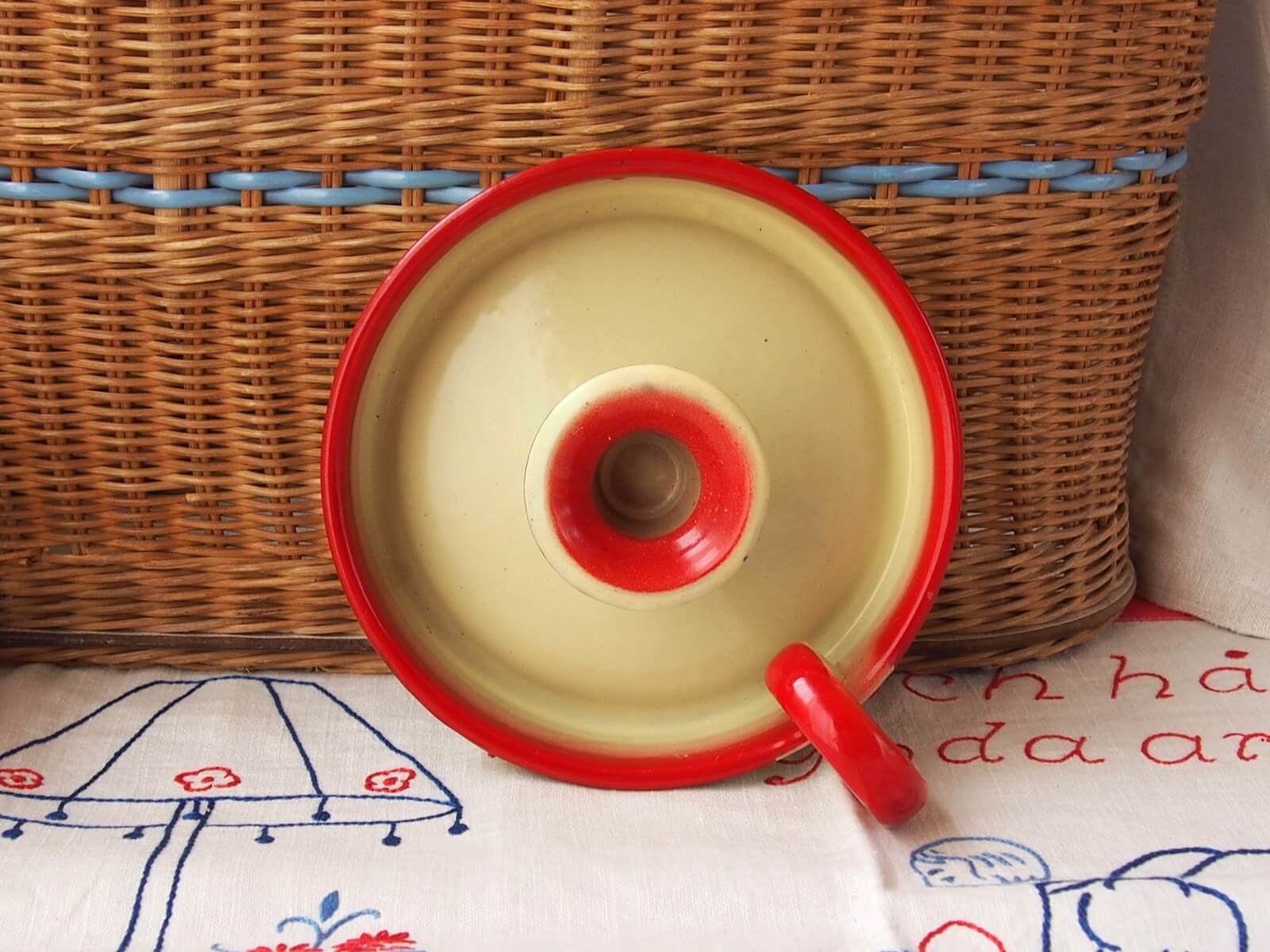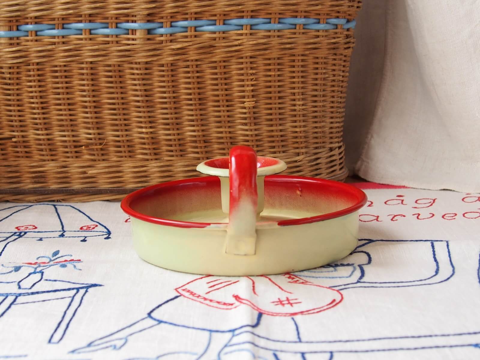 赤とレモンイエローのコントラストが特徴的なホーロー製キャンドルスタンドです。MADE IN ENGLANDのバックスタンプあり。レアカラーです!インテリアのアクセントとしてだけでなく、実際にキャンドルを灯して楽しむことも可能です。持ち運びに便利なように持ち手が付いています。年代からくる汚れや細かいキズなどは多少見られますが、目立ったダメージはなくとても良い状態です。