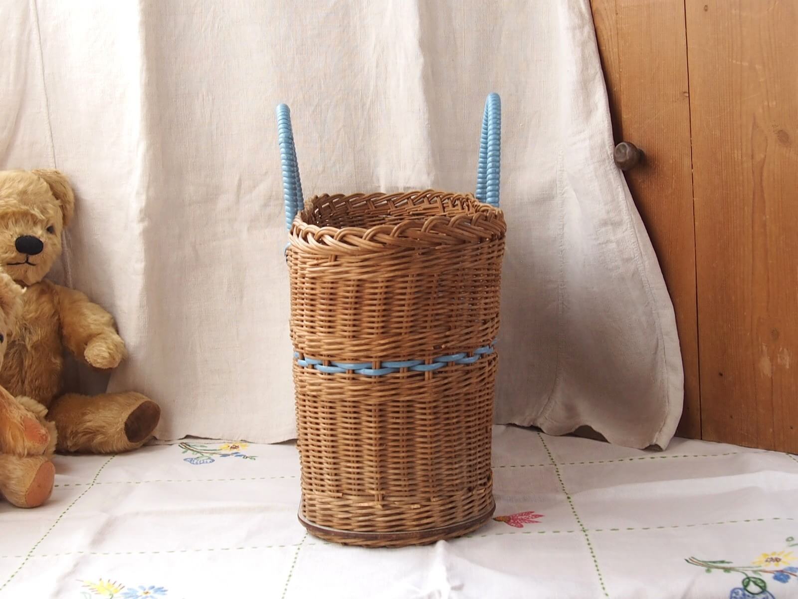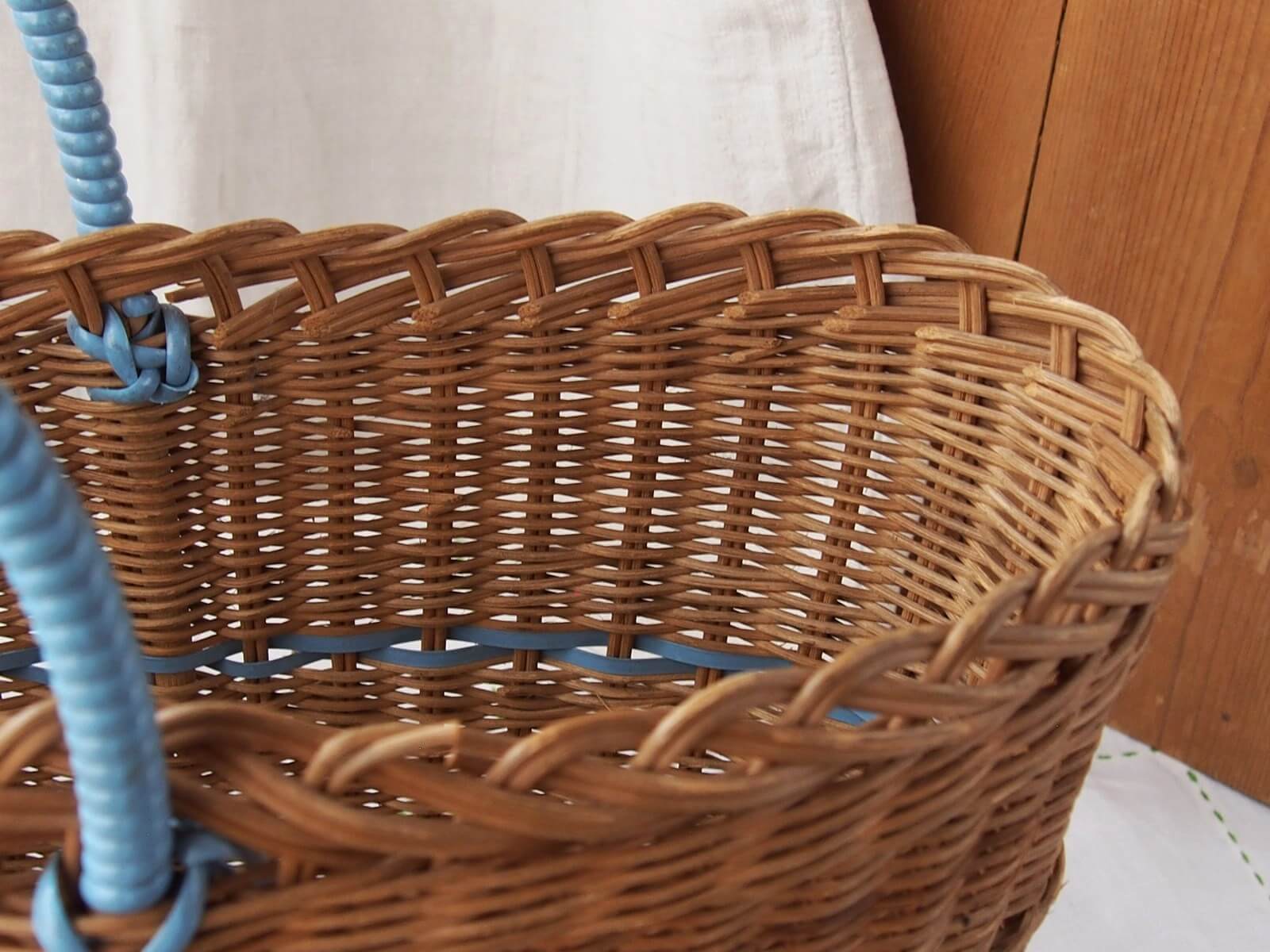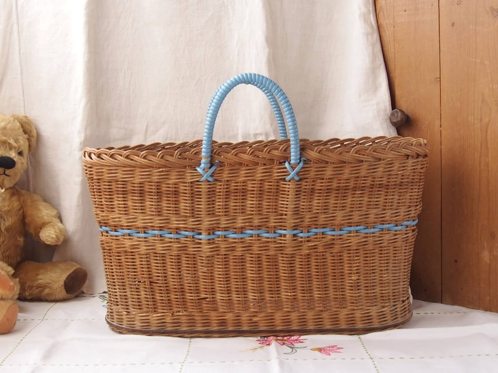 イギリス。爽やかな水色のラインと持ち手がアクセントになったバスケット。横長のオーバル(楕円)型で、マチもしっかりあるため雑誌の収納やインテリアバスケットとしても活用できます。時を経て魅力を増した質感や色合いが、上品さを演出してくれます。年代からくる汚れや変色・折れなどは見られますが、全体的には良い状態です。