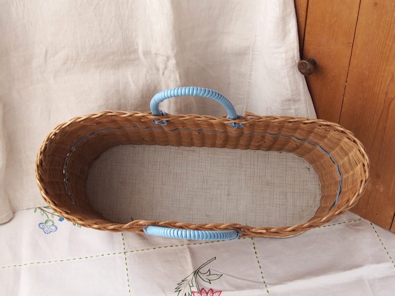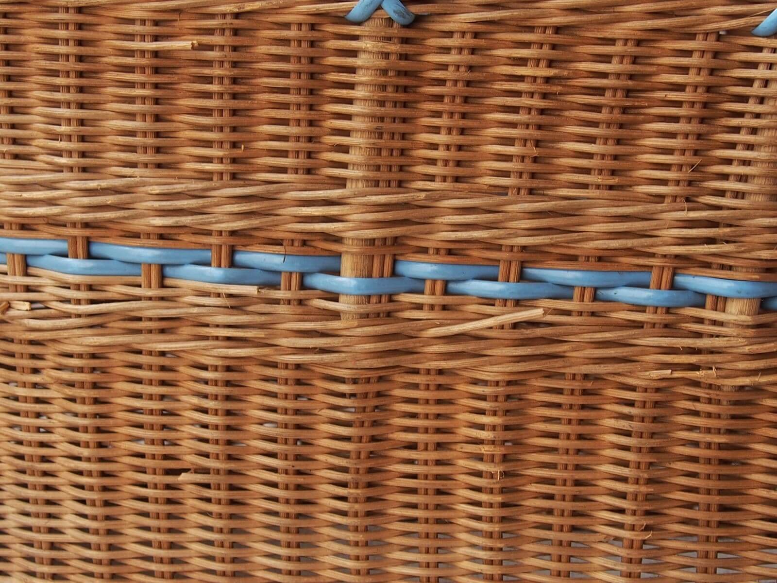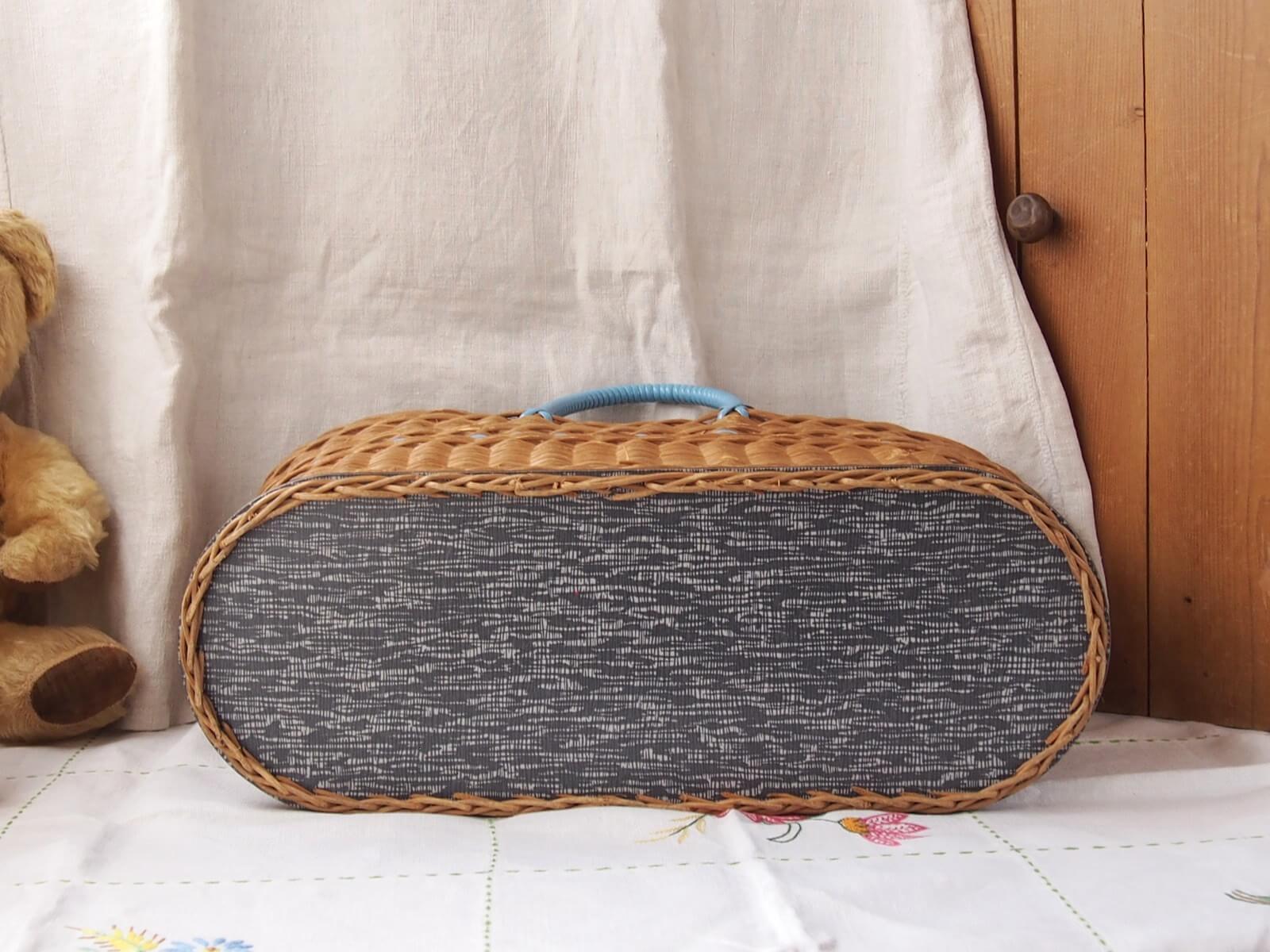 イギリス。爽やかな水色のラインと持ち手がアクセントになったバスケット。横長のオーバル(楕円)型で、マチもしっかりあるため雑誌の収納やインテリアバスケットとしても活用できます。時を経て魅力を増した質感や色合いが、上品さを演出してくれます。年代からくる汚れや変色・折れなどは見られますが、全体的には良い状態です。