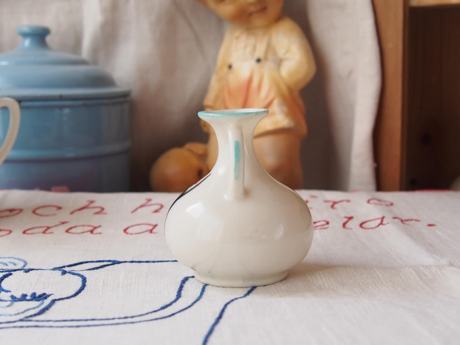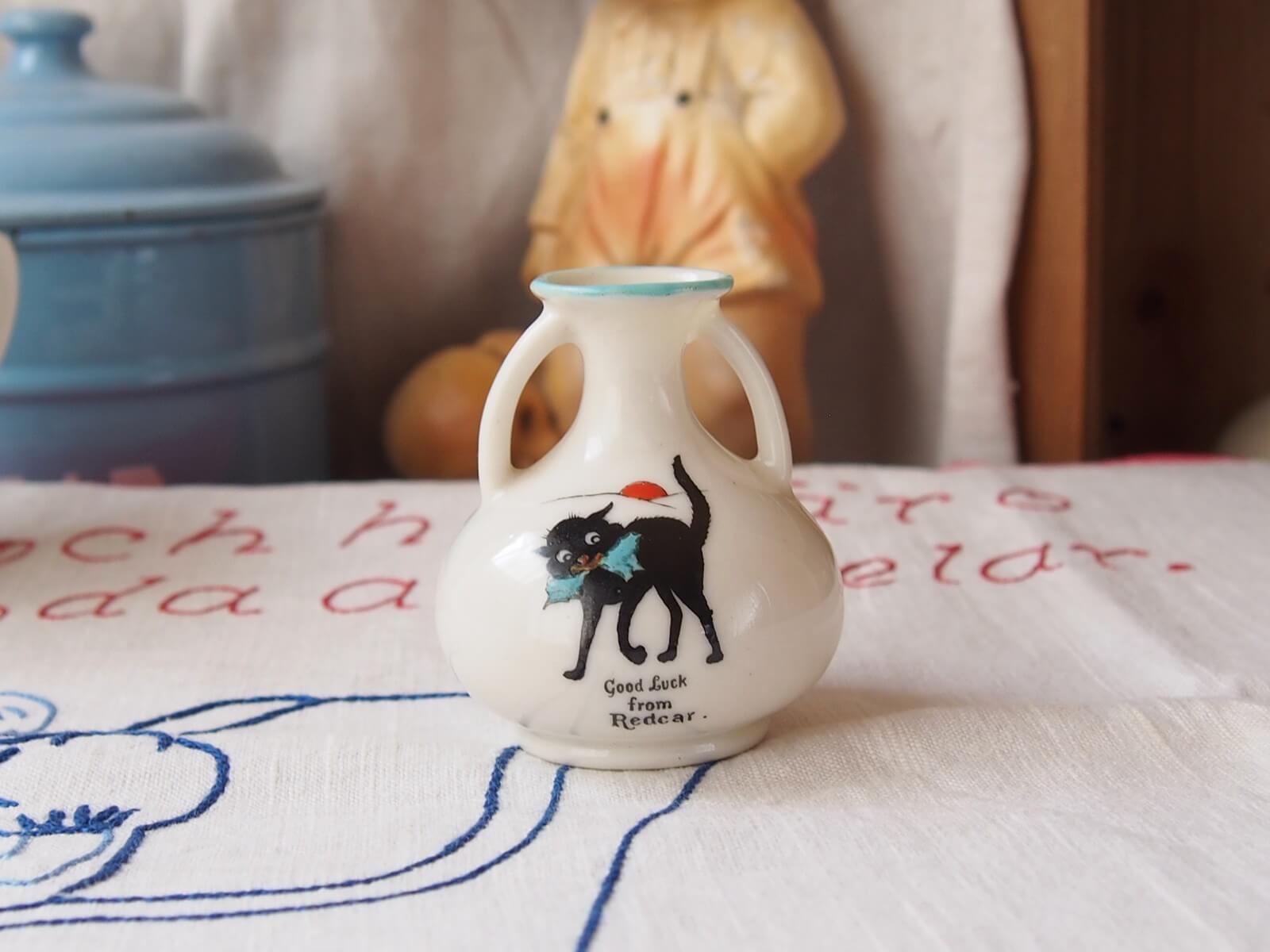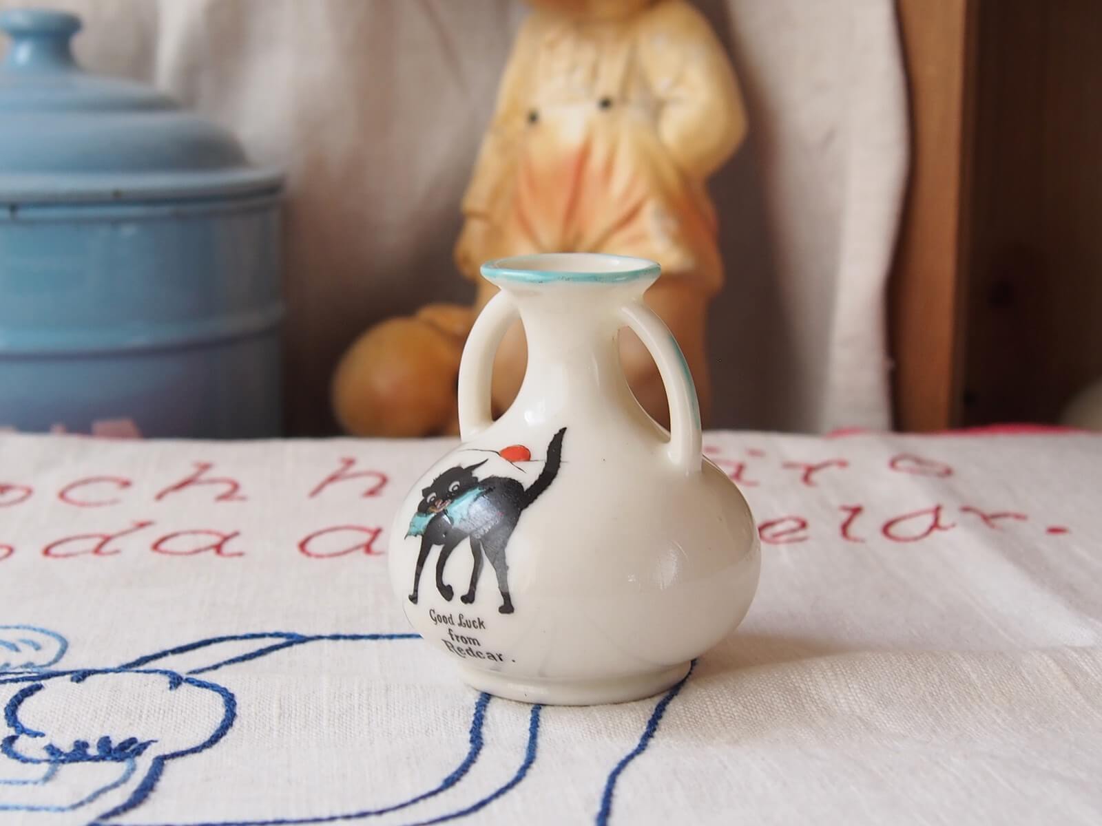 推定1920~30年代・イギリス。可愛らしい黒猫(GOOD LUCK CAT)が描かれた、手のひらサイズのミニ花瓶。小型ながら存在感があり、小花を飾るだけで心が和む空間を演出します。クレステッドチャイナという、19世紀後半から20世紀初頭にイギリスで流行した陶器製のお土産品です。その土地の地名や紋章が入って売られていたそうです。黒猫は幸運のしるしとされていて、人気の絵柄だったようです。年代からくる汚れやキズなどは多少見られますが、目立ったダメージはなく良い状態です。