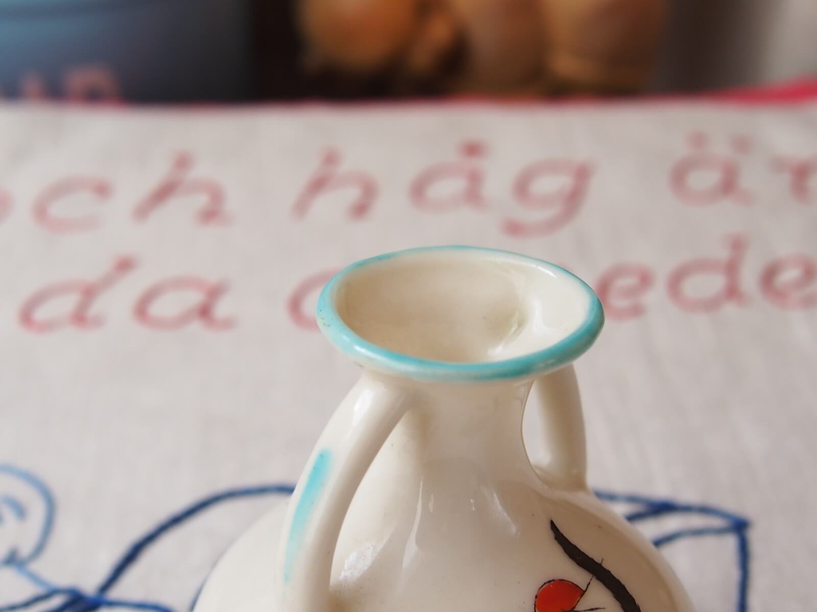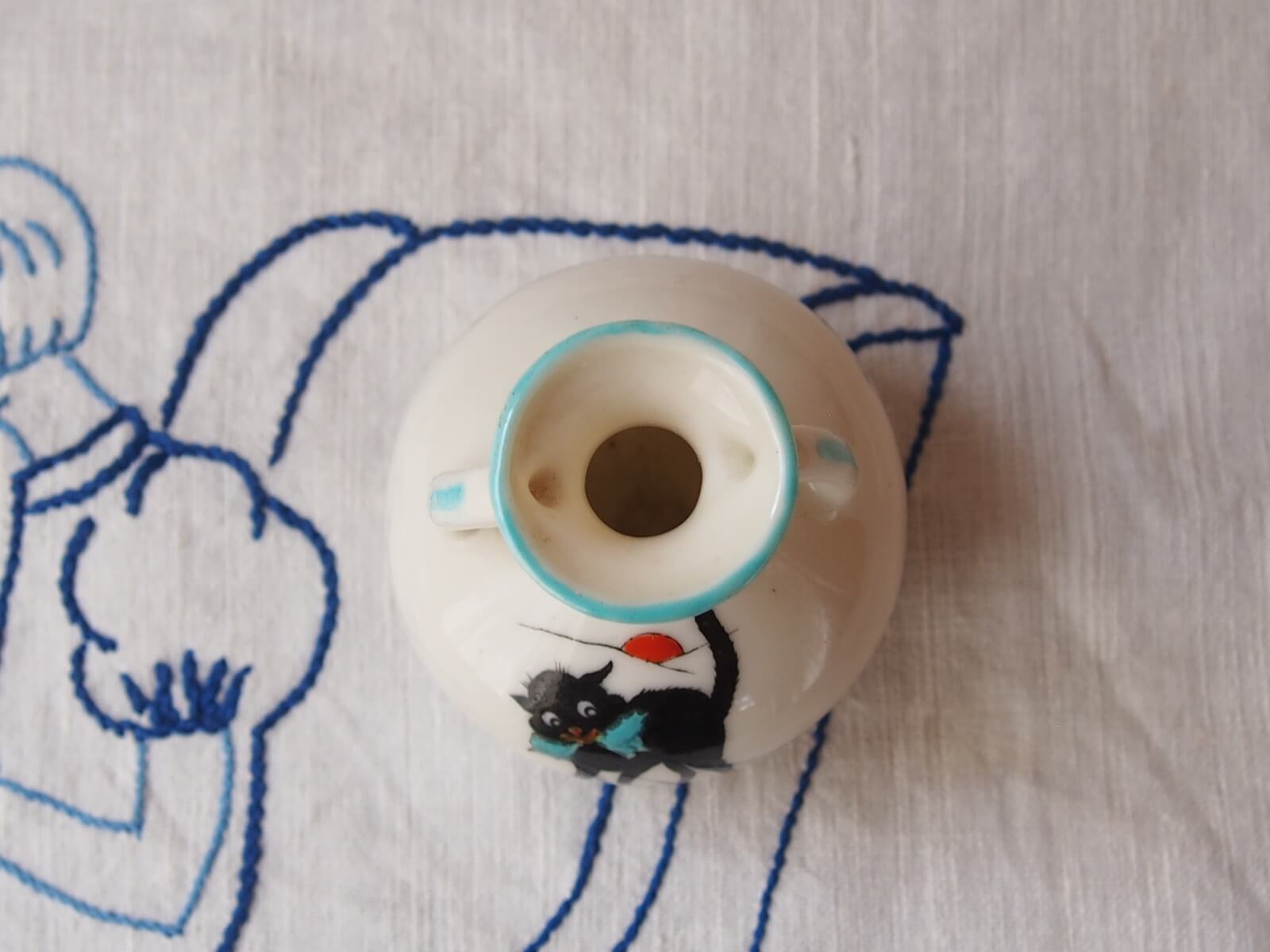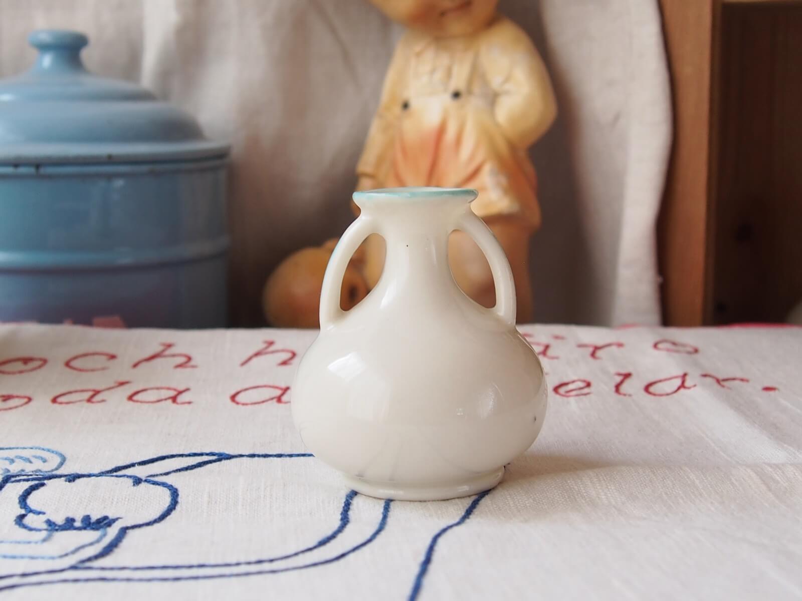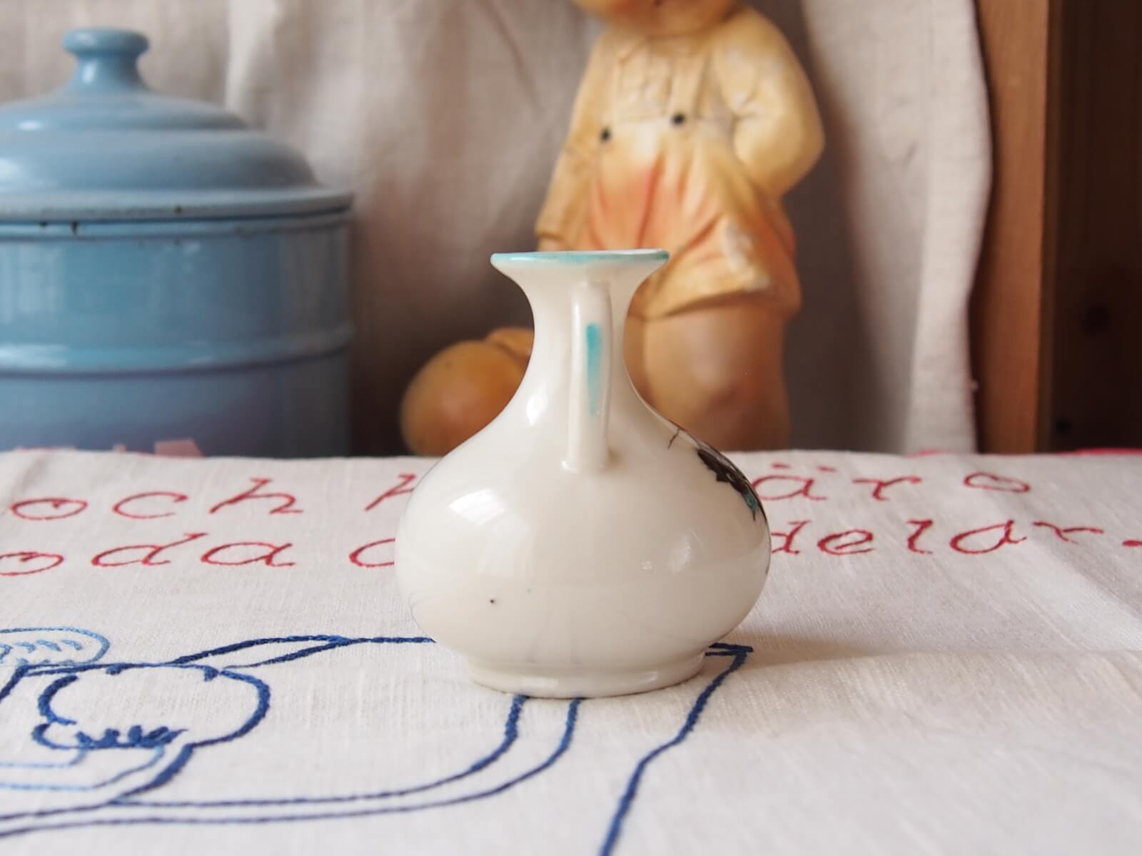 推定1920~30年代・イギリス。可愛らしい黒猫(GOOD LUCK CAT)が描かれた、手のひらサイズのミニ花瓶。小型ながら存在感があり、小花を飾るだけで心が和む空間を演出します。クレステッドチャイナという、19世紀後半から20世紀初頭にイギリスで流行した陶器製のお土産品です。その土地の地名や紋章が入って売られていたそうです。黒猫は幸運のしるしとされていて、人気の絵柄だったようです。年代からくる汚れやキズなどは多少見られますが、目立ったダメージはなく良い状態です。