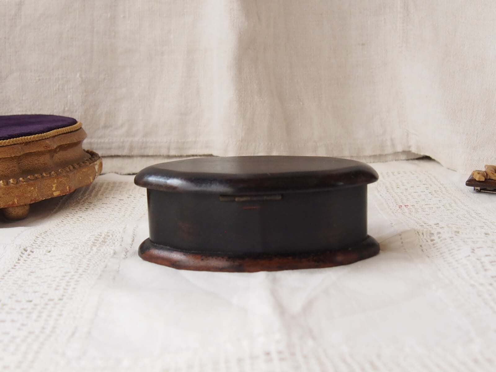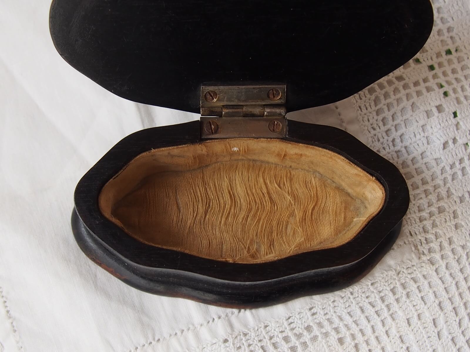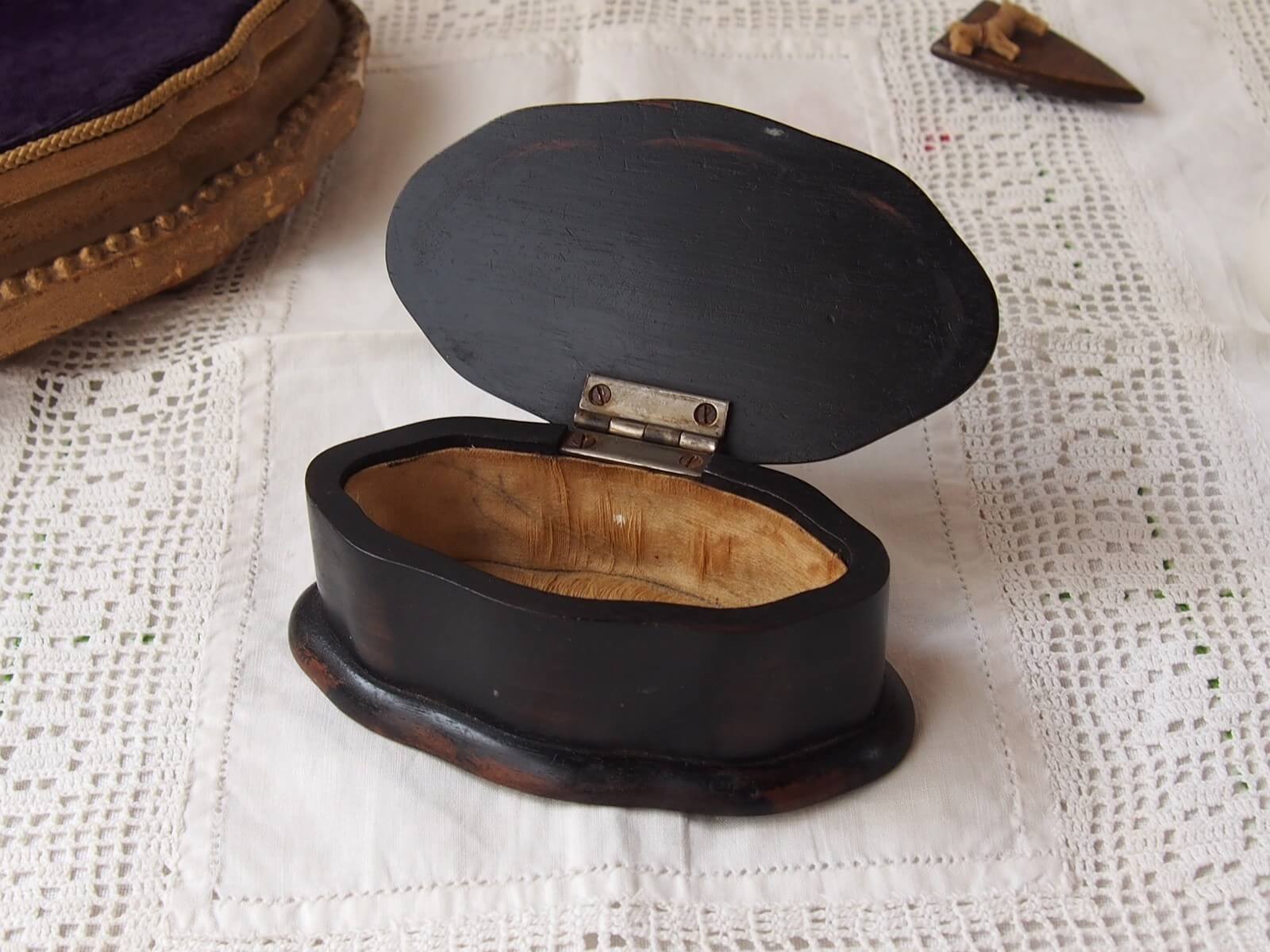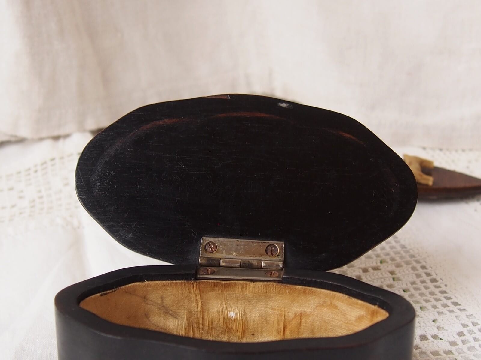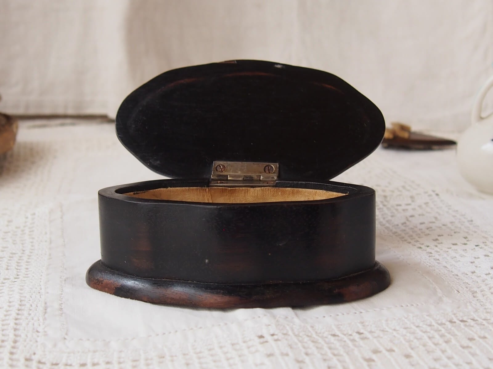 推定1900~20年代・イギリス。スタイリッシュな小型の木製ジュエリーボックス。おそらく材質は黒檀で、深い黒色に光沢もややあり高級感と優雅さを醸し出しています。内側のシルク生地にほつれ・破れなどのダメージが見られます。指輪やイヤリングなどの小さな装身具の収納に最適だと思います。蓋と本体はヒンジで連結されています。年代からくる汚れやキズなどは見られます。