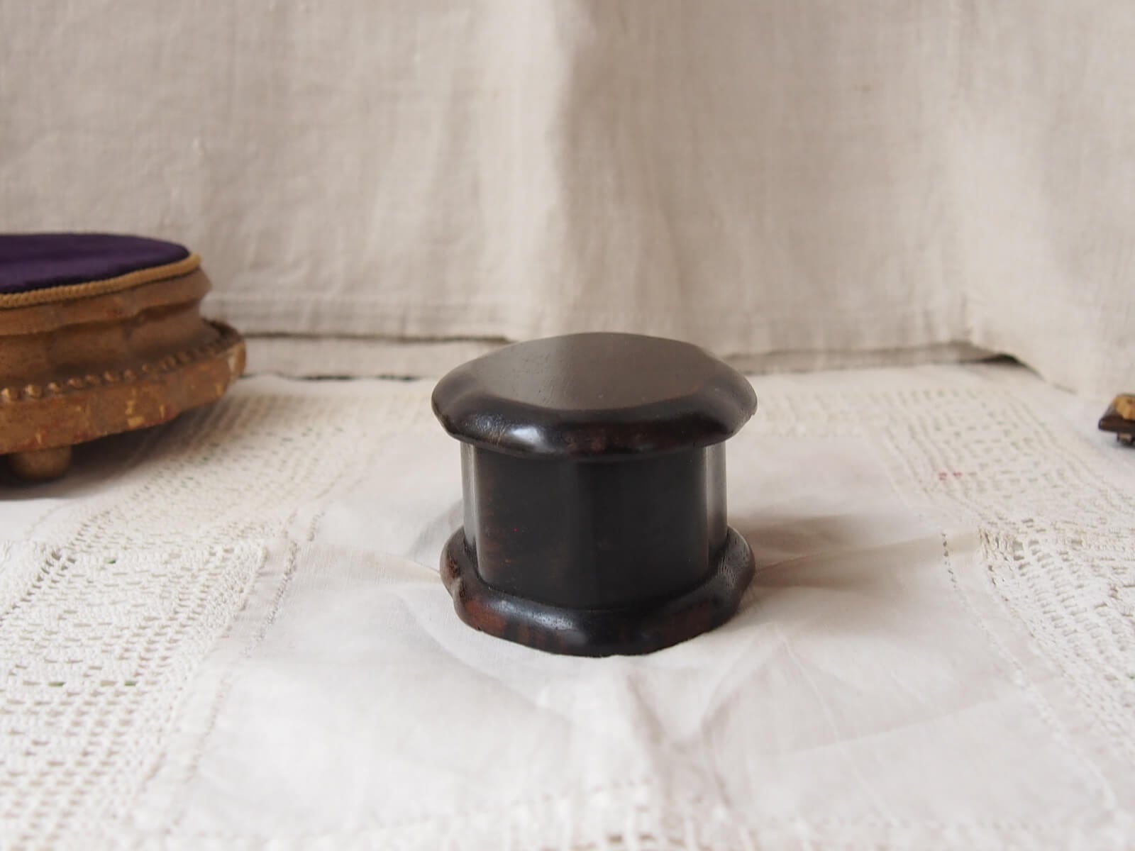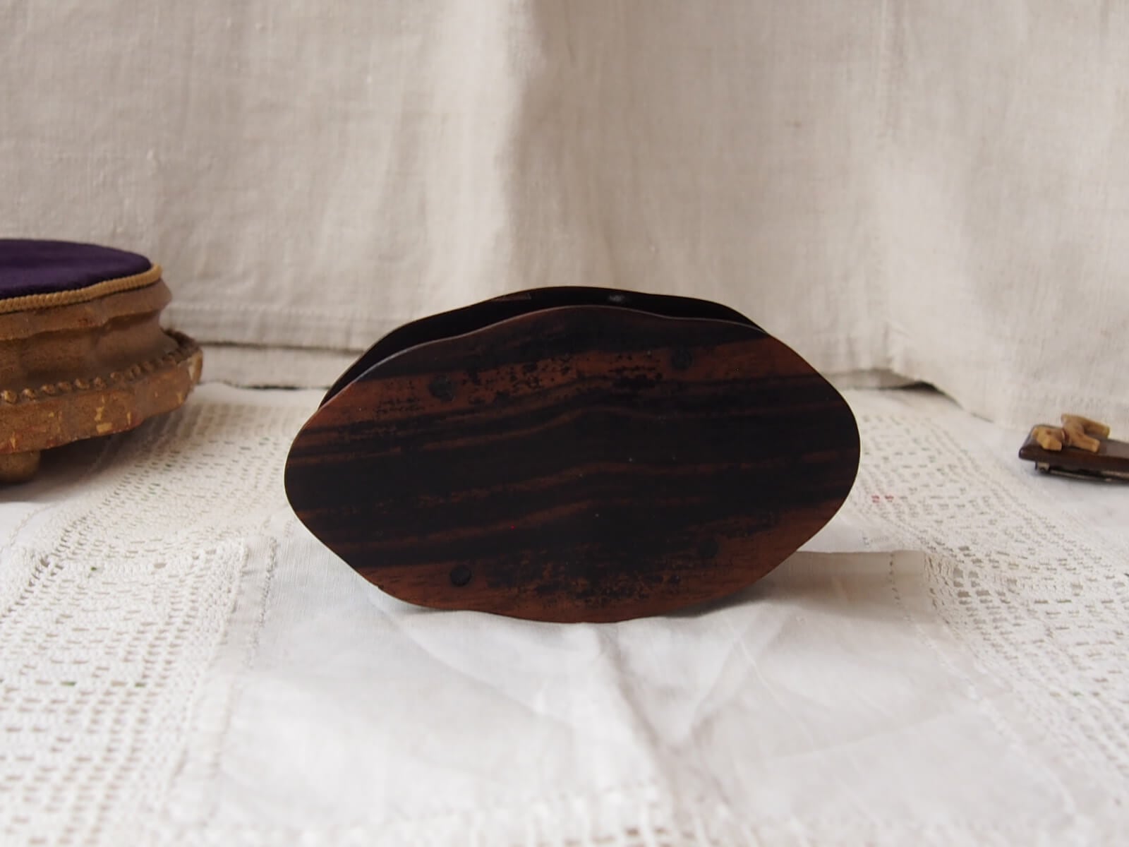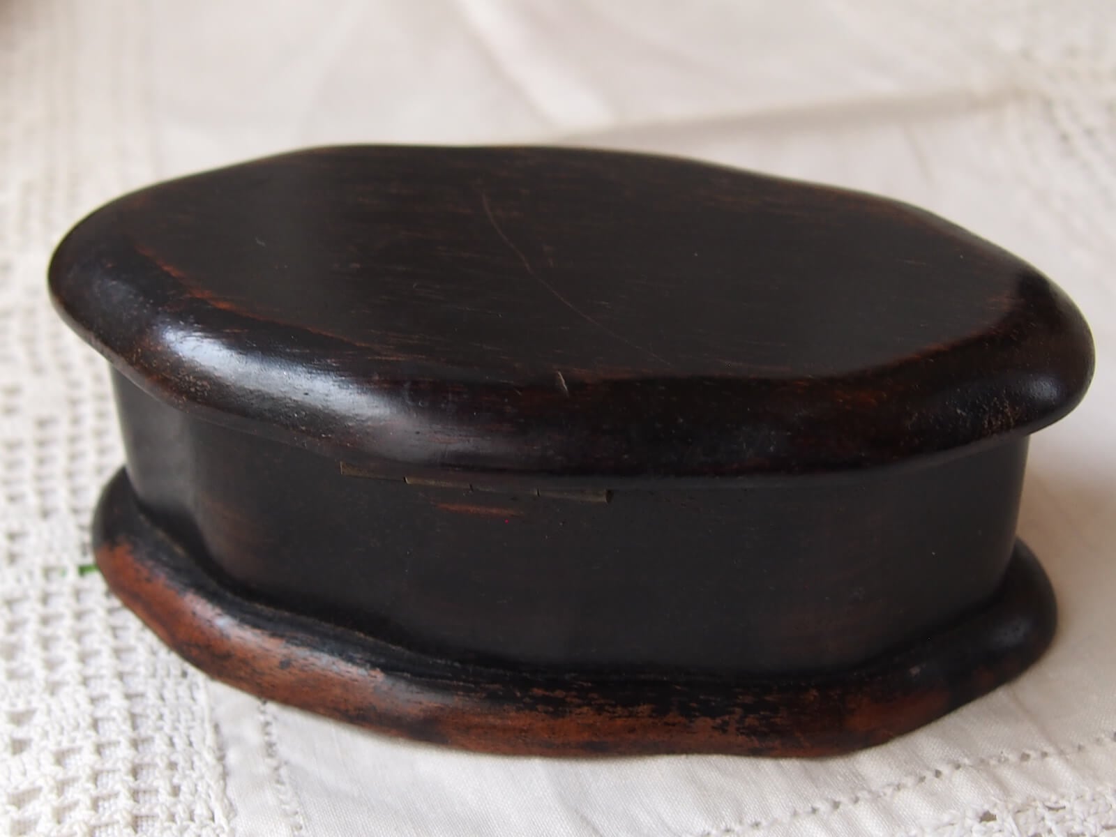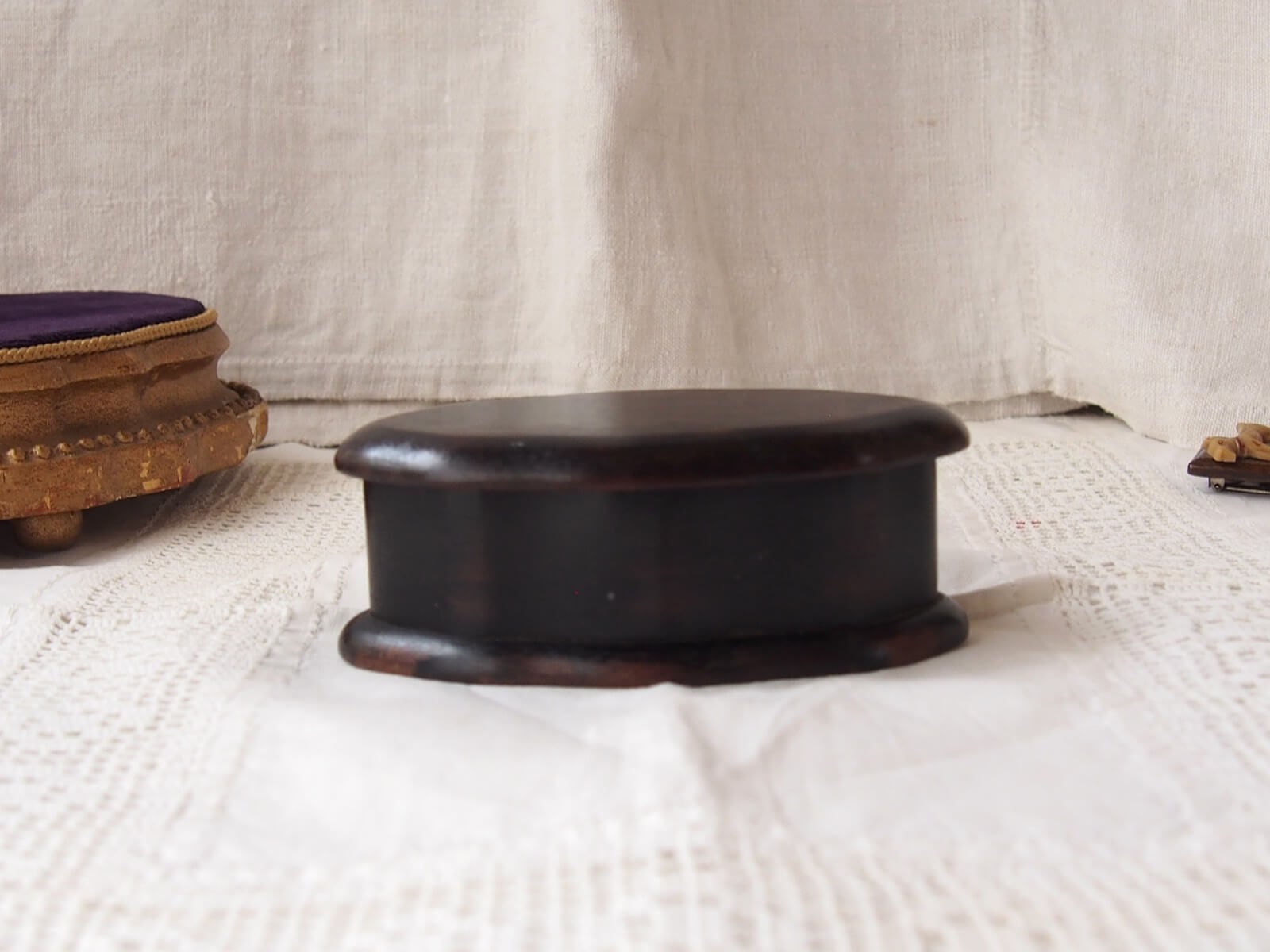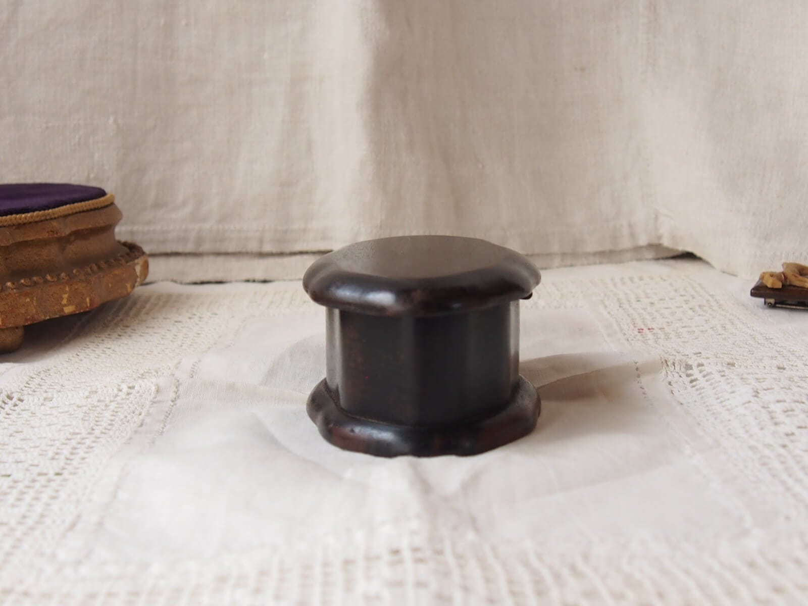 推定1900~20年代・イギリス。スタイリッシュな小型の木製ジュエリーボックス。おそらく材質は黒檀で、深い黒色に光沢もややあり高級感と優雅さを醸し出しています。内側のシルク生地にほつれ・破れなどのダメージが見られます。指輪やイヤリングなどの小さな装身具の収納に最適だと思います。蓋と本体はヒンジで連結されています。年代からくる汚れやキズなどは見られます。
