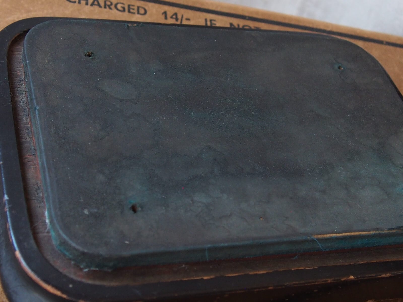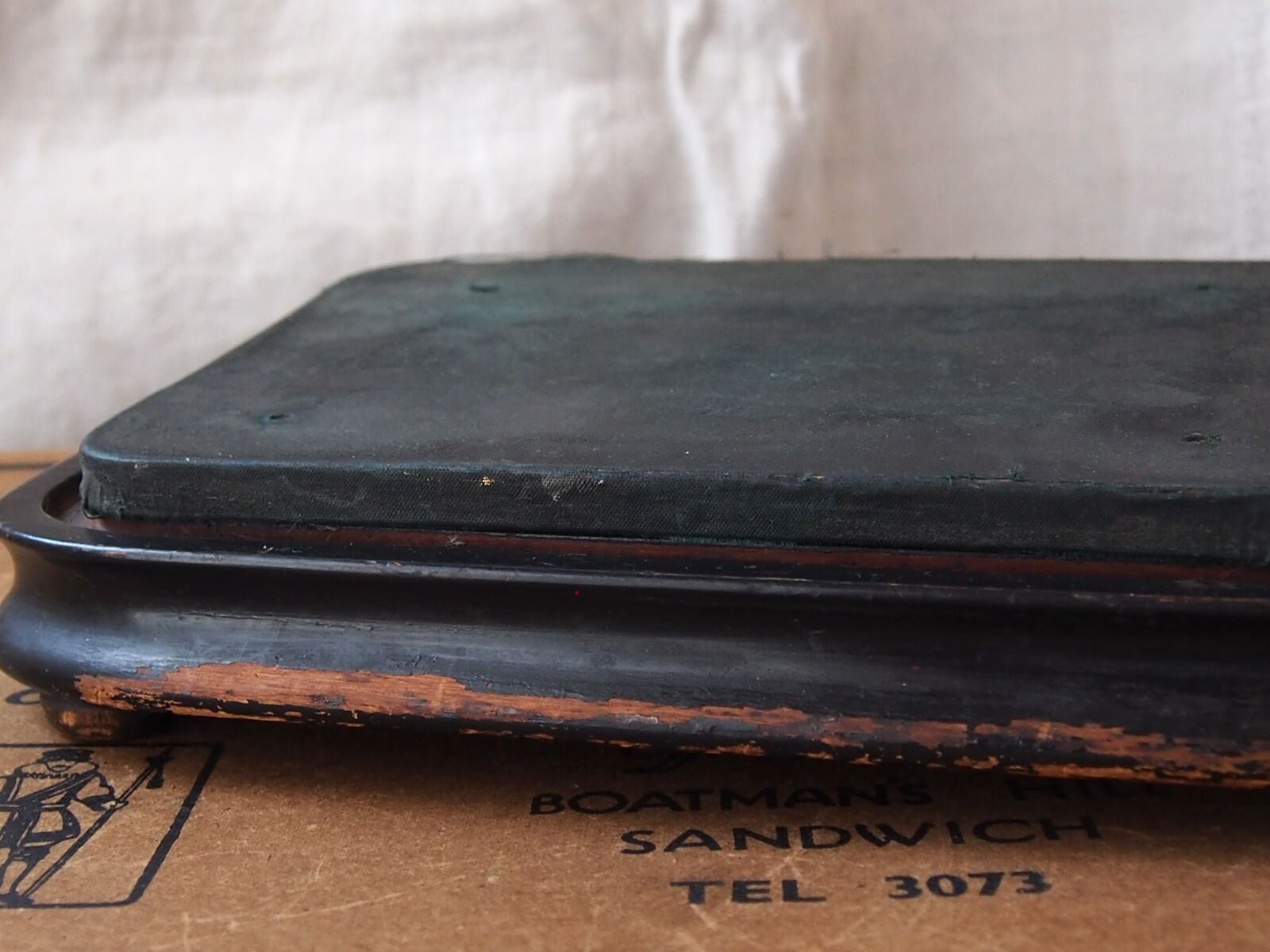 こちらはガラスドームのベース部分で、1900年代頃のお品だと思われます。上面に薄い生地が貼られています。アクセサリーや植物など、さまざまな物を展示するのに役立つ飾り台だと思います。アンティーク独特の深い質感や色合いは、展示物を一層引き立てます。。年代からくる汚れやキズ・塗装の剥がれ・生地の破れなどは見られます。