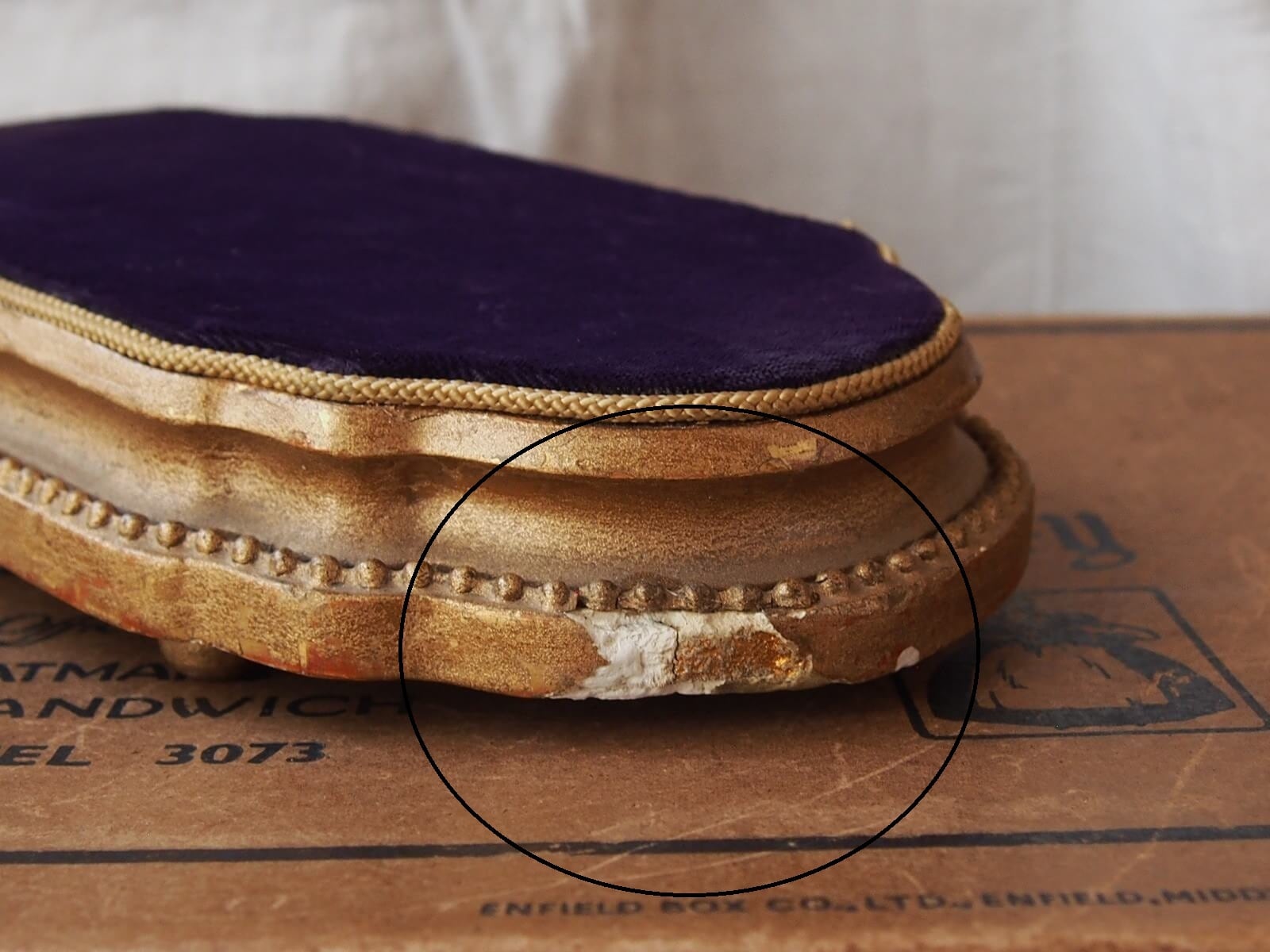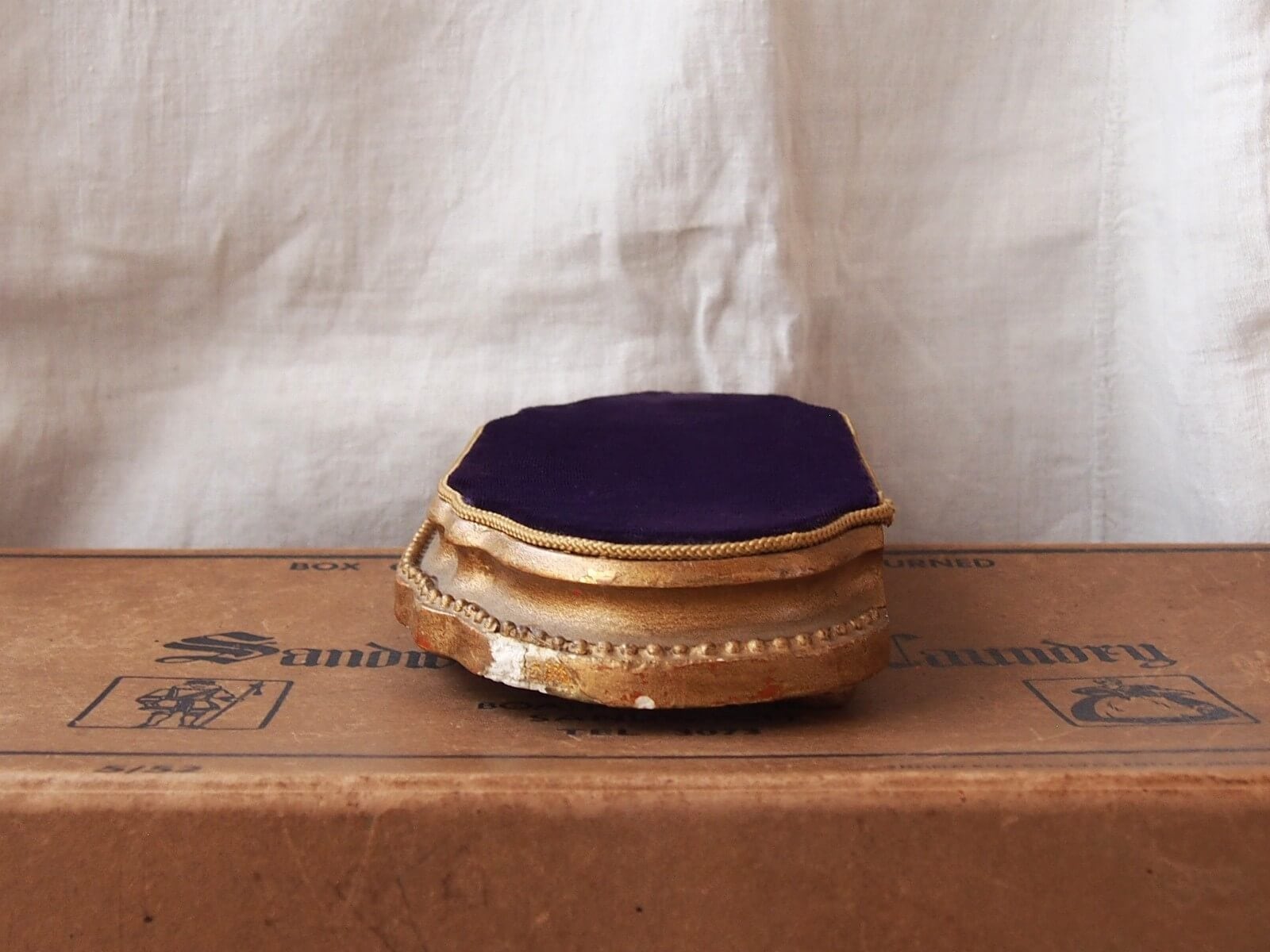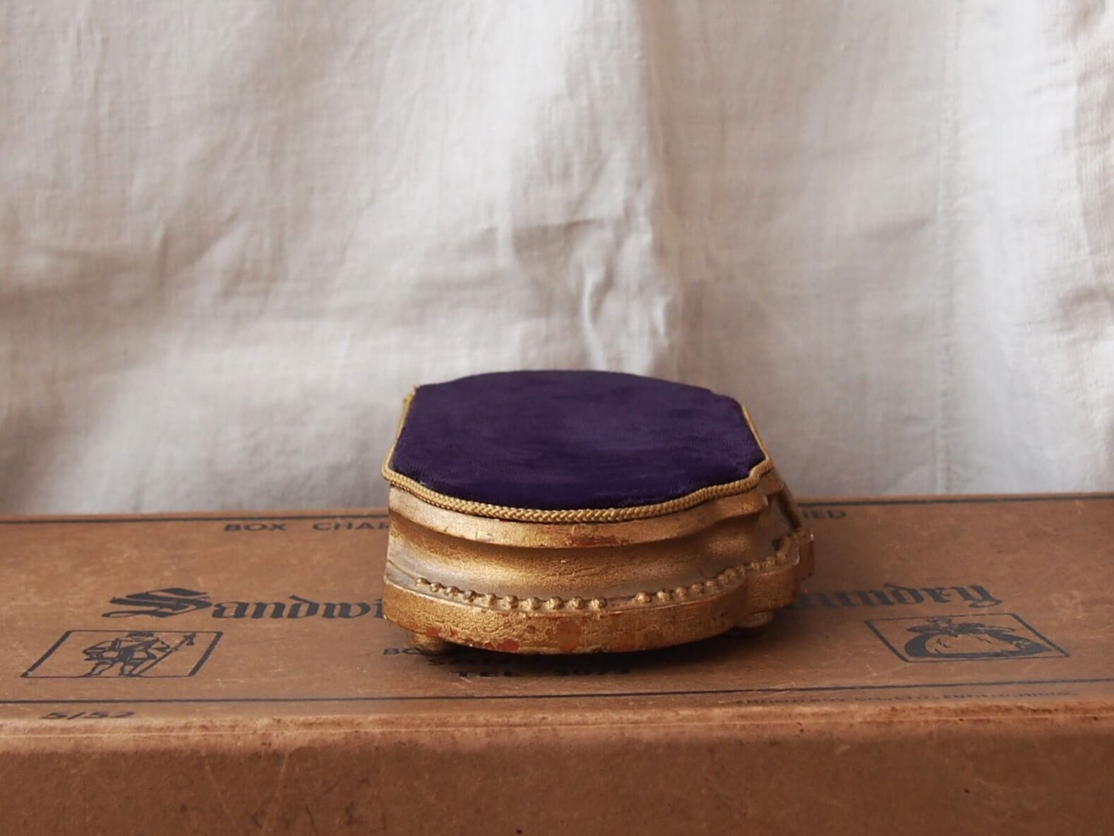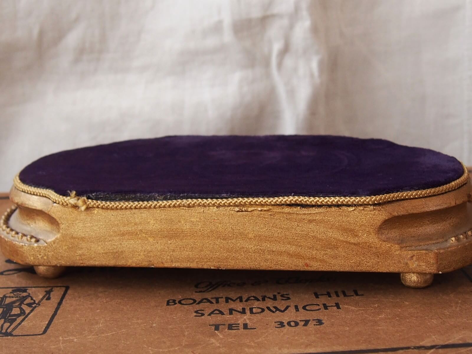 アクセサリーなどの展示に適している、推定1900年代頃のフランス製ディスプレイ台です。クラシックな装飾性と落ち着いた上質感を兼ね備えたデザインが魅力です。天面には深みのある紫色のベルベット生地が張られており、柔らかな光沢が上品な印象を与えます。ジュエリーや小物などを置いたときに美しく引き立てる背景となり、特別感のあるディスプレイを演出します。年代からくる汚れやキズ・欠け・塗装の剥がれなどは多少見られます。