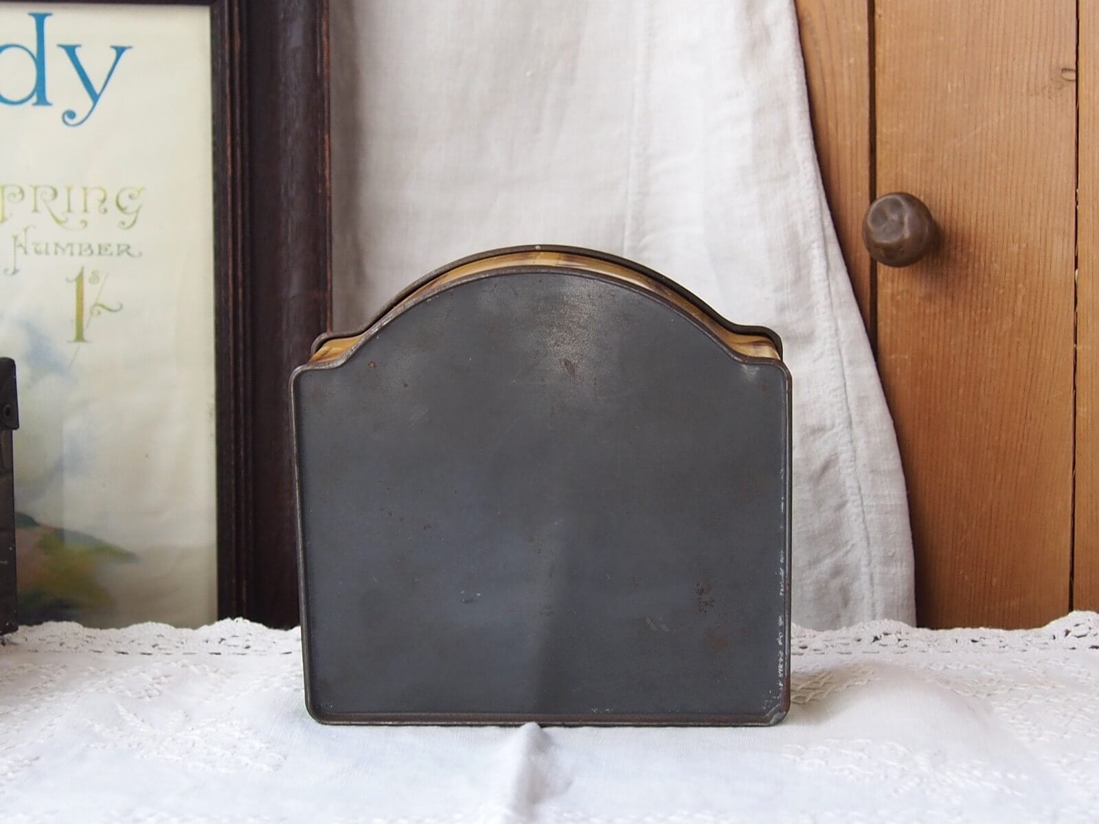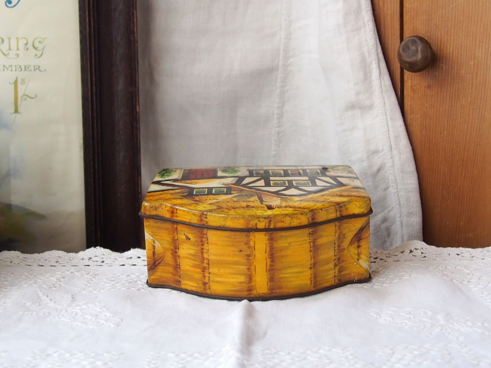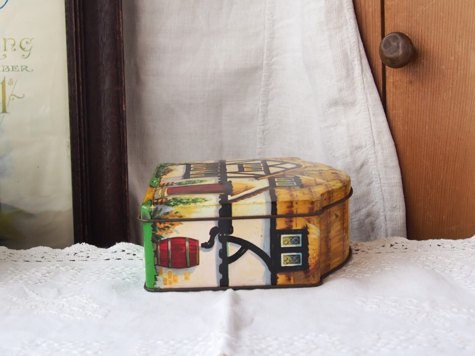 推定1950年代・イギリス・TUCKERS OF TOTNES。茅葺き屋根のコテージが描かれたトフィー缶。まるで物語の中から飛び出してきたような温かみのあるデザインが魅力です。ディスプレイに最適なのはもちろん、小物入れとしてもお使いいただけます。年代からくる汚れや細かいキズ・軽い凹凸・小さなさびなどは見られますが、大きなダメージはありません。