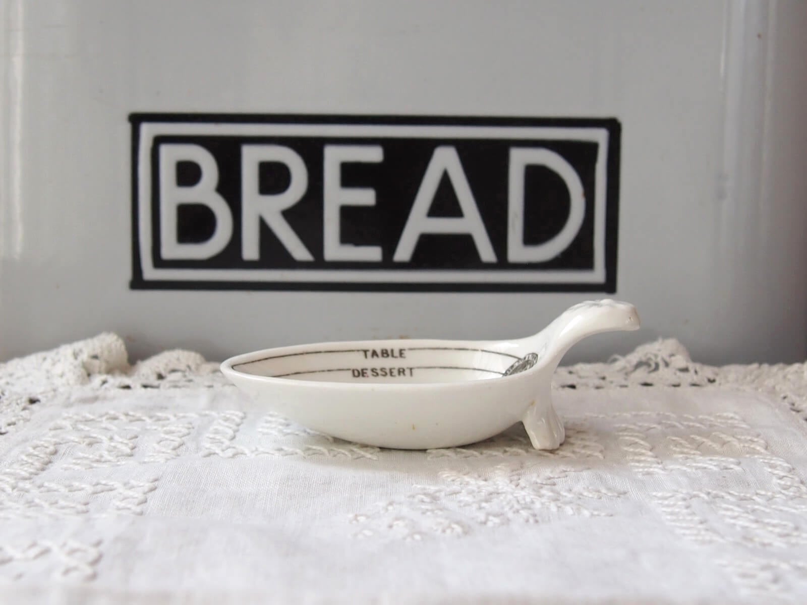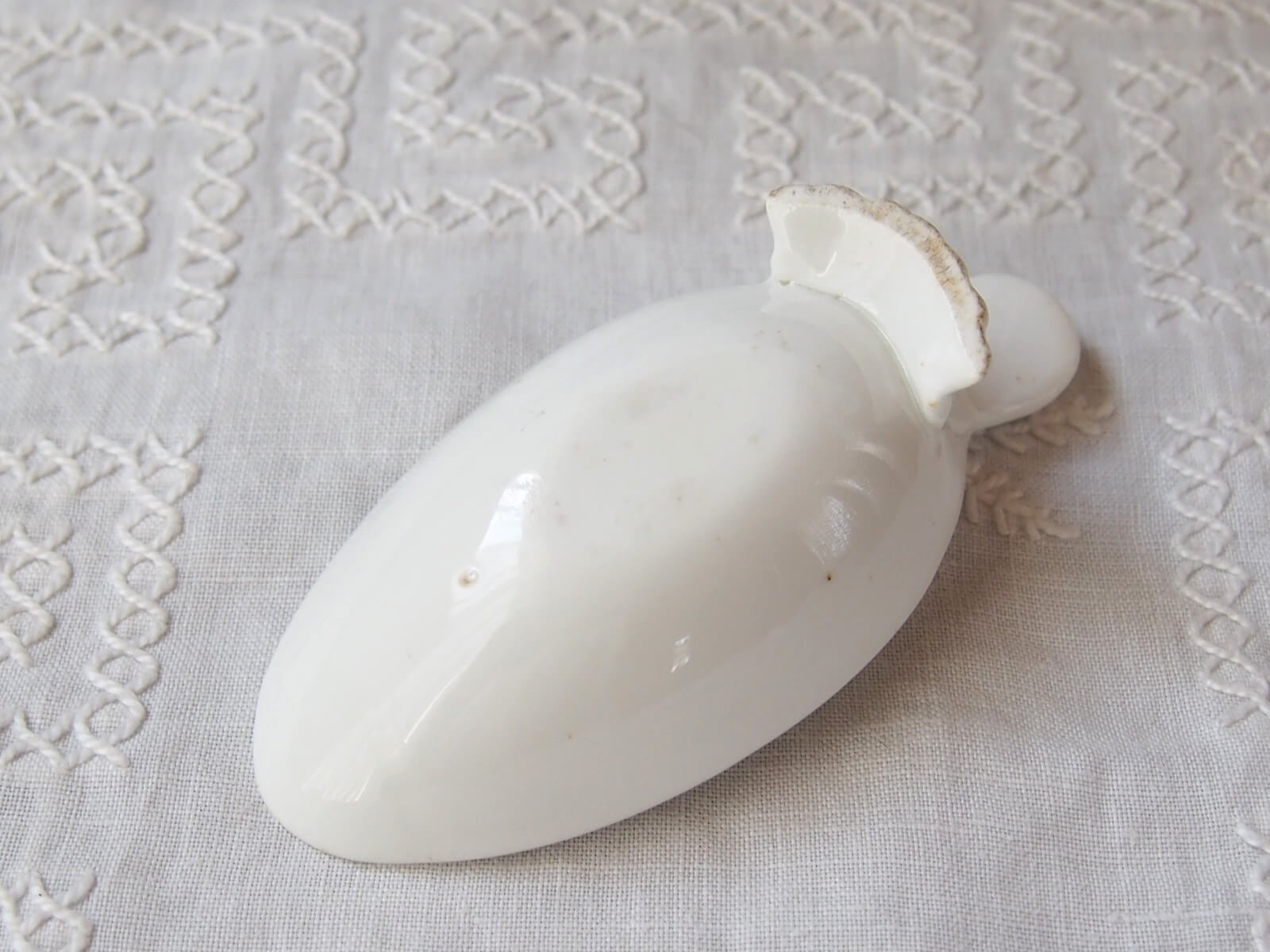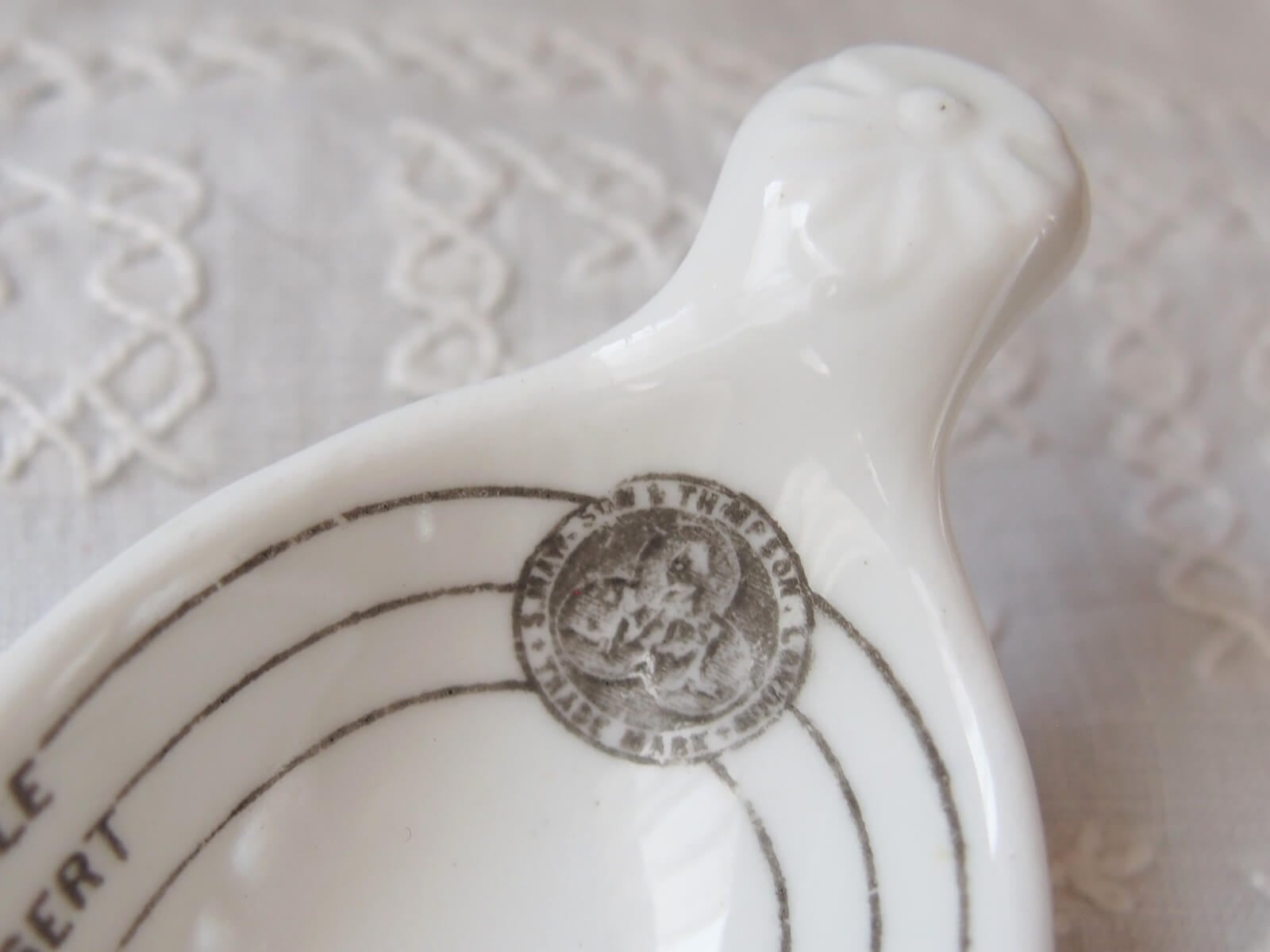 推定1880~1910年代頃・イギリス・S.Maw&Sons。TABLE・DESSERT・TEAの計量ラインが描かれている陶器製メジャースプーン。やわらかな白を基調とした陶器の質感に、繊細なラインと控えめなロゴが美しく映える一品です。小ぶりなサイズ感ながら、空間にやさしい温もりと洗練された雰囲気をもたらしてくれます。。年代からくる汚れやキズ・シミなどは見られますが、目立ったダメージはありません。