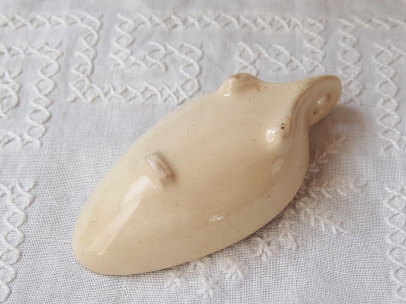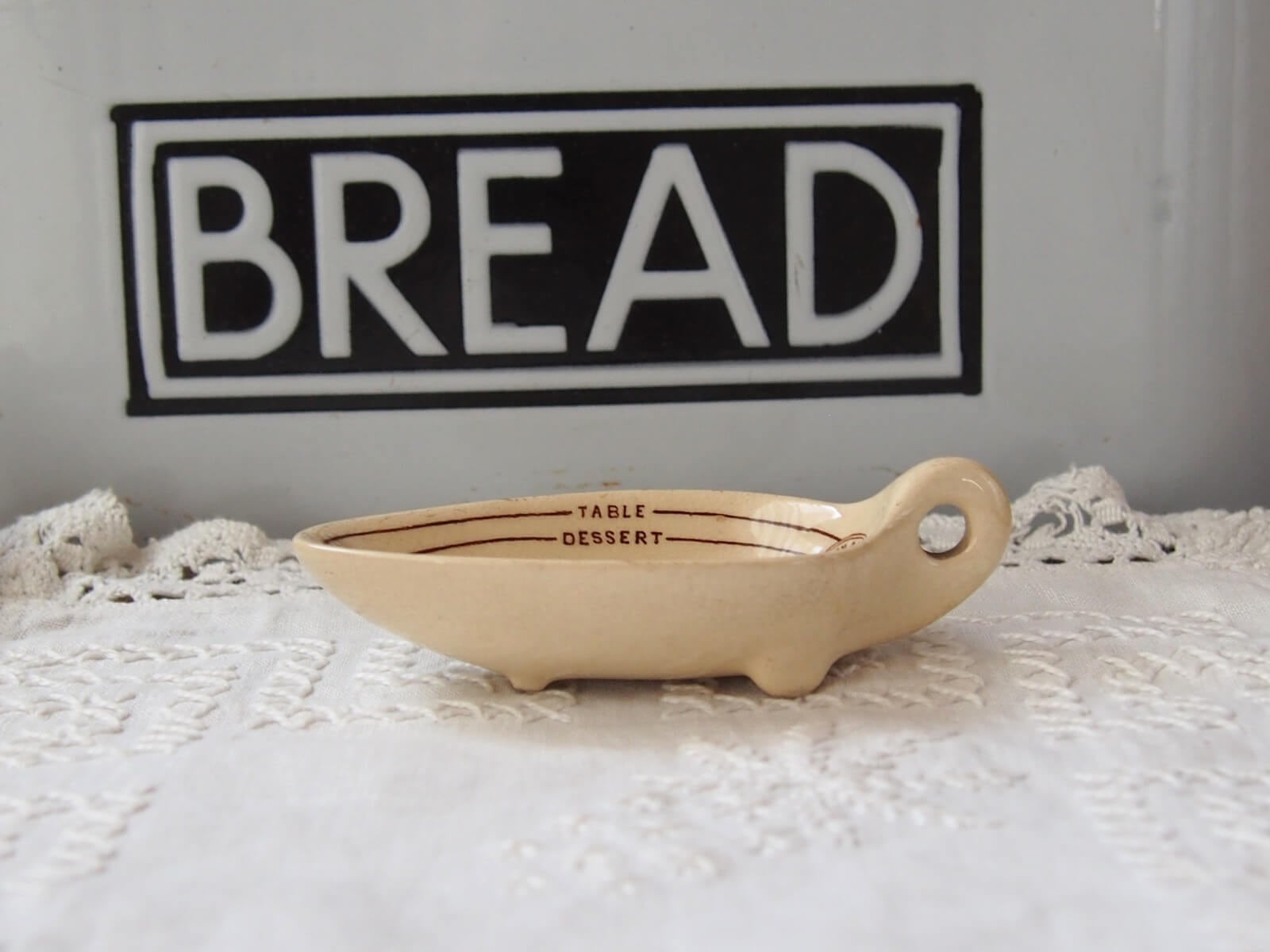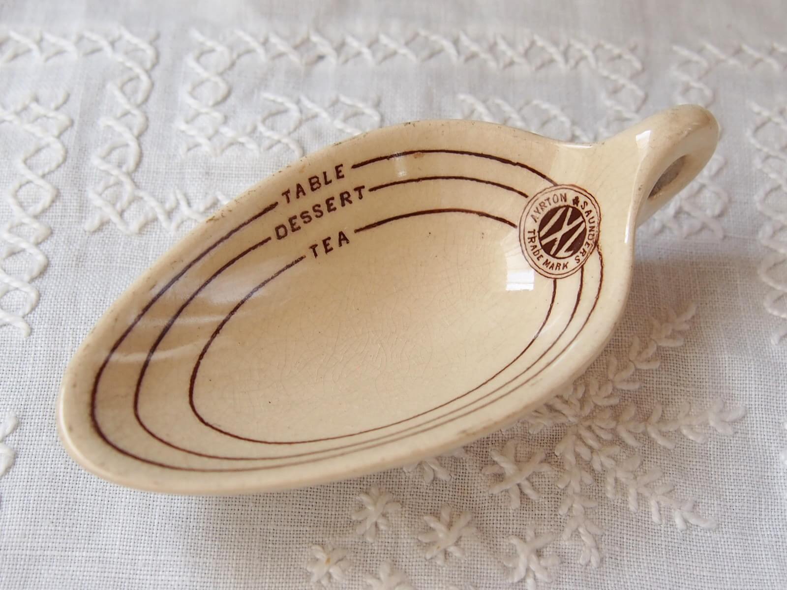 推定1880~1910年代頃・イギリス・AYRTON&SAUNDERS・IXLの刻印。TABLE・DESSERT・TEAの計量ラインが描かれている陶器製メジャースプーン。クリーム色の釉薬をかけた淡く温かみのある色合いが特徴です。小ぶりなサイズ感ながら、空間にやさしい温もりと洗練された雰囲気をもたらしてくれます。。年代からくる汚れやキズ・シミ・貫入などは見られますが、目立ったダメージはありません。