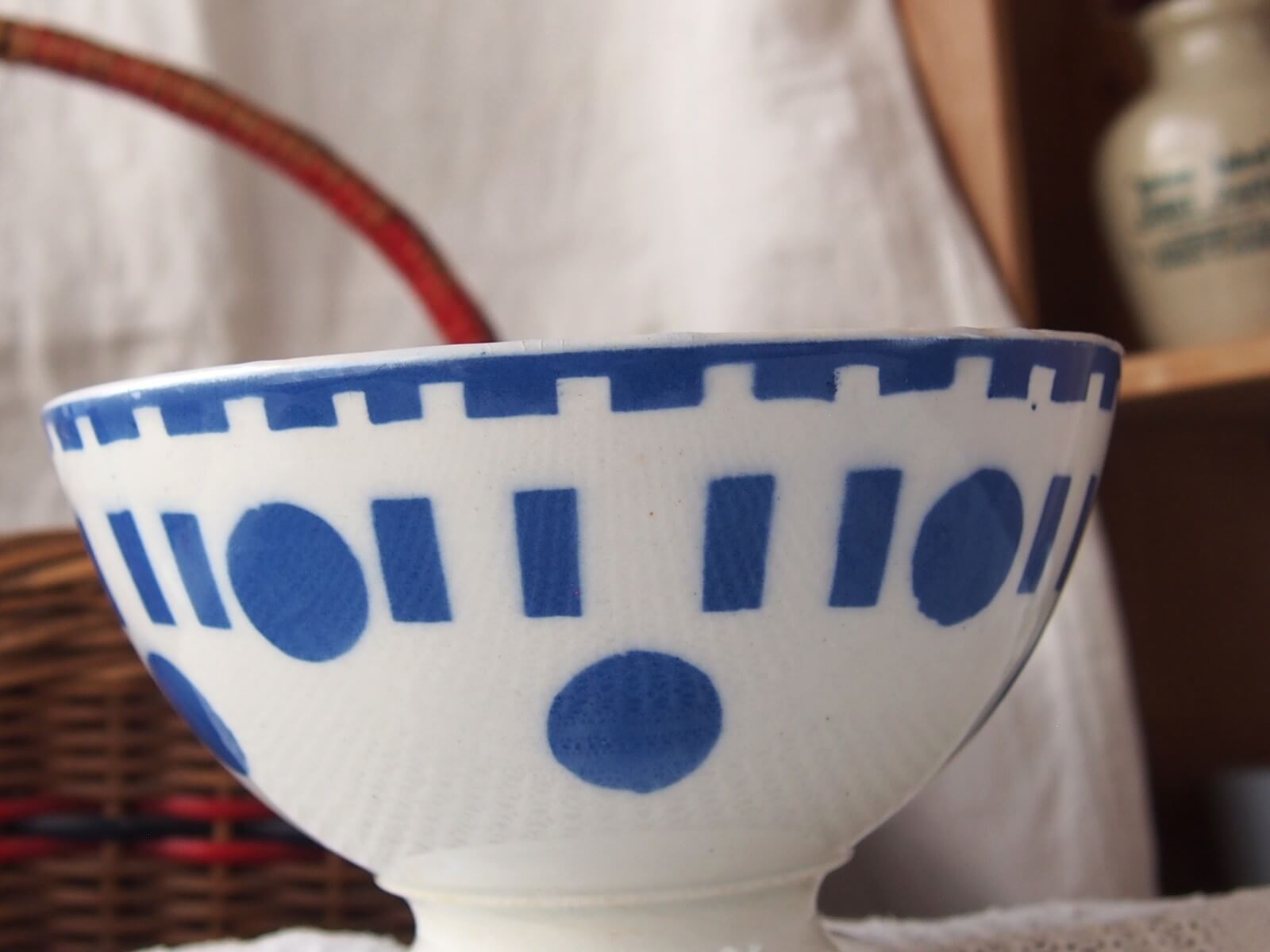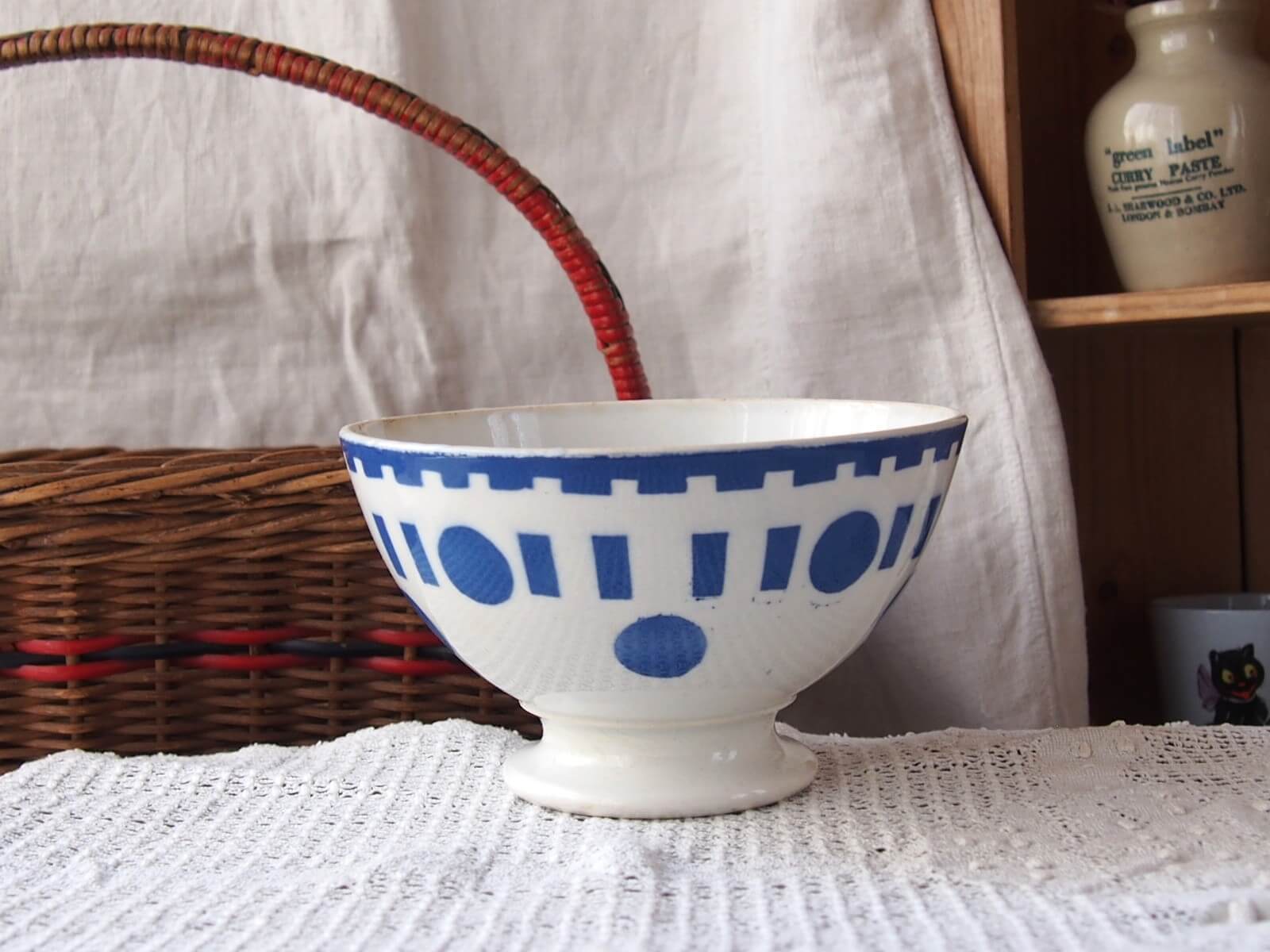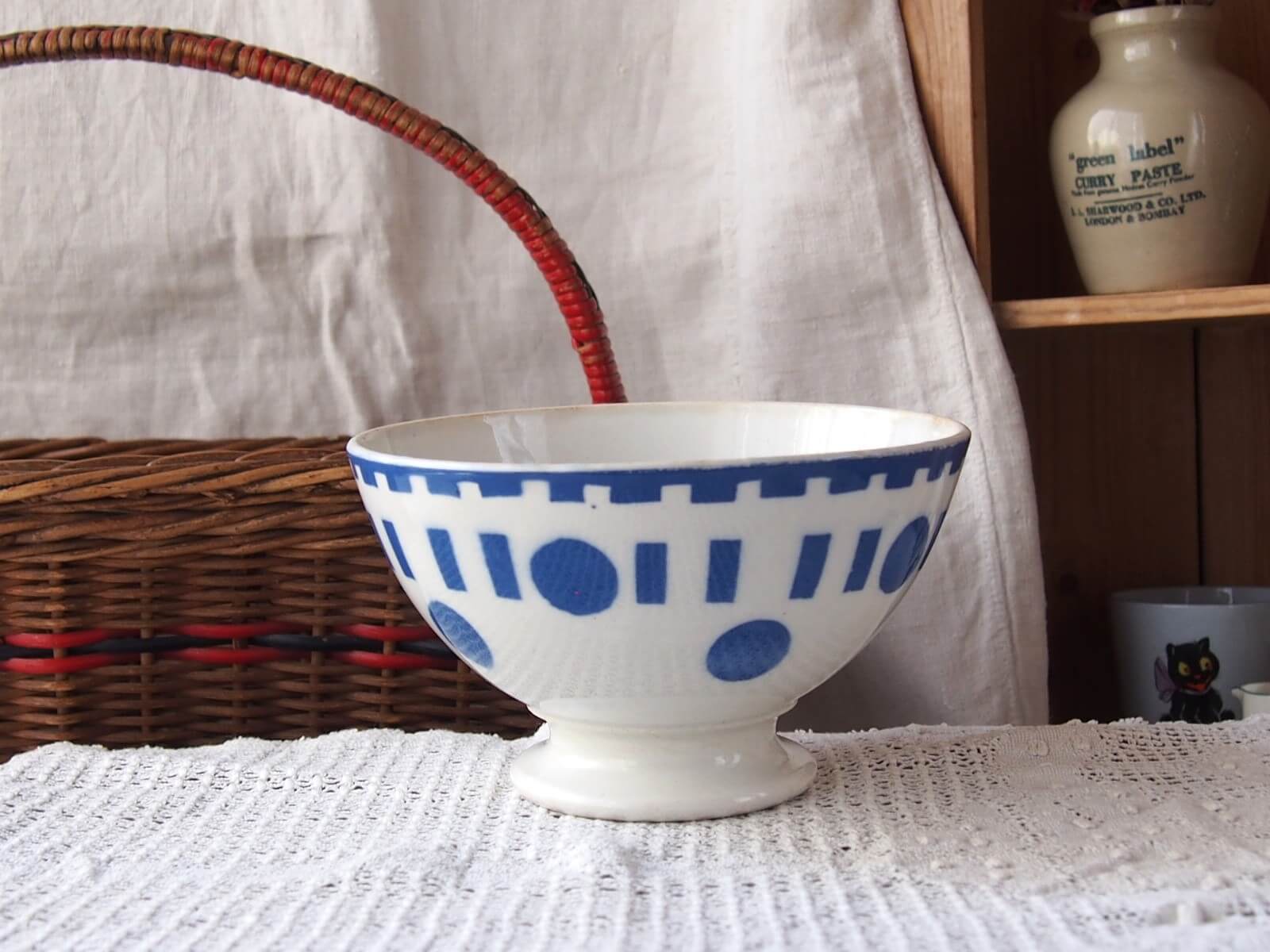 推定1880~1930年代。フランス・ジアン(Gien)。白地に鮮やかなブルーが映える、どこか懐かしさを感じさせるカフェオレボウル。リズミカルに並ぶドットとラインの模様が軽やかなアクセントを添え、シンプルでありながらさりげない個性を感じさせます。 年代からくる汚れや細かいキズ・シミ・軽いヒビ・貫入・極小のチップなどは見られますが、大きなダメージはありません。