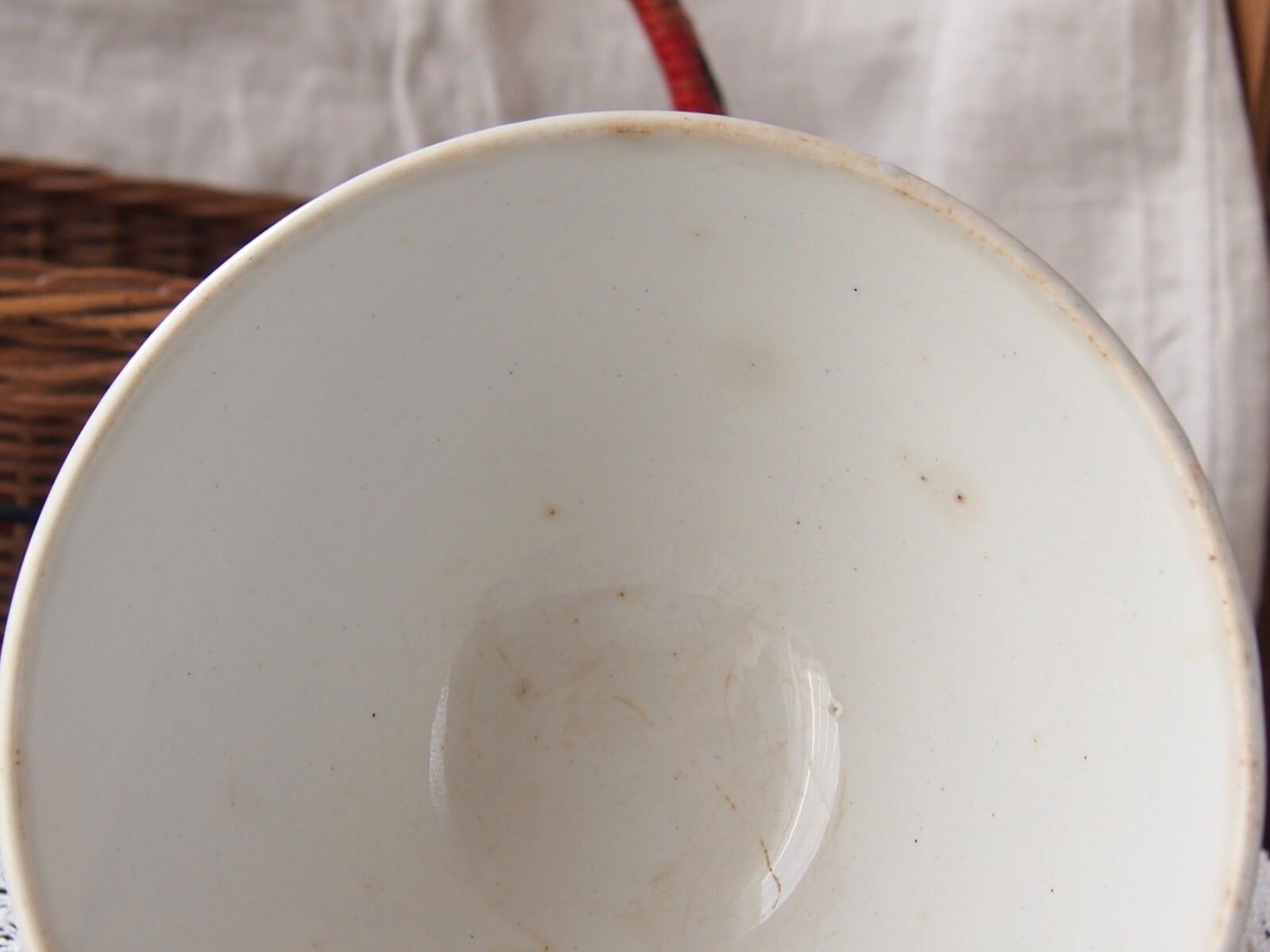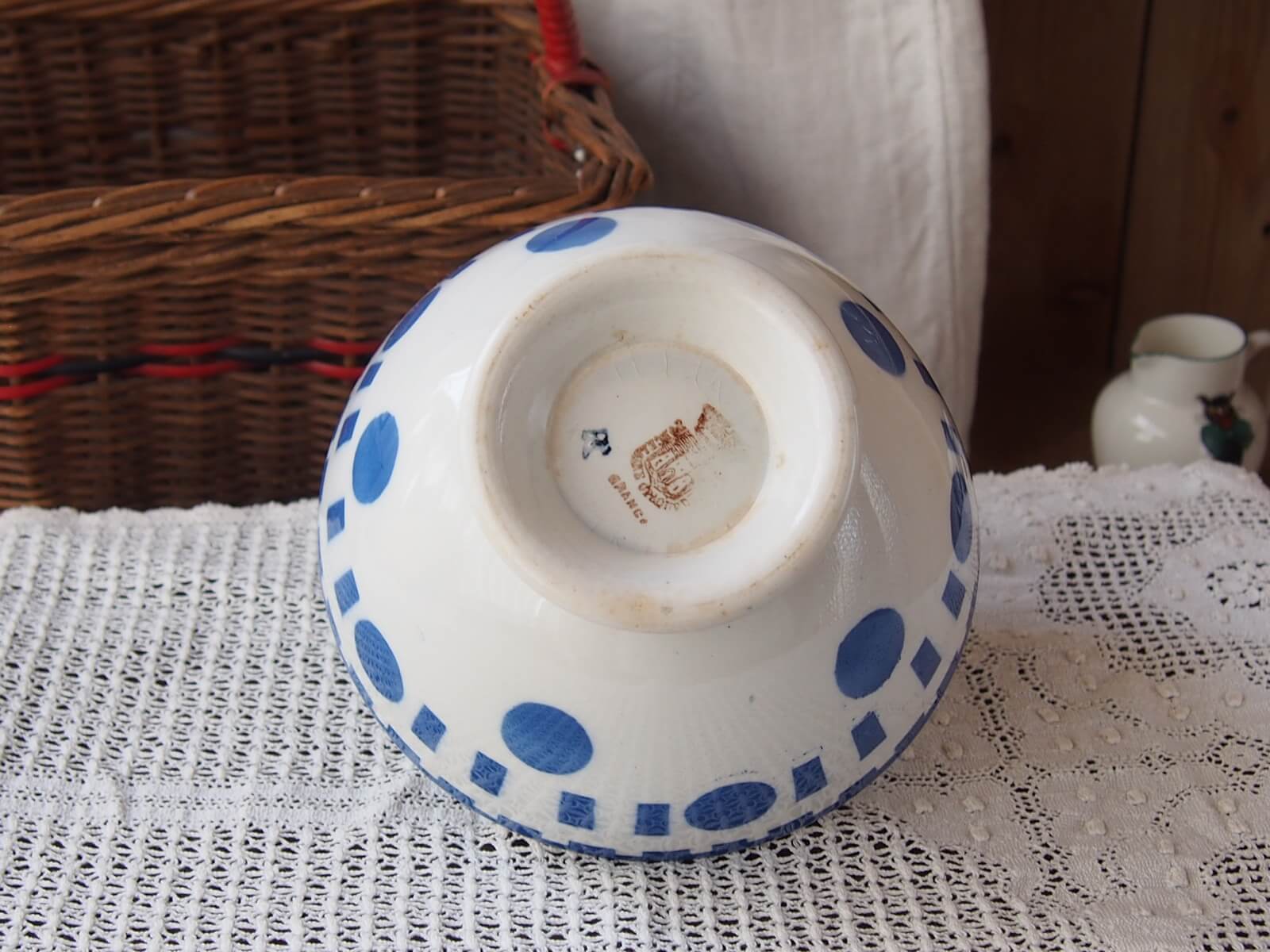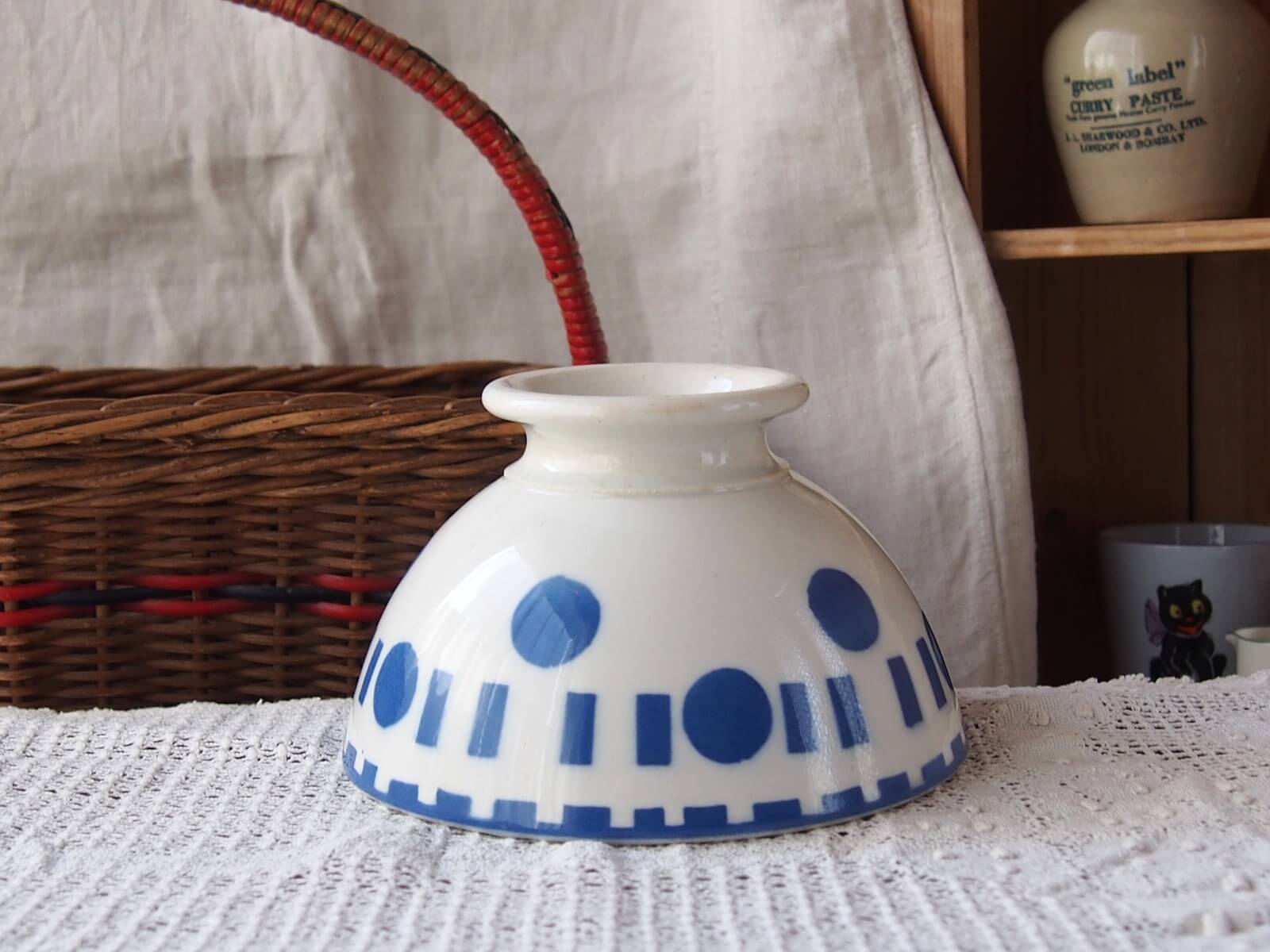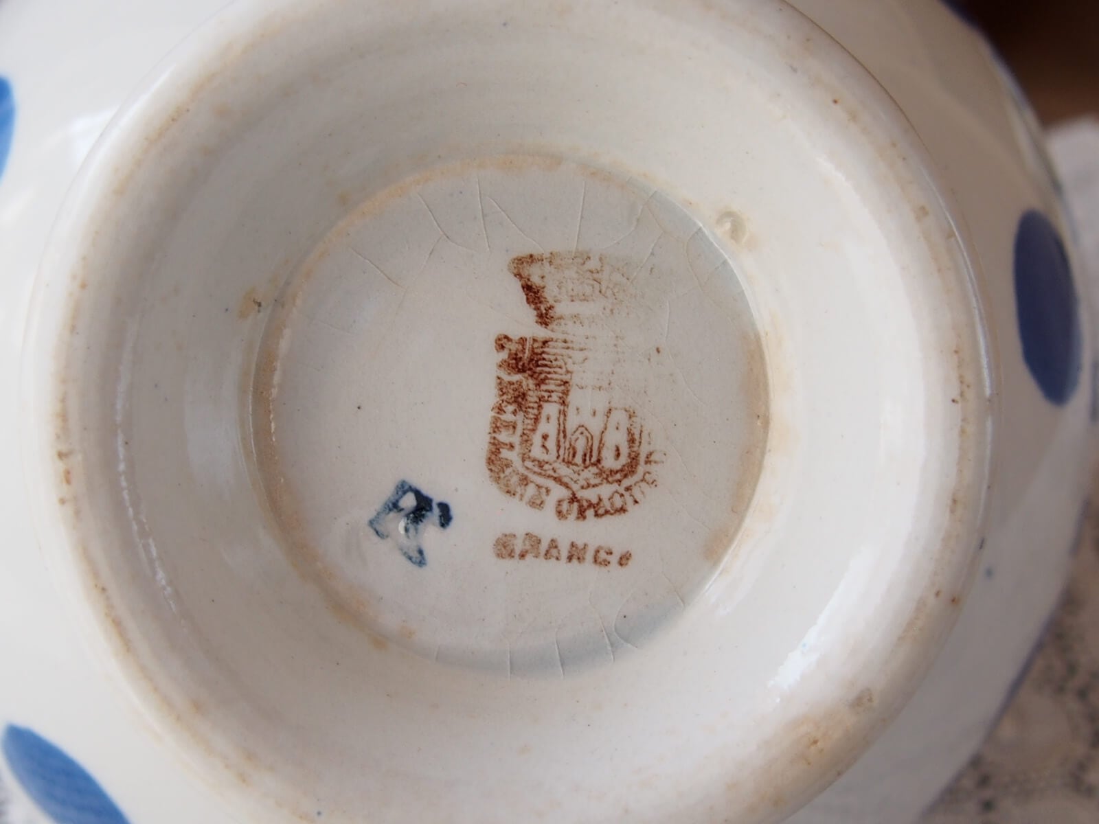 推定1880~1930年代。フランス・ジアン(Gien)。白地に鮮やかなブルーが映える、どこか懐かしさを感じさせるカフェオレボウル。リズミカルに並ぶドットとラインの模様が軽やかなアクセントを添え、シンプルでありながらさりげない個性を感じさせます。 年代からくる汚れや細かいキズ・シミ・軽いヒビ・貫入・極小のチップなどは見られますが、大きなダメージはありません。