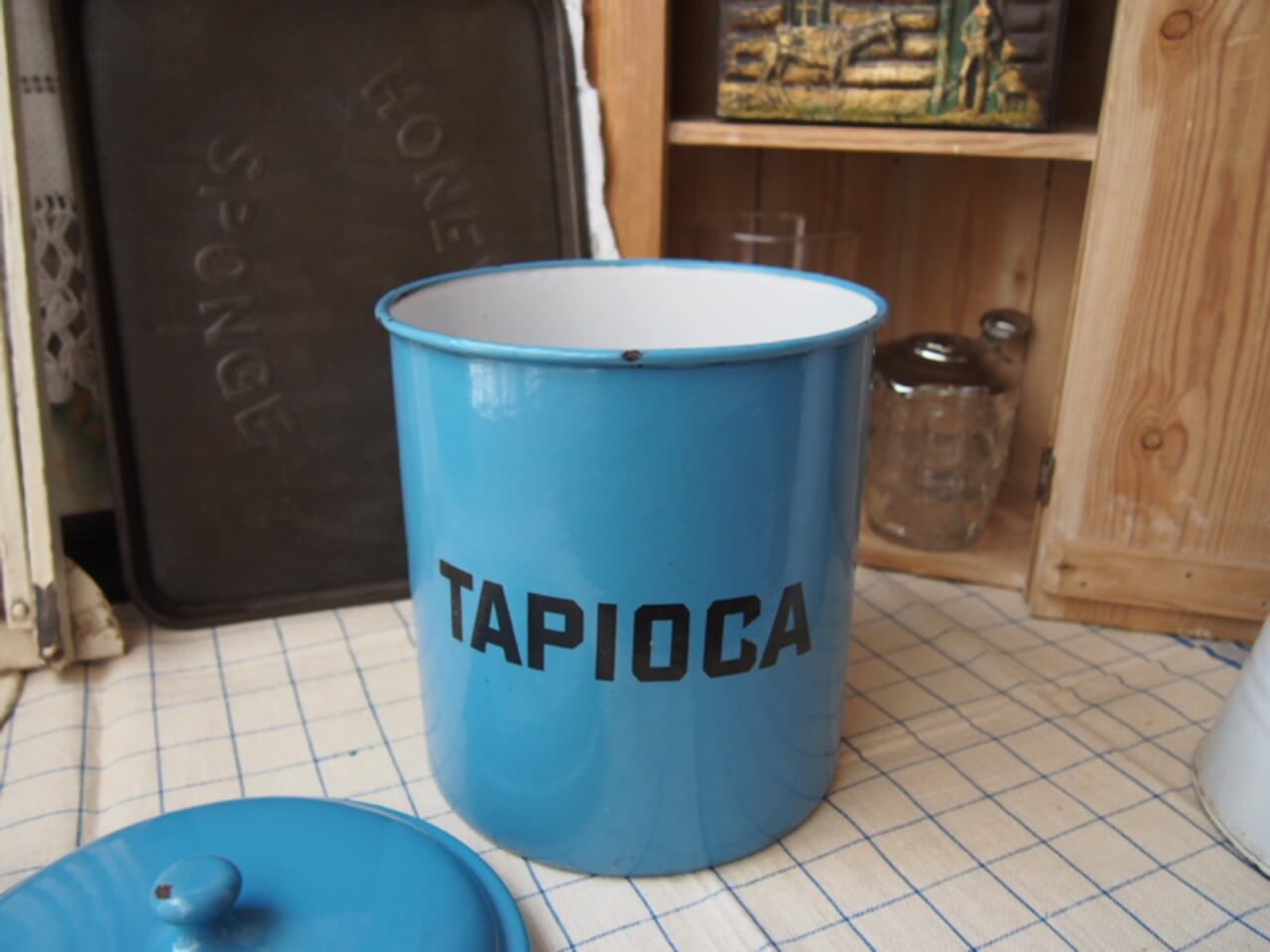 イギリス製のホウロウキャニスター(TAPIOCA)。ブルーにもいろいろなブルーがありますが、こちらはスタイリッシュなブルーでとても素敵です!このブルーシリーズは珍しく、あまり見かけません。ほうろうの欠けも少なく、とても良い状態です。