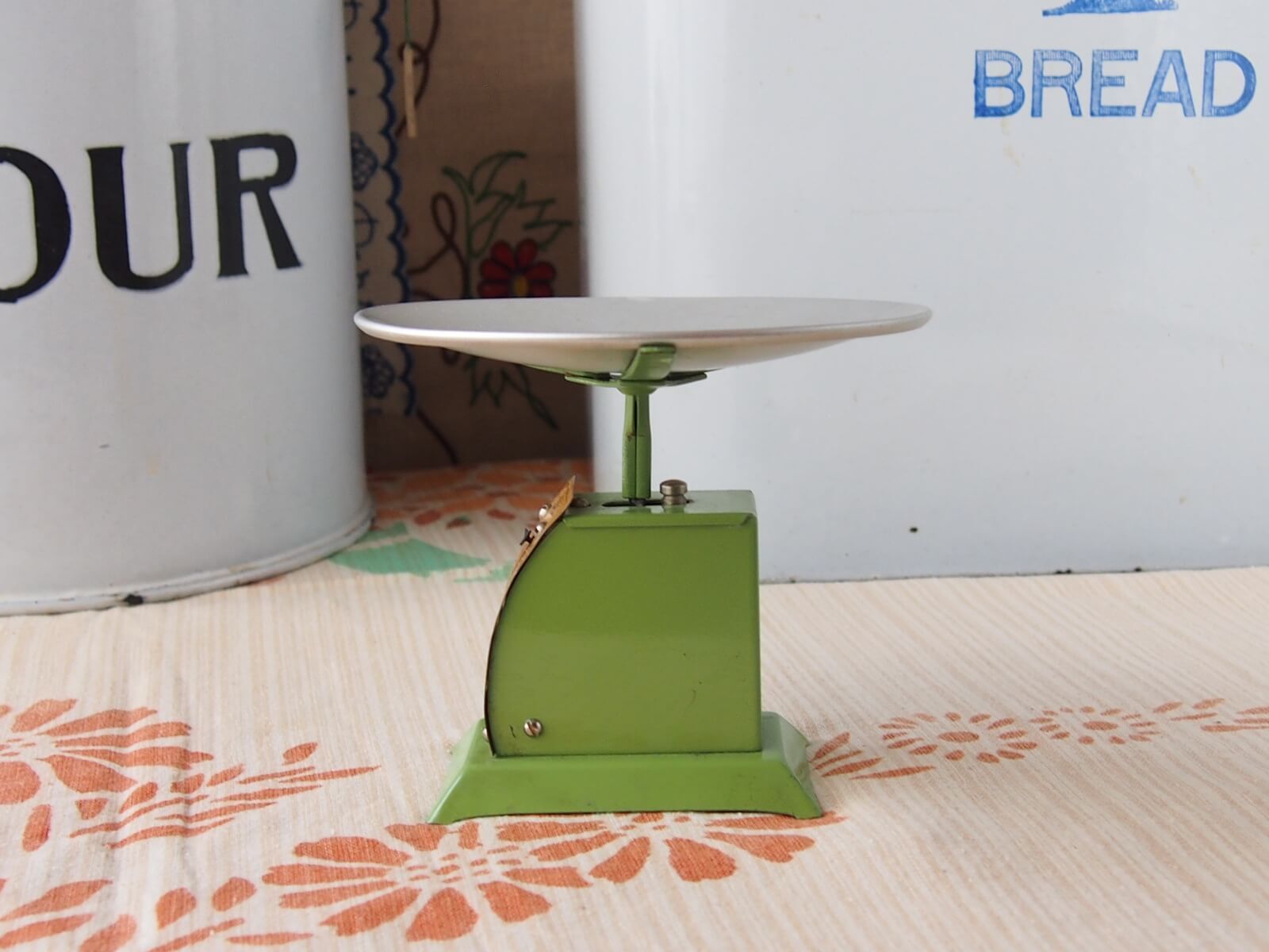 推定1930~50年代・イギリス・ソルター社製。ライトグリーンの色合いが素敵な小さめサイズのはかりです。こちらは砂糖やお塩などの調味料を量るダイエットスケールと呼ばれるもの。インテリアのディスプレイとしてもお勧めです♪ 調節ねじも動き、動作にも問題ありません。年代からくる汚れやシミ・細かいキズ・変色などは見られますが、目立ったダメージはなく良い状態です。箱も残っていますが傷みがあります。