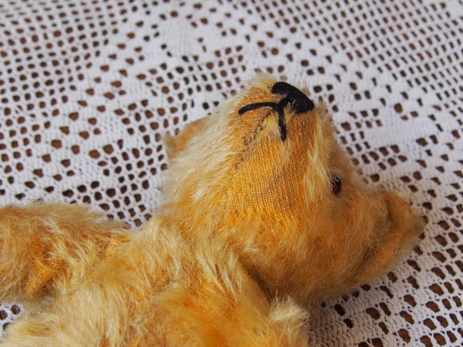 推定1930~40年代・イギリス。可愛らしい洋服を着たクマさん。洋服は前のオーナーさんが着させてあげた物です。とても愛されていたようで、時と温かみを感じます♪ 何とも言えない可愛らしいサイズ感で、お顔・胴体のバランスも良いと思います。目はガラス・詰め物は木毛・首手足は動きません。 支えるものがないと立ちません(自立しません)。年代からくる汚れや毛の摩耗などは見られますが、大きなダメージはなく良い状態です。