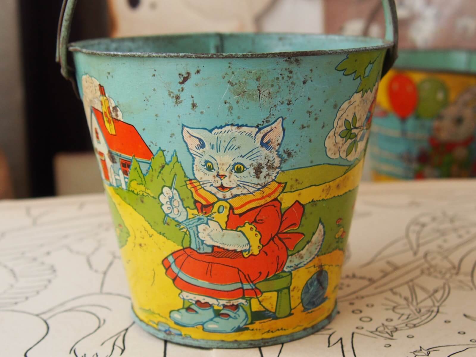 推定1940~50年代・アメリカ・J Chein&Co。1930~60年代頃までポパイやディズニーキャラクターなどを含む、子供たちに人気の様々な玩具を生産していた会社です。こちらは洋服を着たネコたちが描かれた可愛らしい絵柄です。子供が砂浜や砂場などで遊ぶ際に使うブリキ製の砂バケツです。ハンドルも付いていて、小ぶりで可愛らしいサイズです。ノスタルジックなお品です。バケツにはJ CHEIN&CO MADE IN USAのロゴマークが入っています。年代からくる汚れやキズ・さび・凹凸・変色などが見られます。