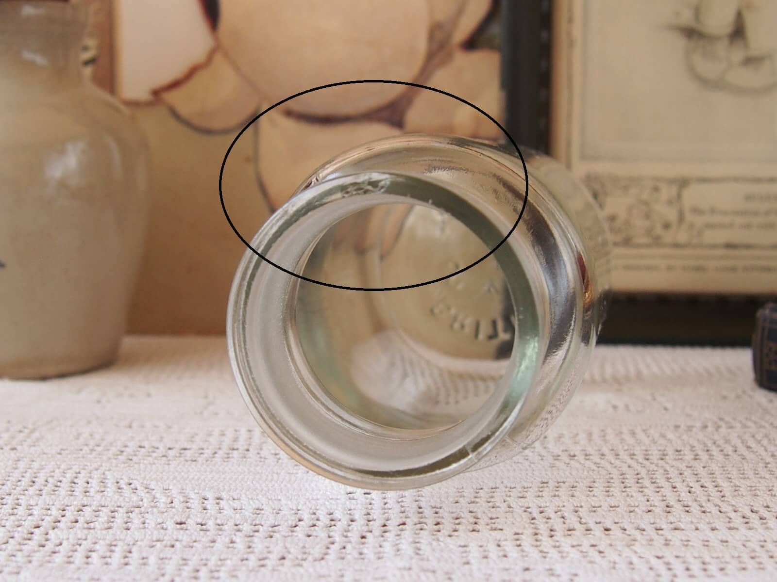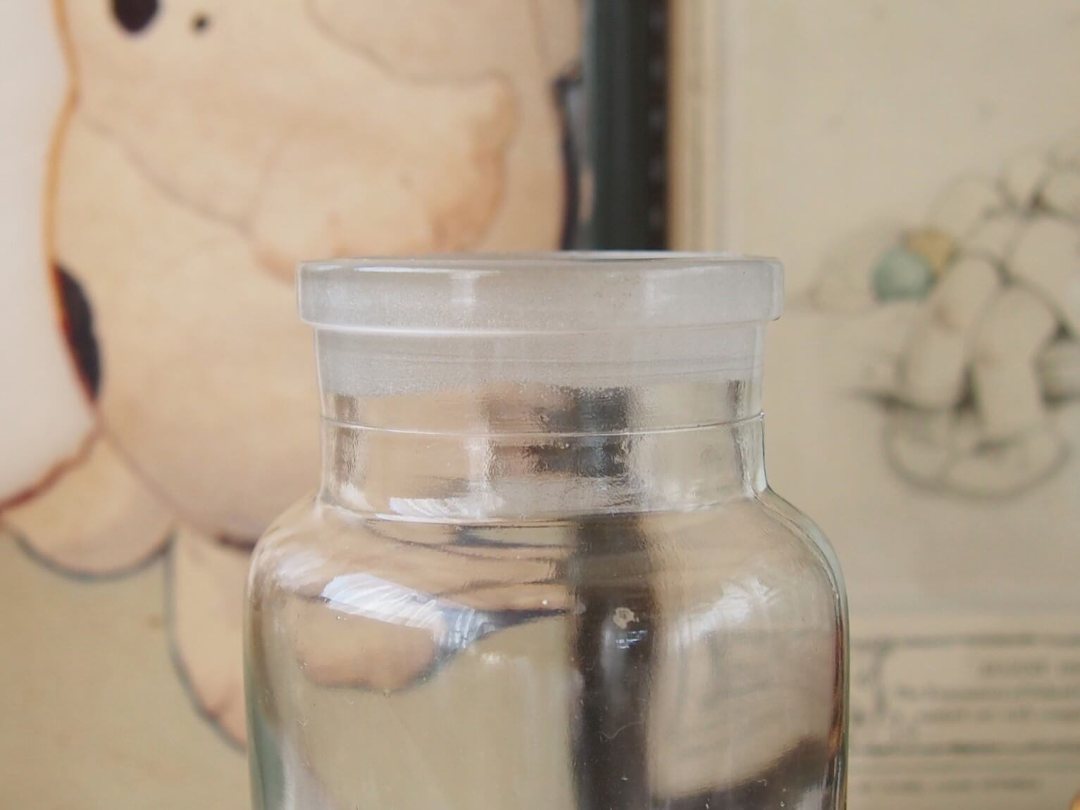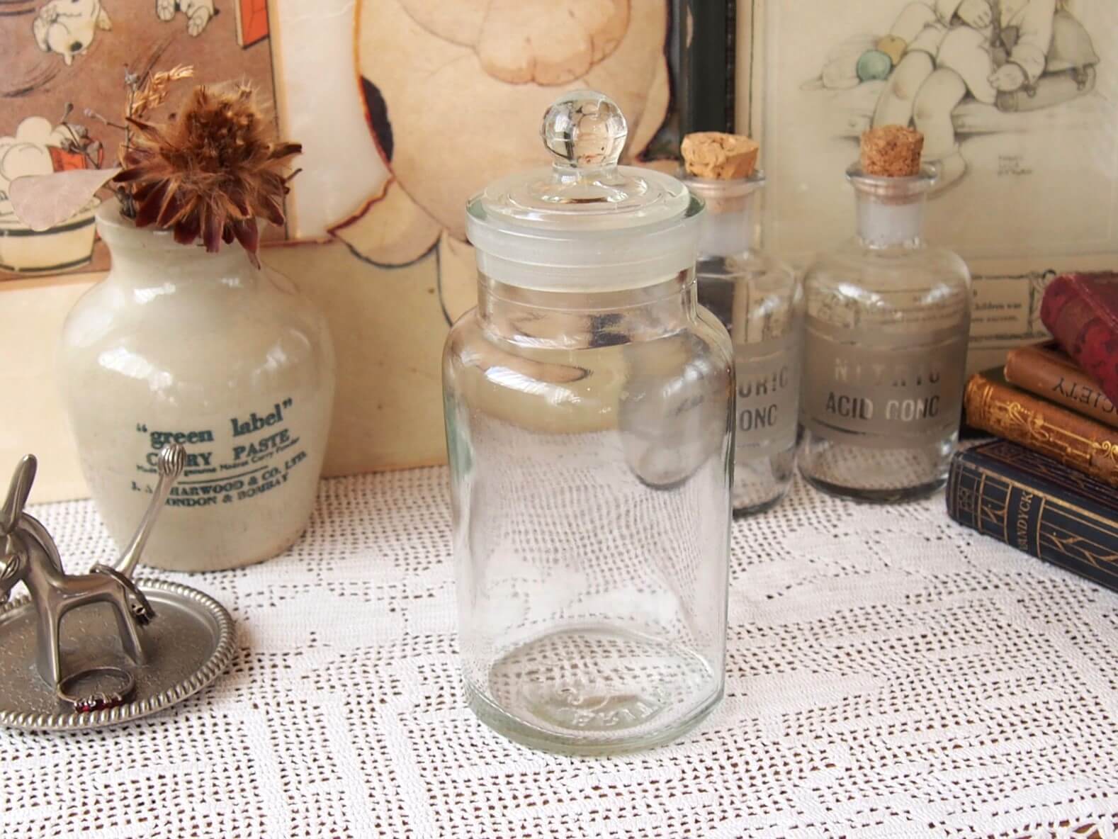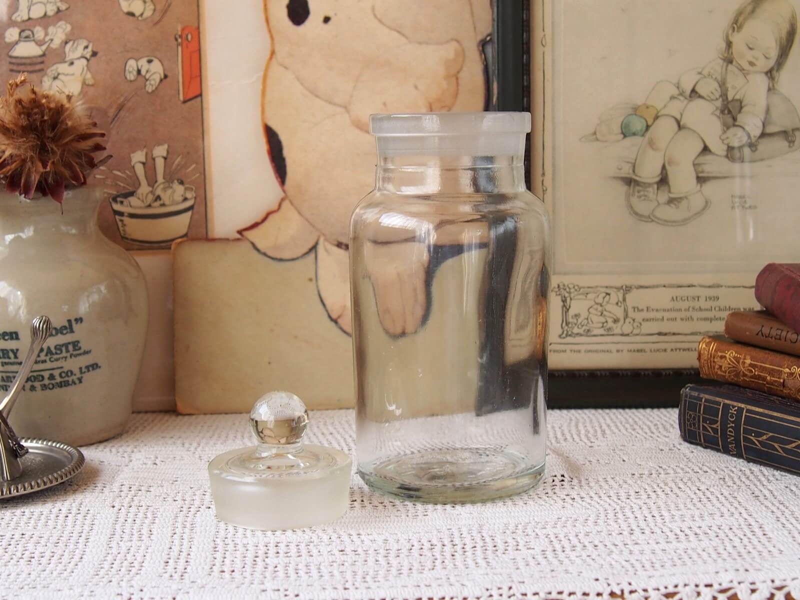 シンプルながら、ディスプレイにも向いているイギリス製薬瓶(Apothecary jar)。蓋と本体の接触部分がすりガラスになっています。底にはBRITISH MADEの文字が入っています。小さな欠けや細かいキズは見られますが、目立ったダメージはありません。画像でご確認下さい。。