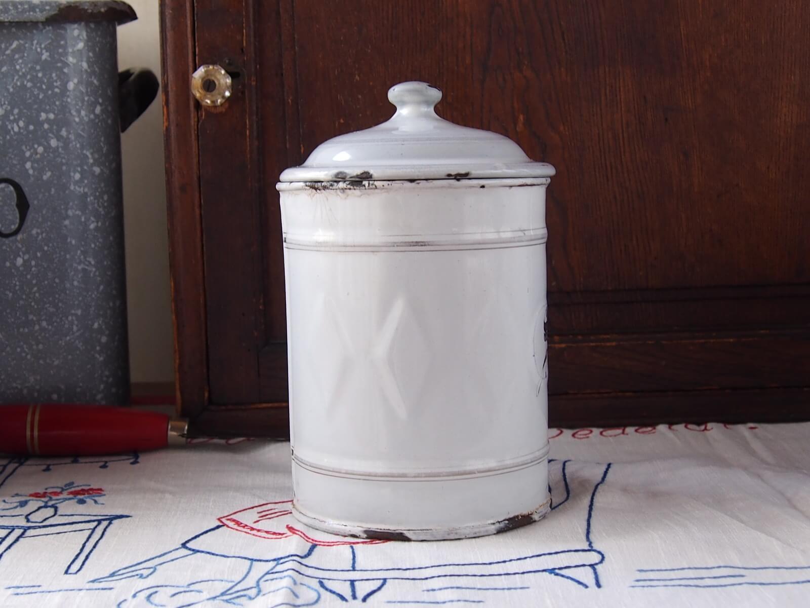 エレガントなスタイルが素敵なフランス製ホーローキャニスター(Sucre)です。ヴィンテージ感満載のデザインは、キッチンやリビングをおしゃれに演出してくれます。側面の菱形は少し浮き出ています。ゴールドのラインとロゴが少し薄くなっていますが、レトロな雰囲気がでています。年代からくる汚れやホーローの欠け・さび・色褪せなどは見られますが、大きなダメージはありません。