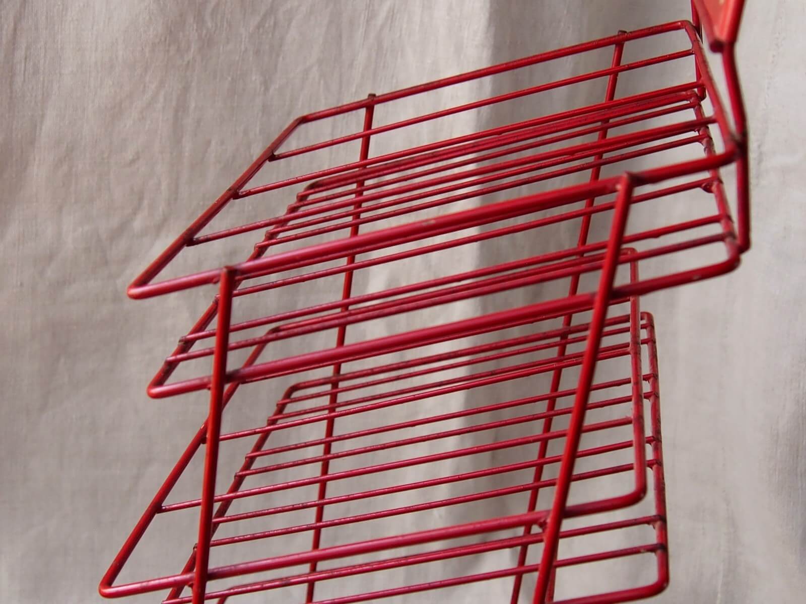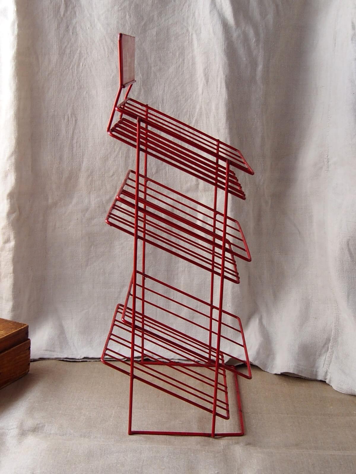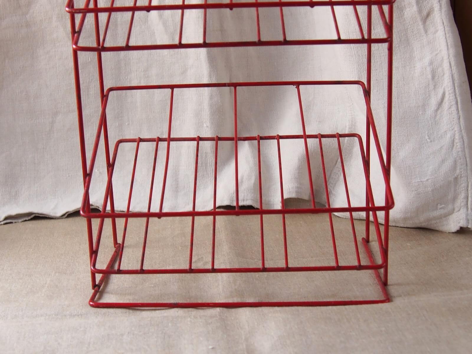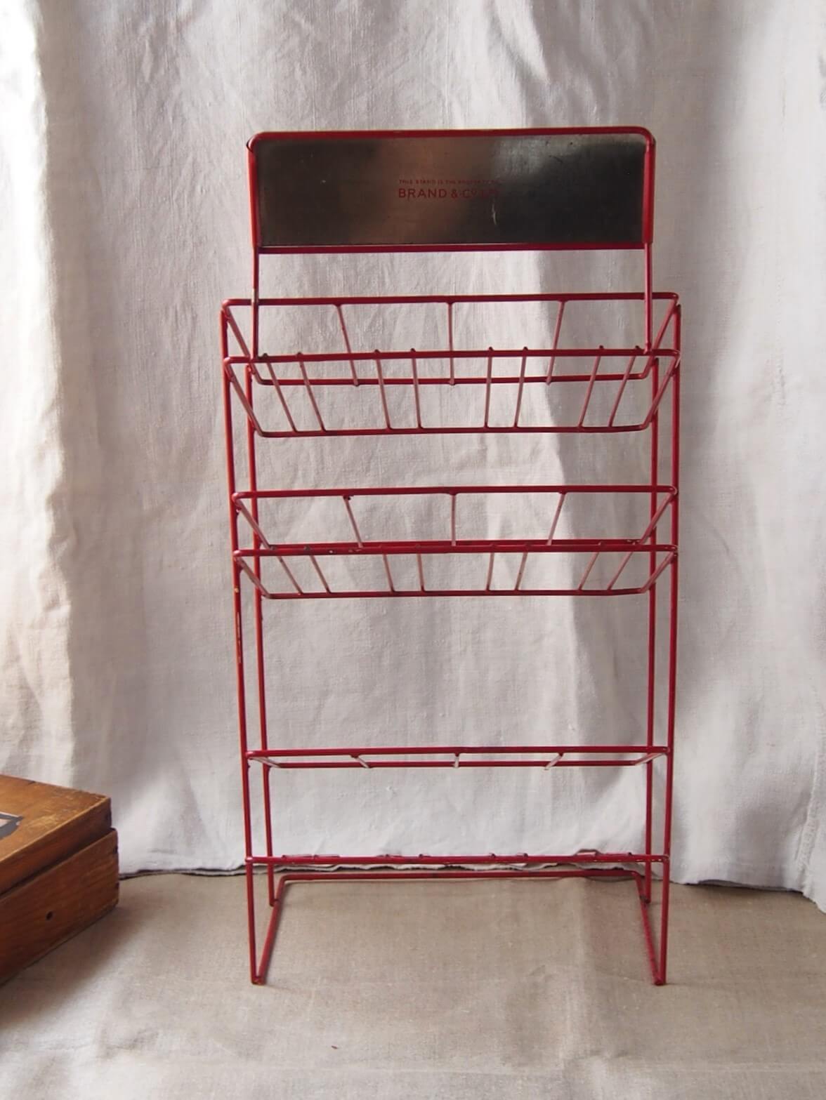 イギリス・BRAND&CO.LTD。コンパクトでとても可愛らしいワイヤーディスプレイラック。お店で使われていたようですが、残念ながら何が飾られていたラックか不明です。アイデア次第で様々な用途に使用出来ますね♪ 三段とも傾斜がついていて各四列に仕切られています。列の幅はすべて約4.7cm、深さは上から一段目二段目は約2.3cm三段目は約5cm。年代からくる汚れやキズ・小さなさび・軽い歪みなどは見られますが、目立ったダメージはありません。