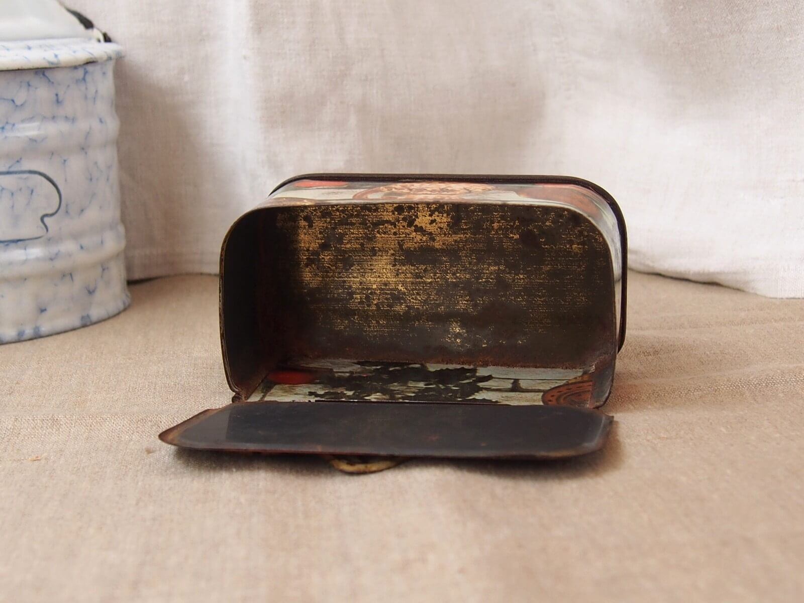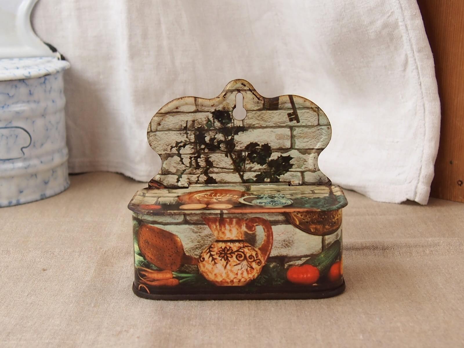 フランス。壁に掛けることも出来る、ブリキ製のマッチボックス。古いティンならではの色合いや質感が味わい深いです。。レトロなデザインで可愛らしいサイズです。年代からくる汚れやキズ・さび・歪みなどは見られますが、大きなダメージはありません。